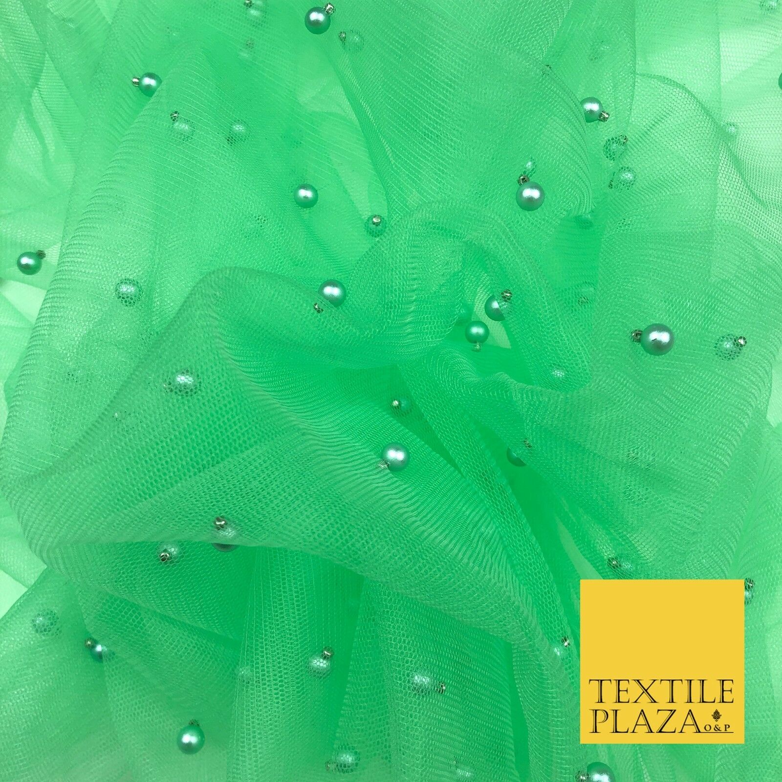 APPLE GREEN Studded Pearl Mesh Net Fabric Bridal Sheer Craft Dress N1099