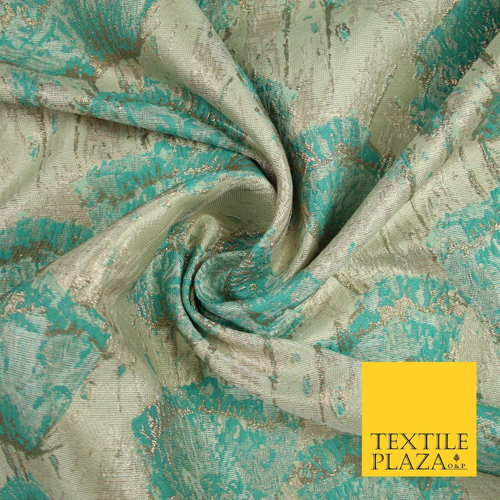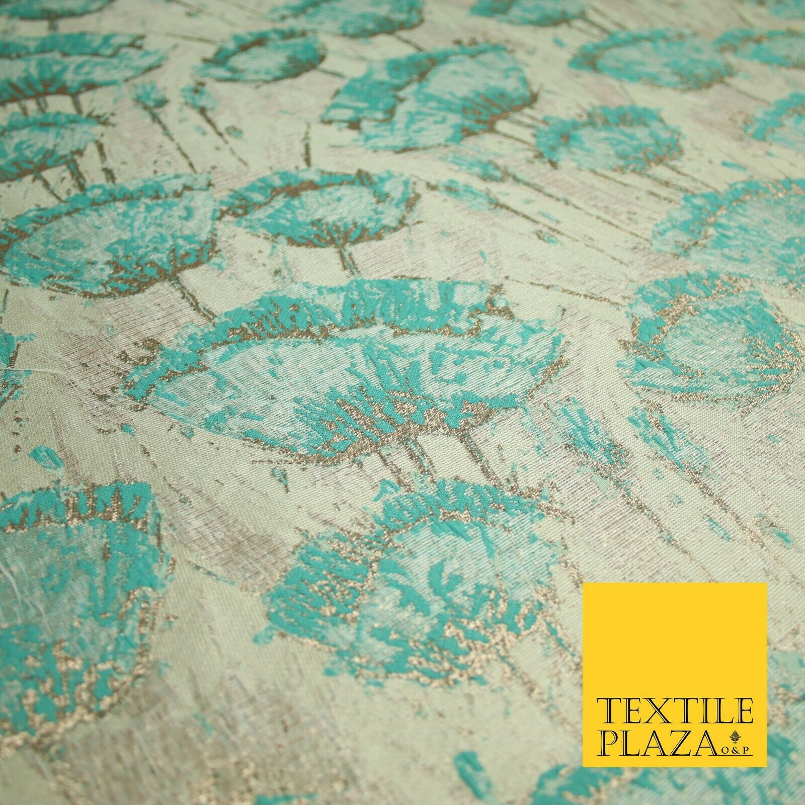 Aqua Champagne Gold Blooming Pansy Floral Metallic Textured Brocade Fabric 7123