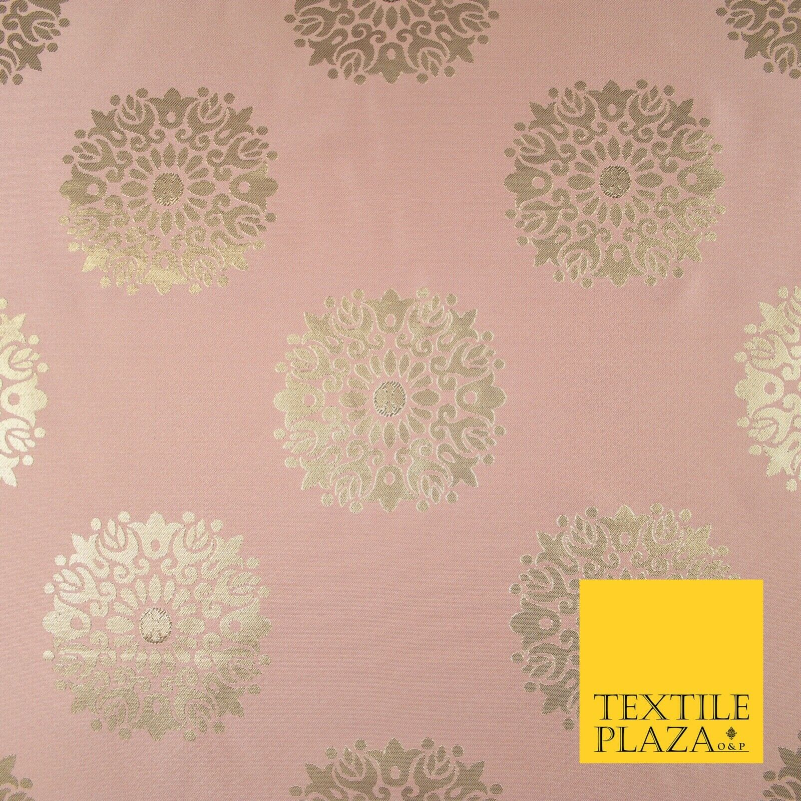 Baby Pink Metallic Gold Ornate Mandala Motif Textured Brocade Dress Fabric 7155