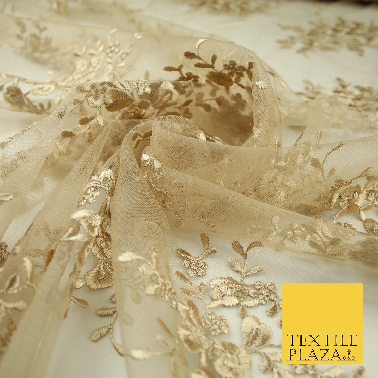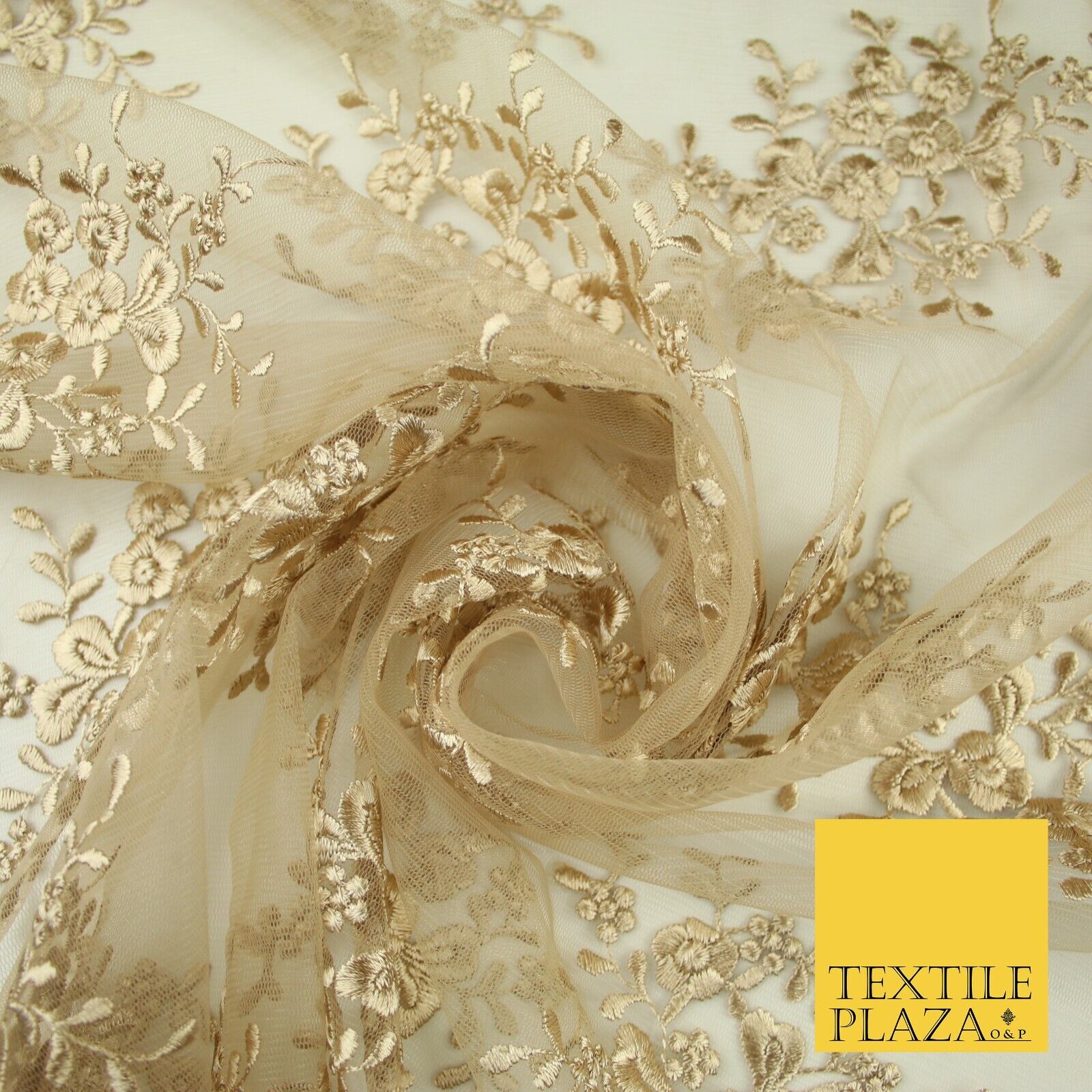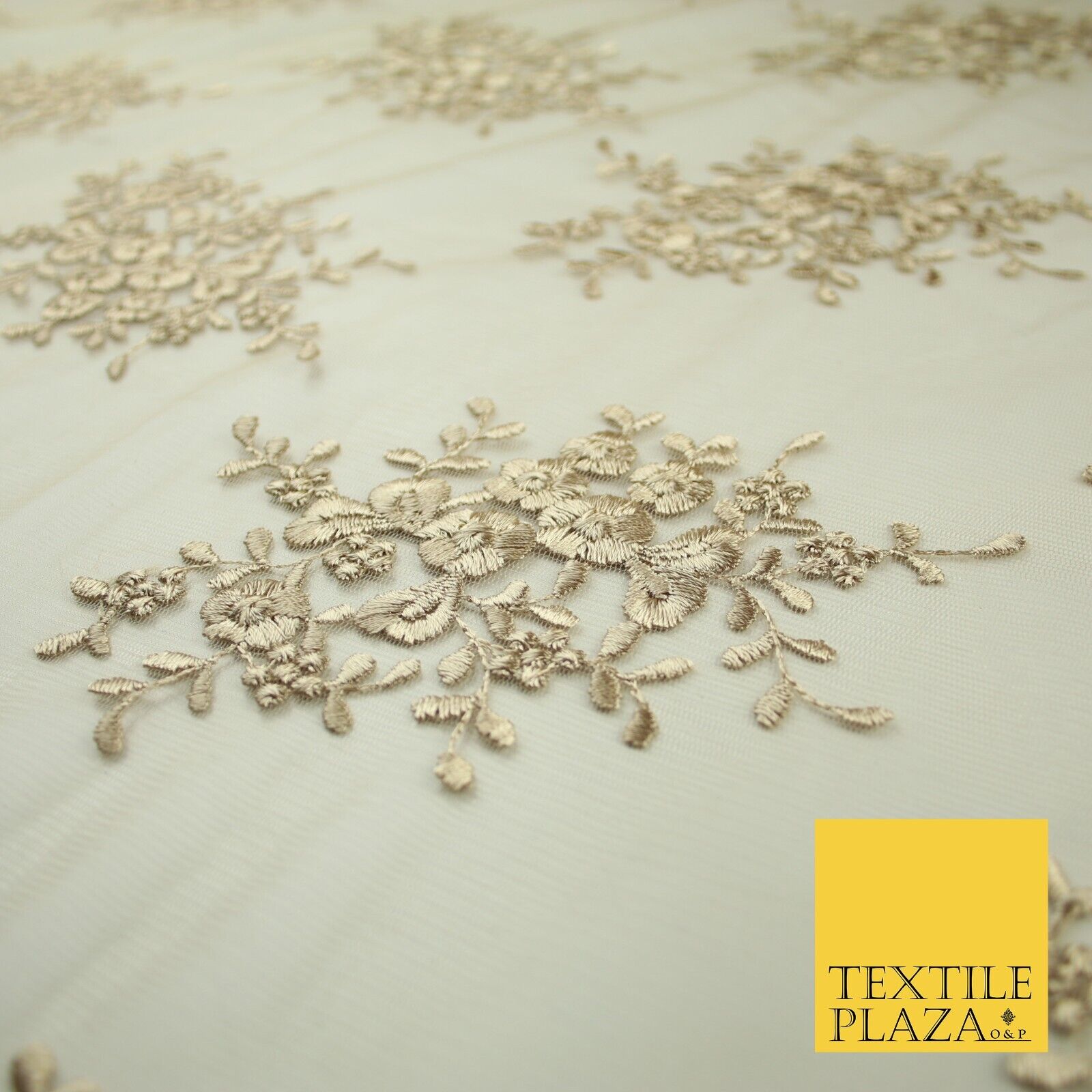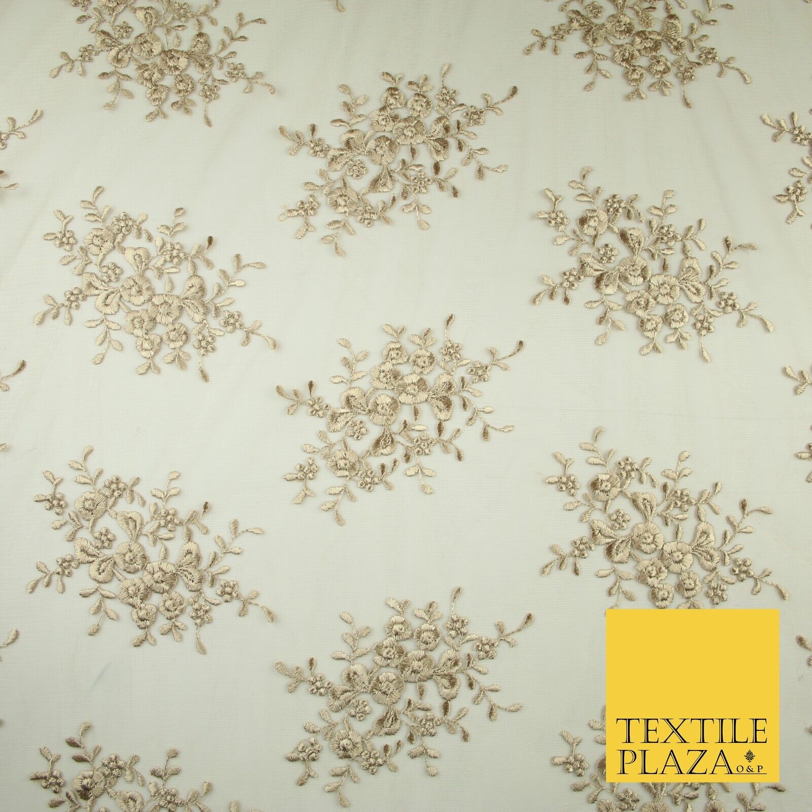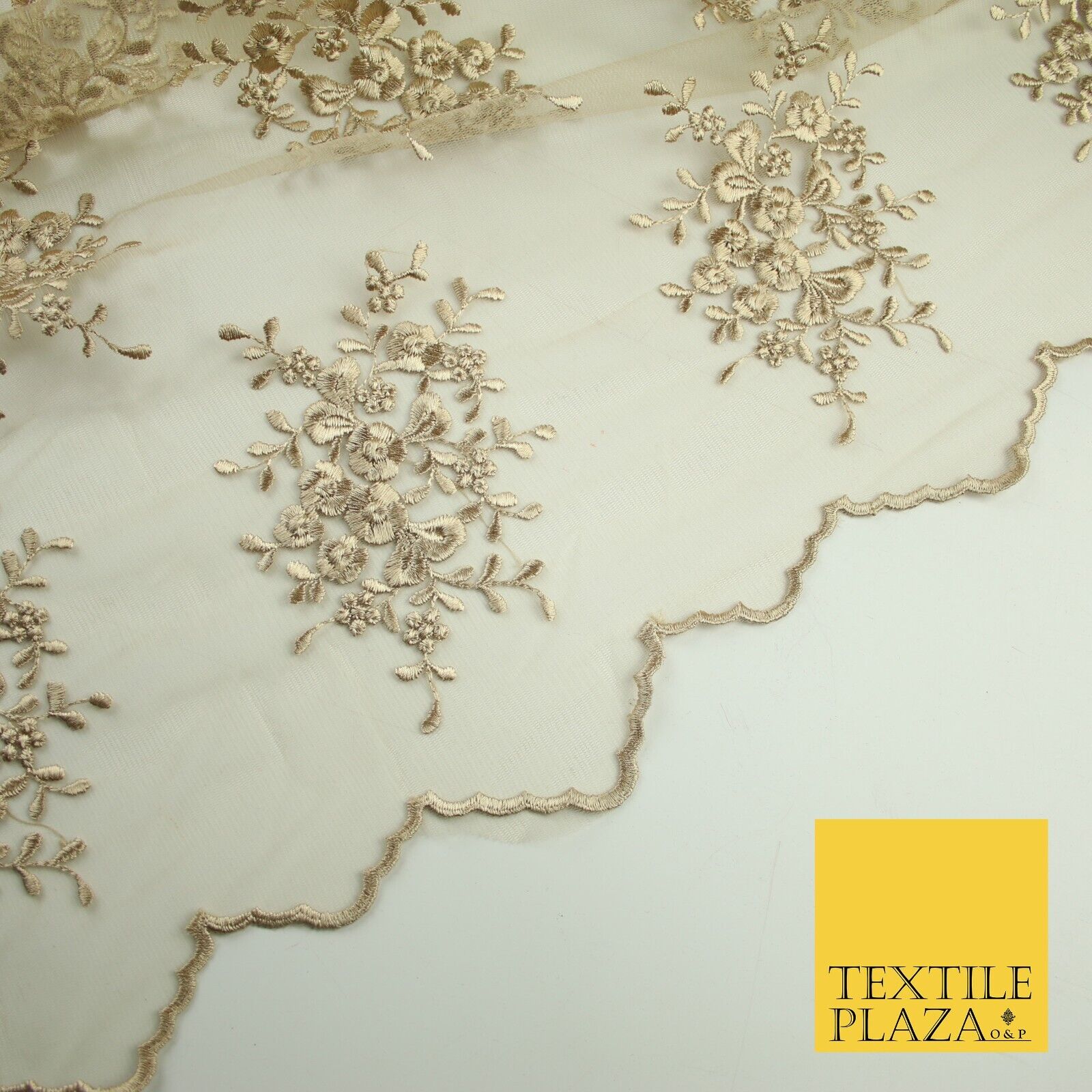 Beige Gold Floral Cluster Scalloped Edge Embroidered Net Lace Dress Fabric 8235