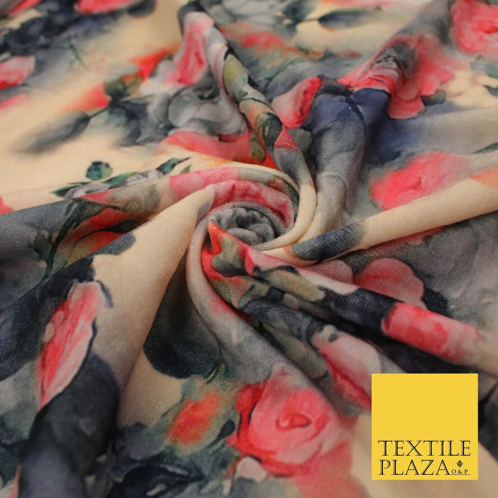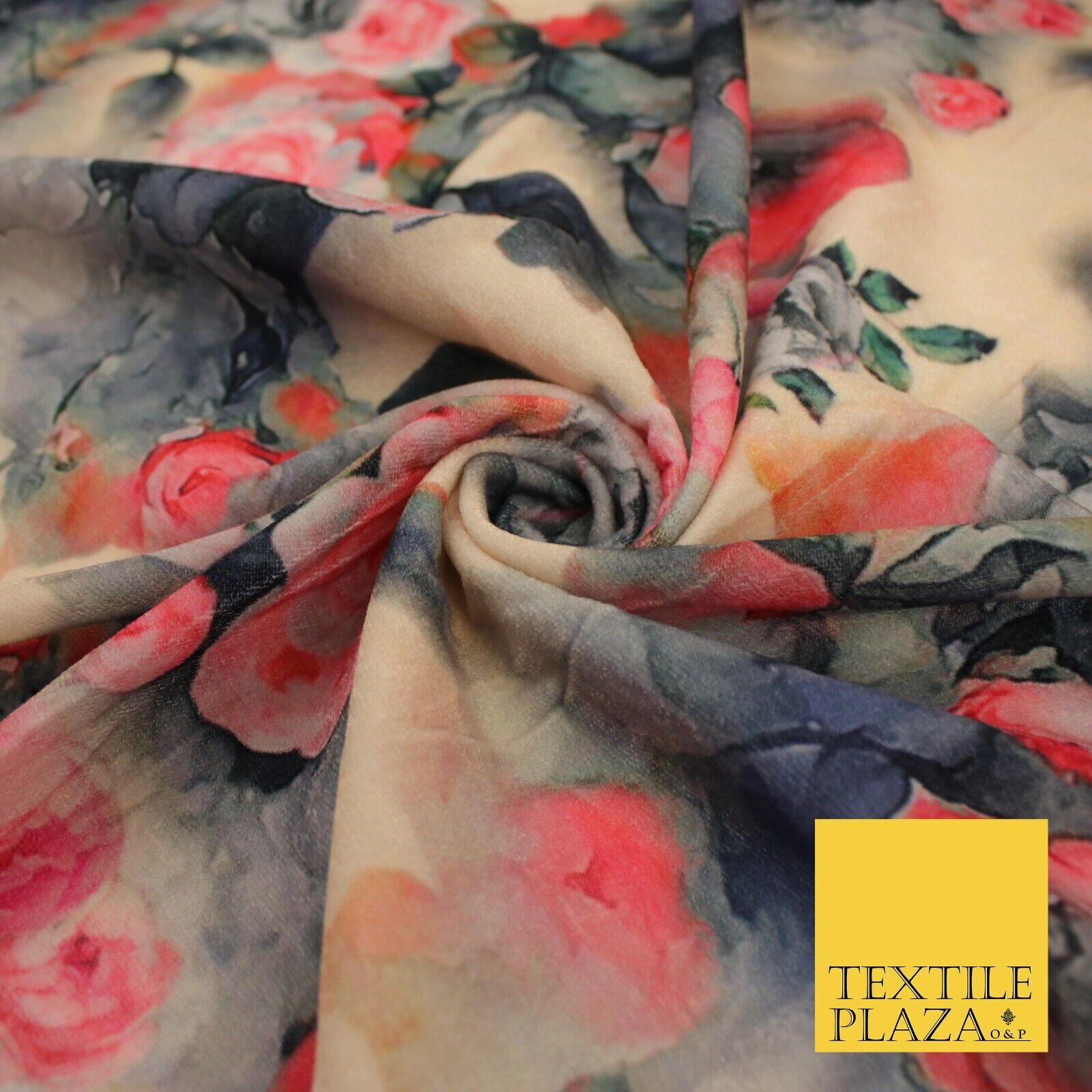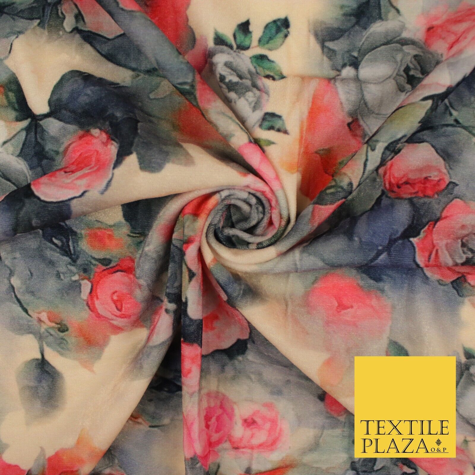 Beige Grey Pink Floral Flower Printed Micro Velvet Velour NonStretch Fabric 8823