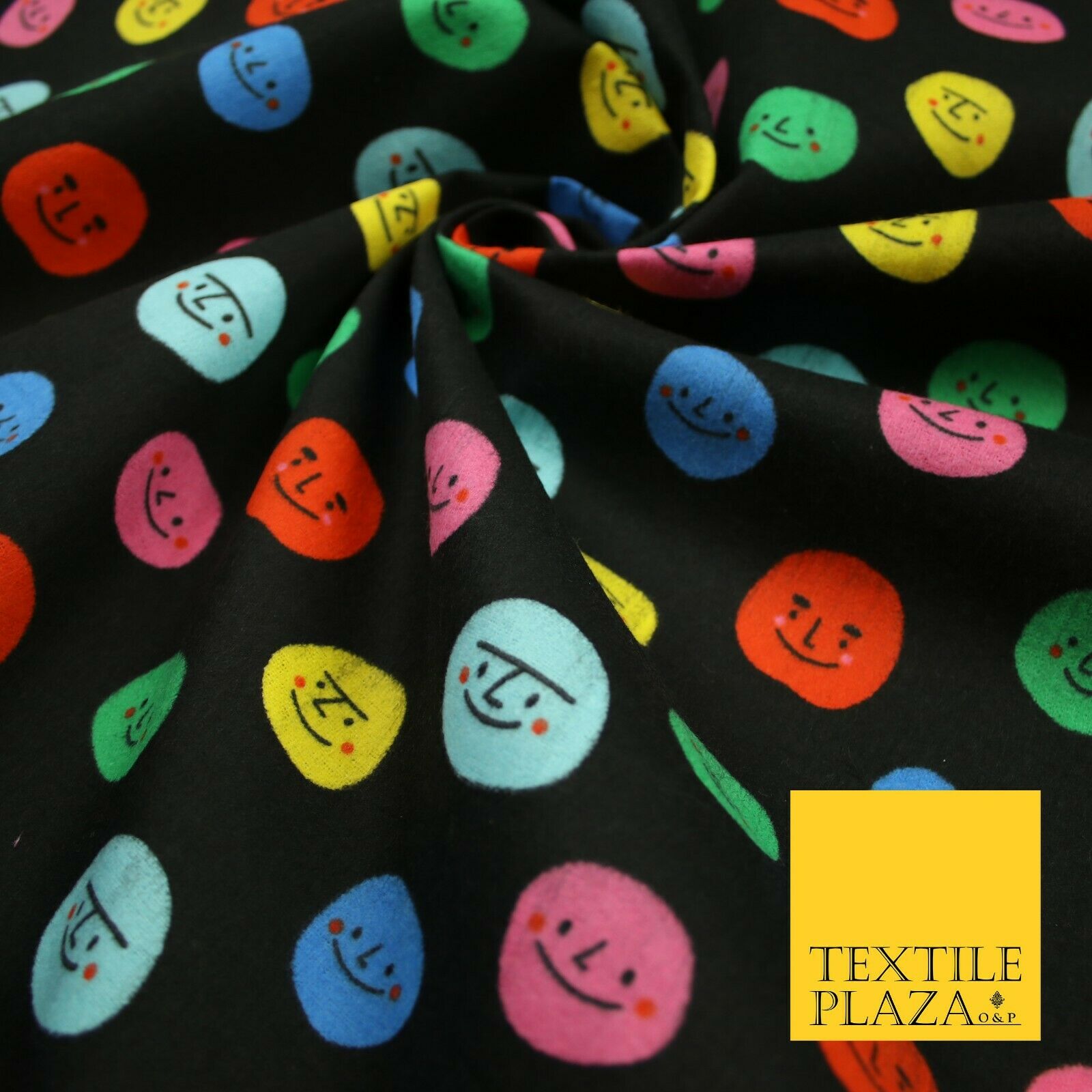 Black Colourful Smiley Faces Brushed Polycotton Winceyette Printed Fabric 7183