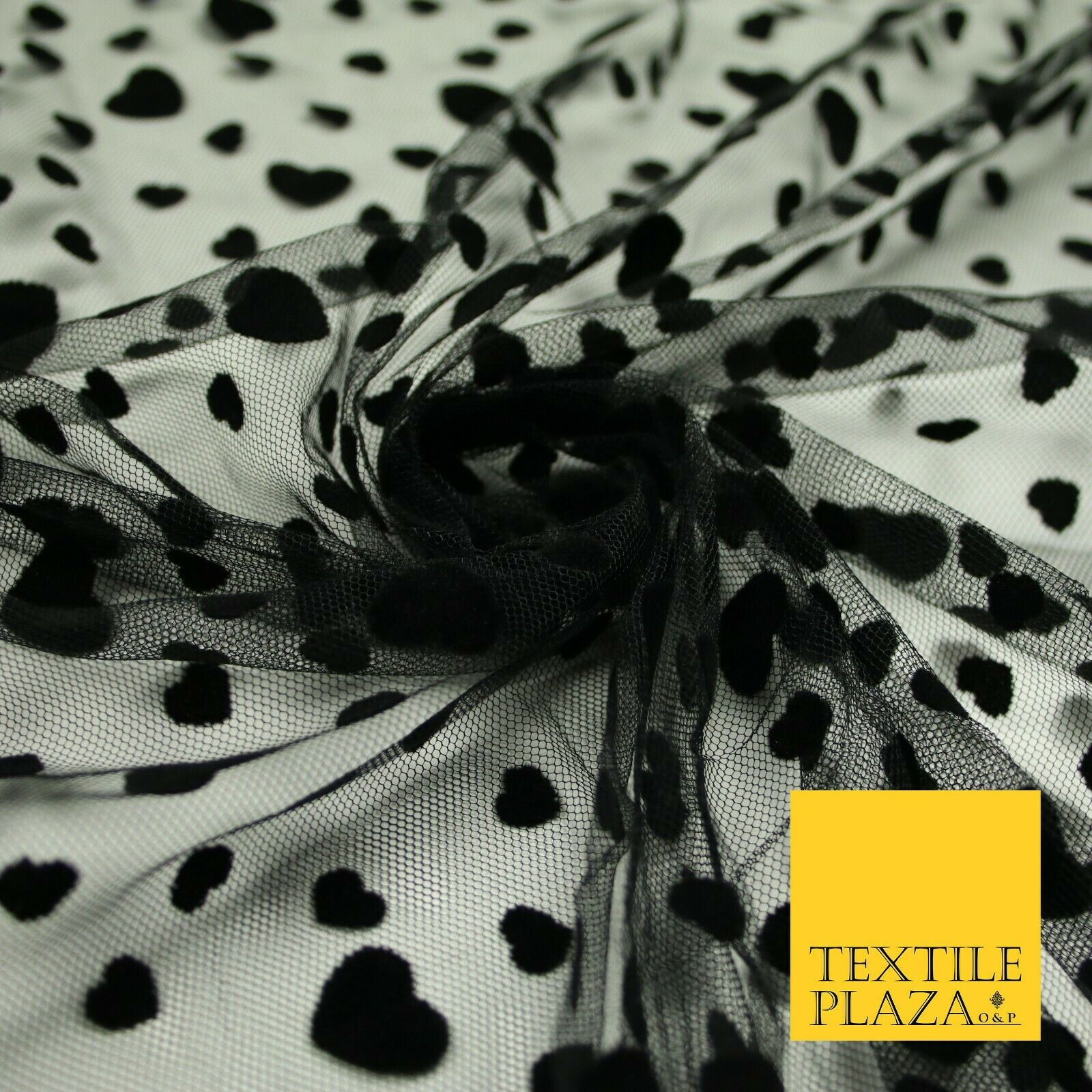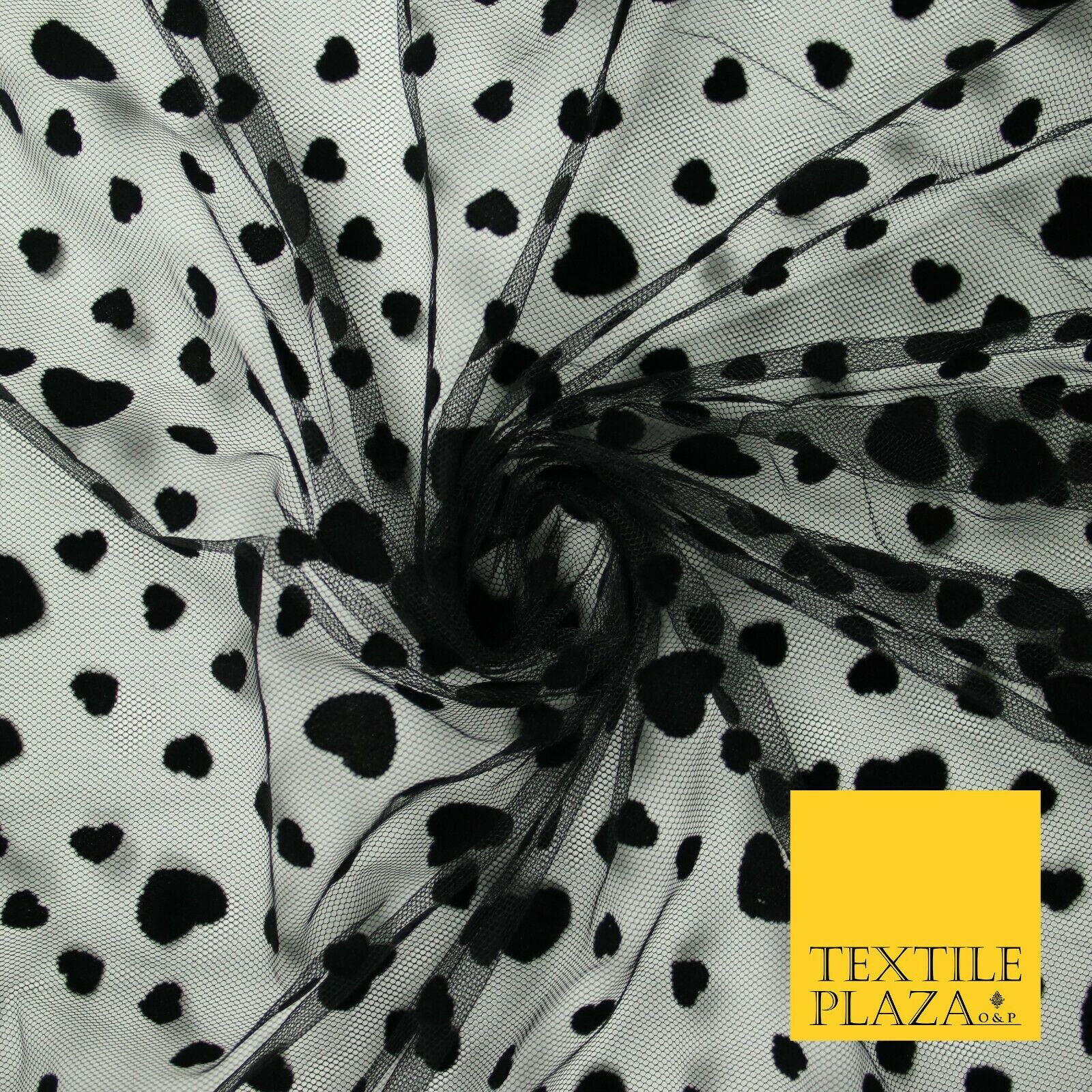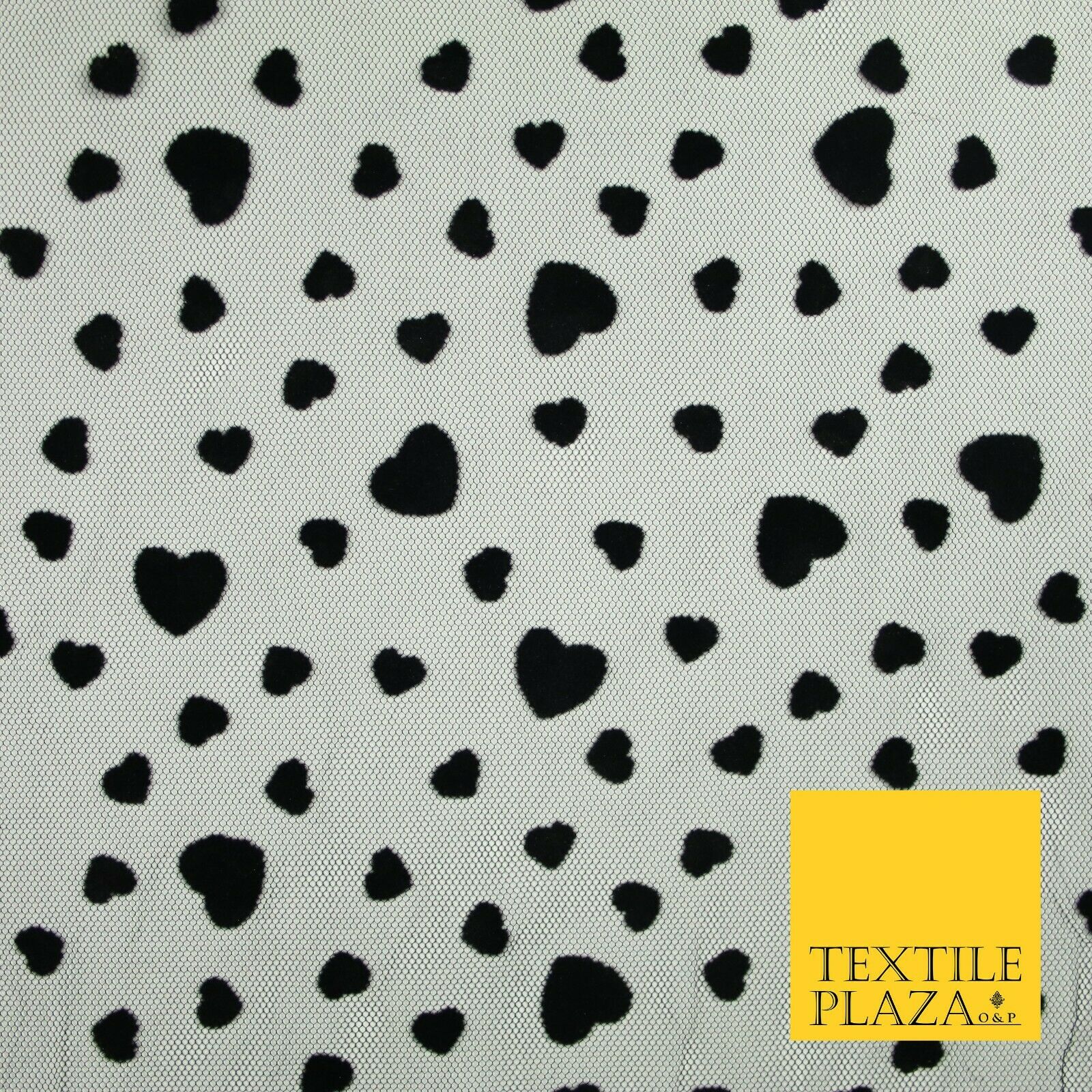 Black Confetti Love Hearts Flocked Mesh Net Stretch Dress Fabric 58" 7073