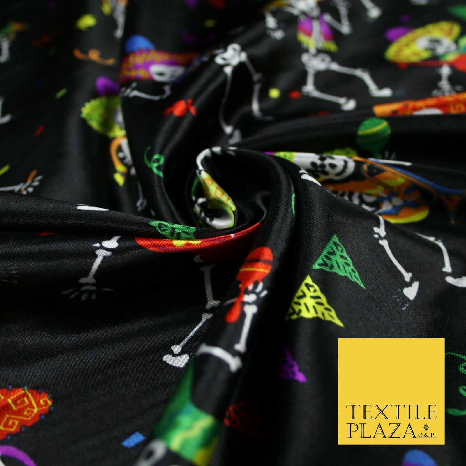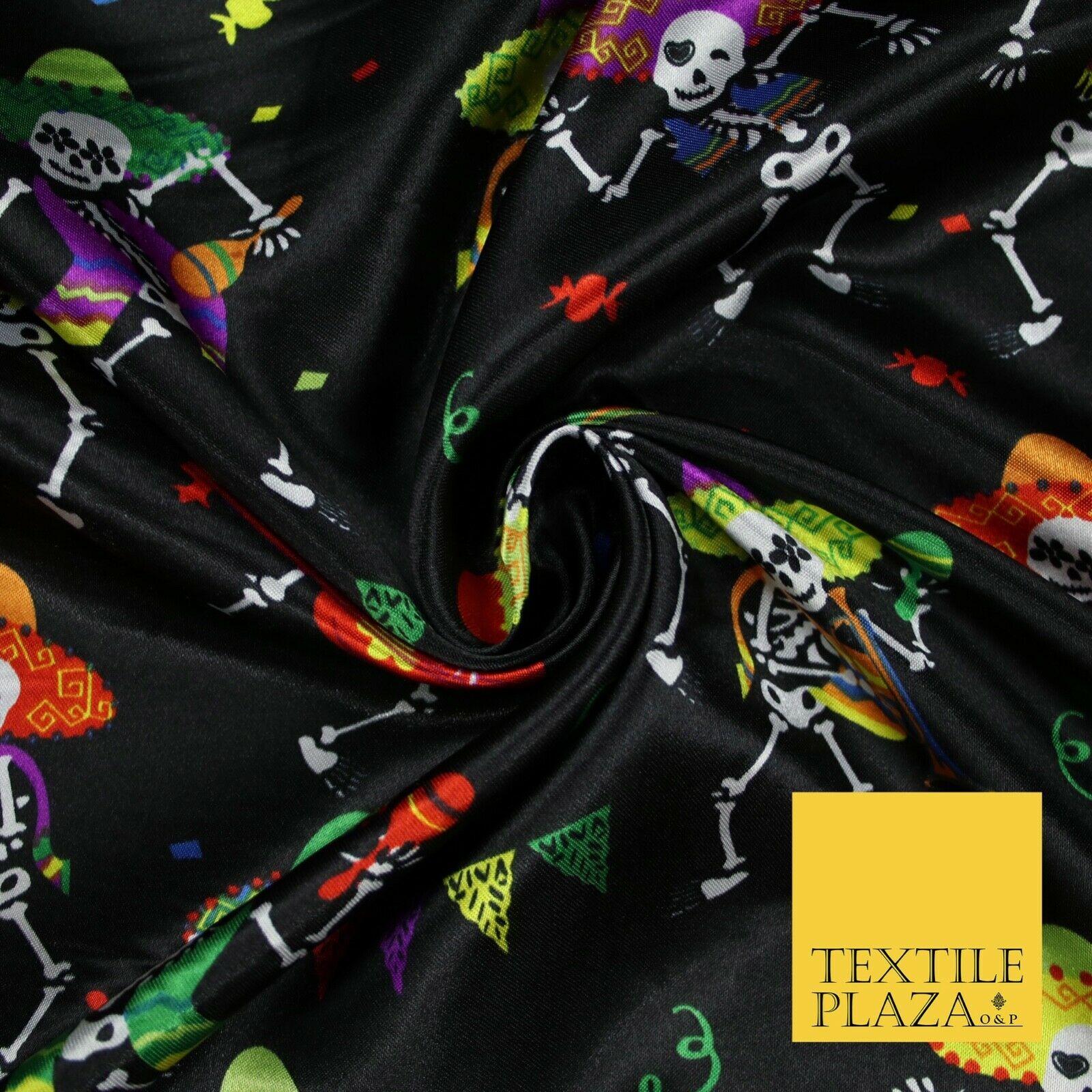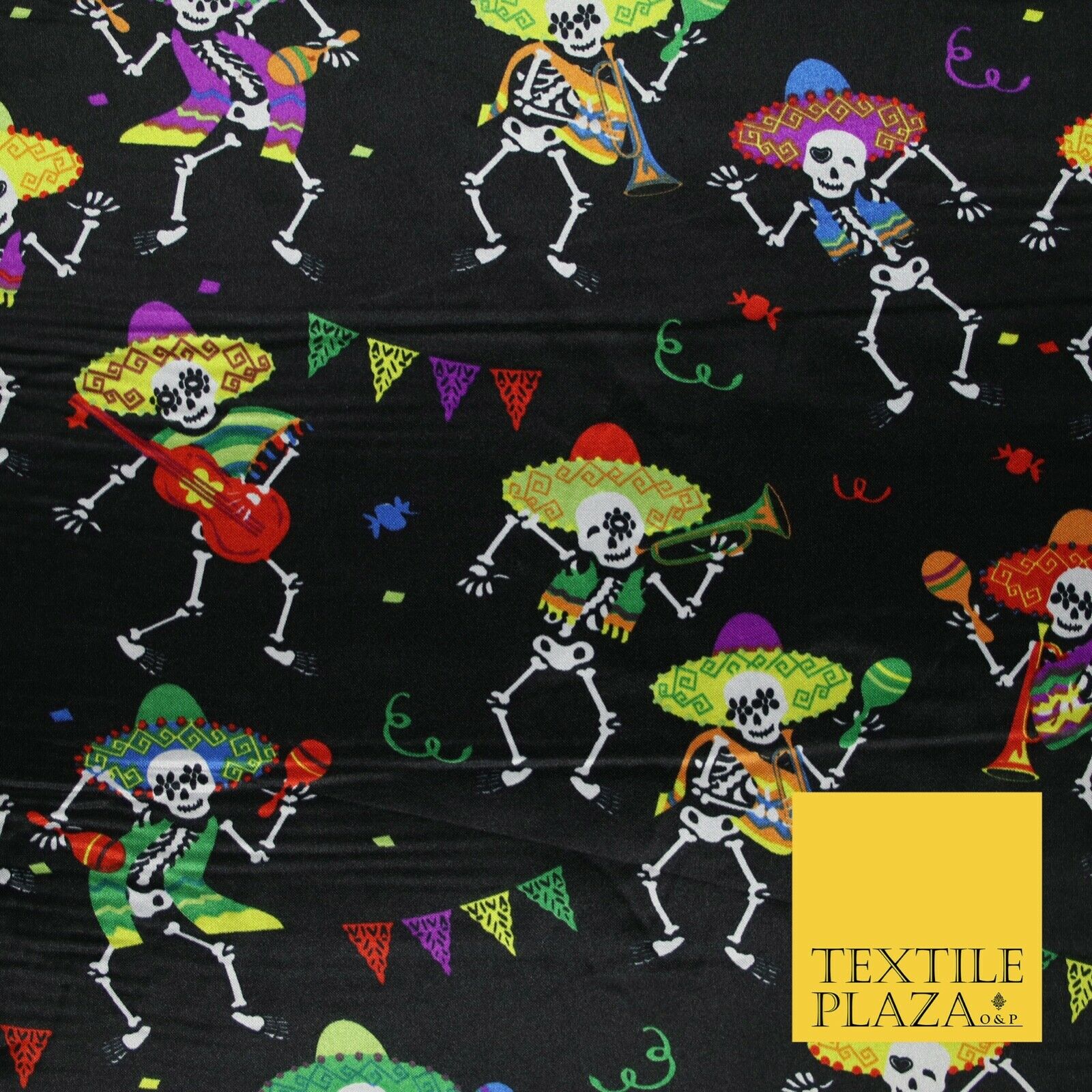 Black Dancing Skeleton Mexican Halloween Printed Satin Dress Fabric 58" 6499