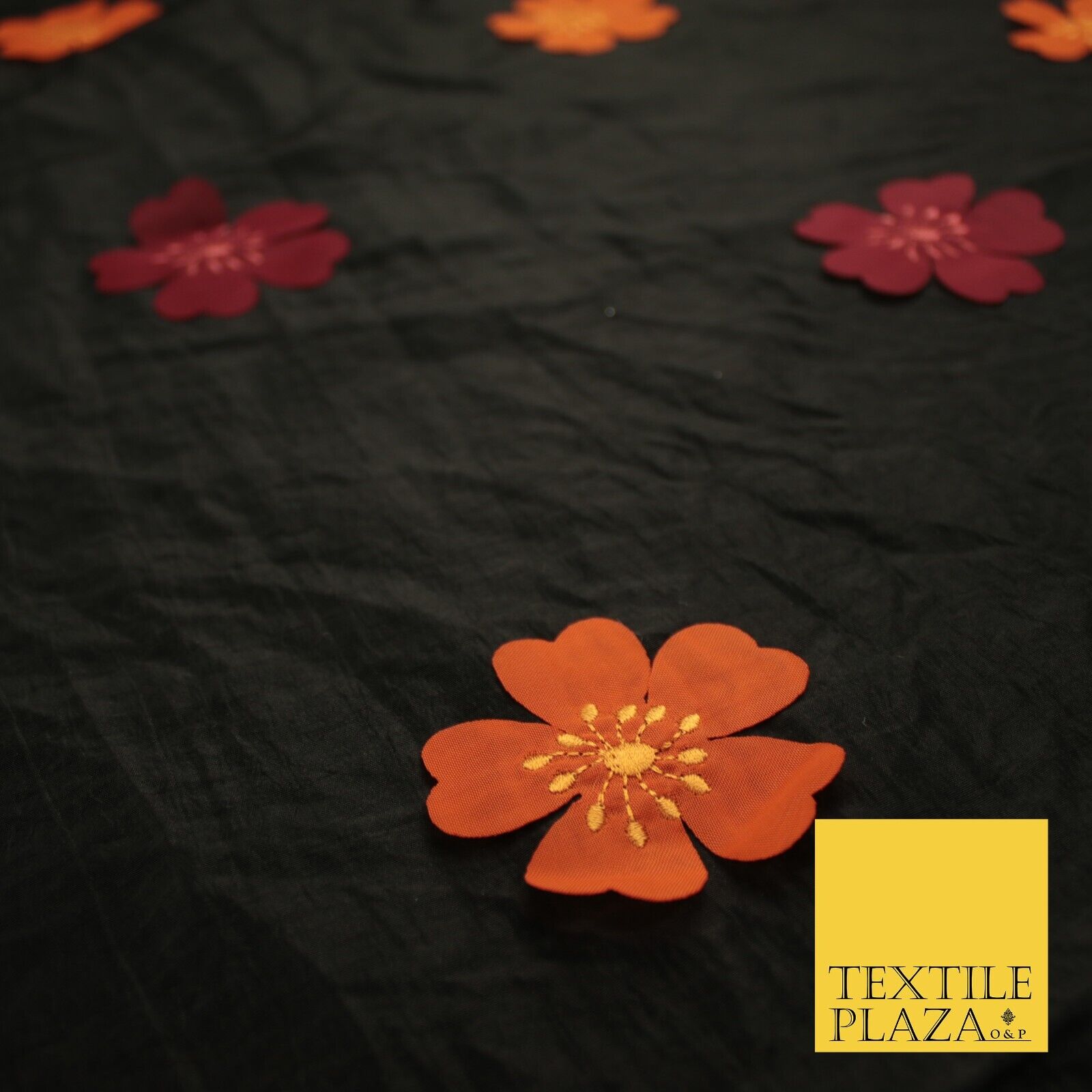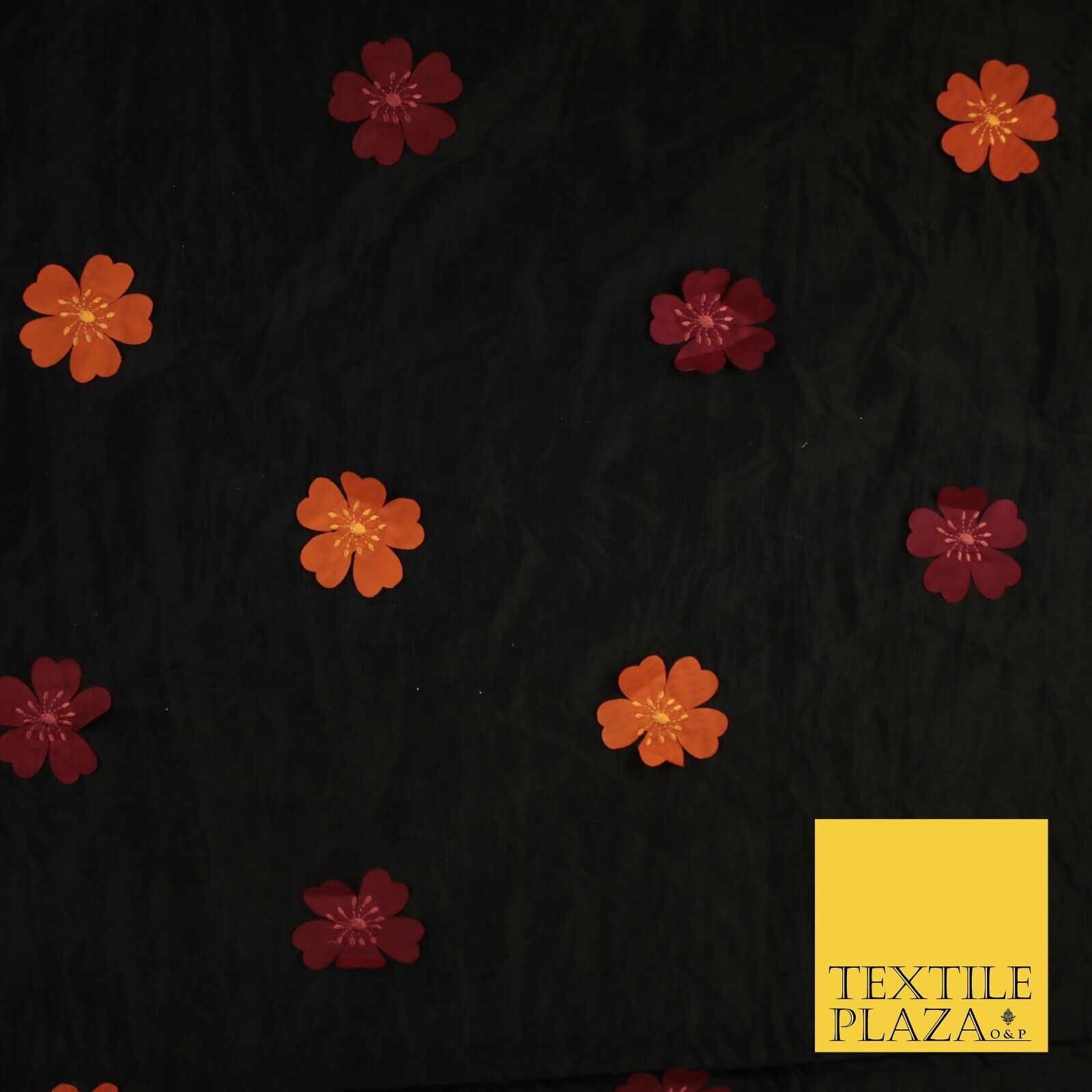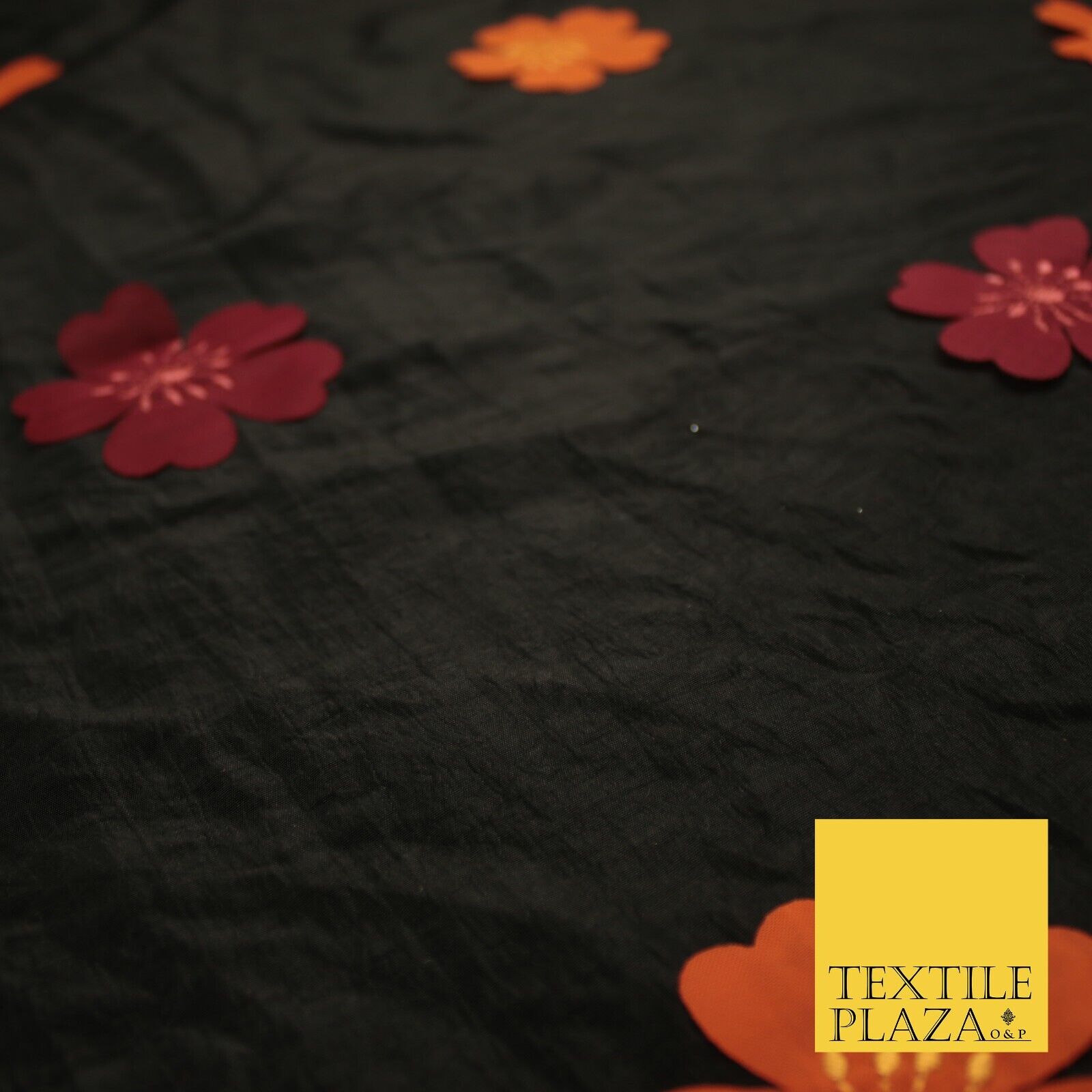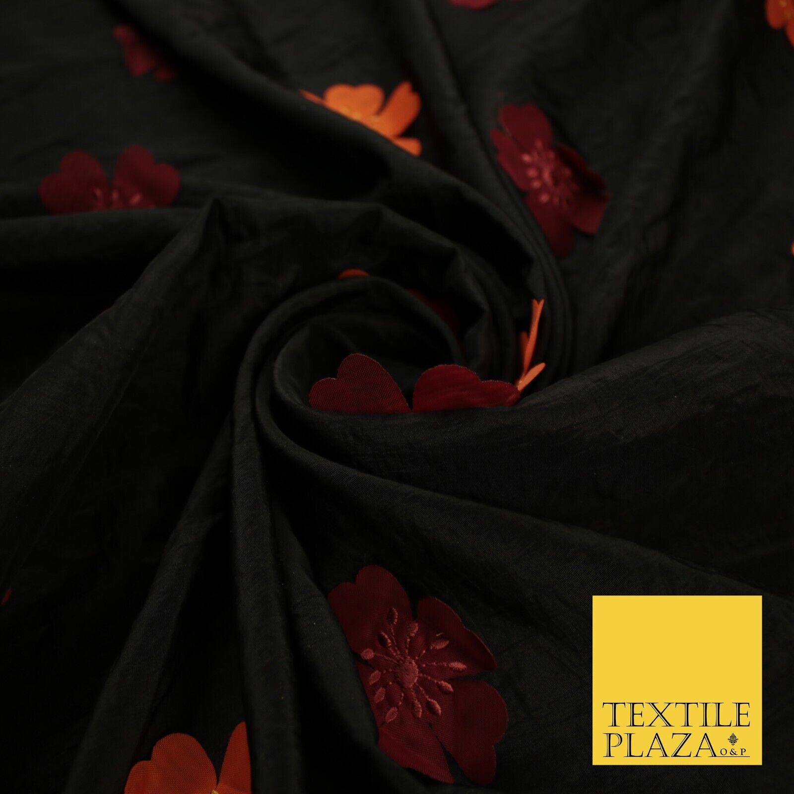Black Faux Silk Taffeta with Orange Wine Applique Flowers Dress Fabric 56" 10385