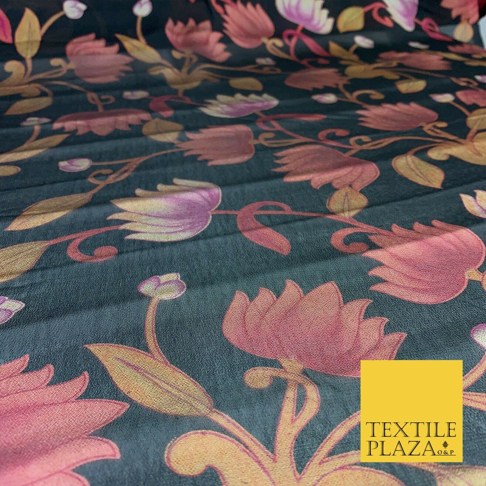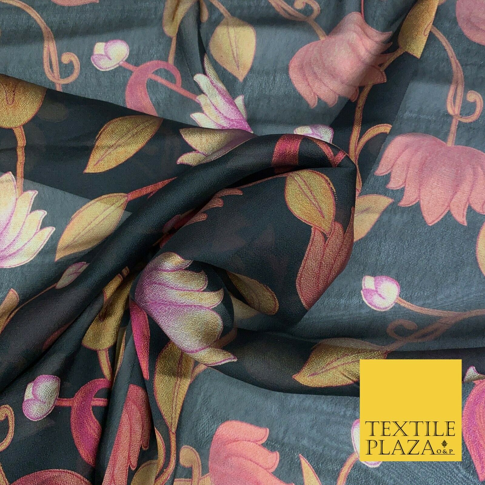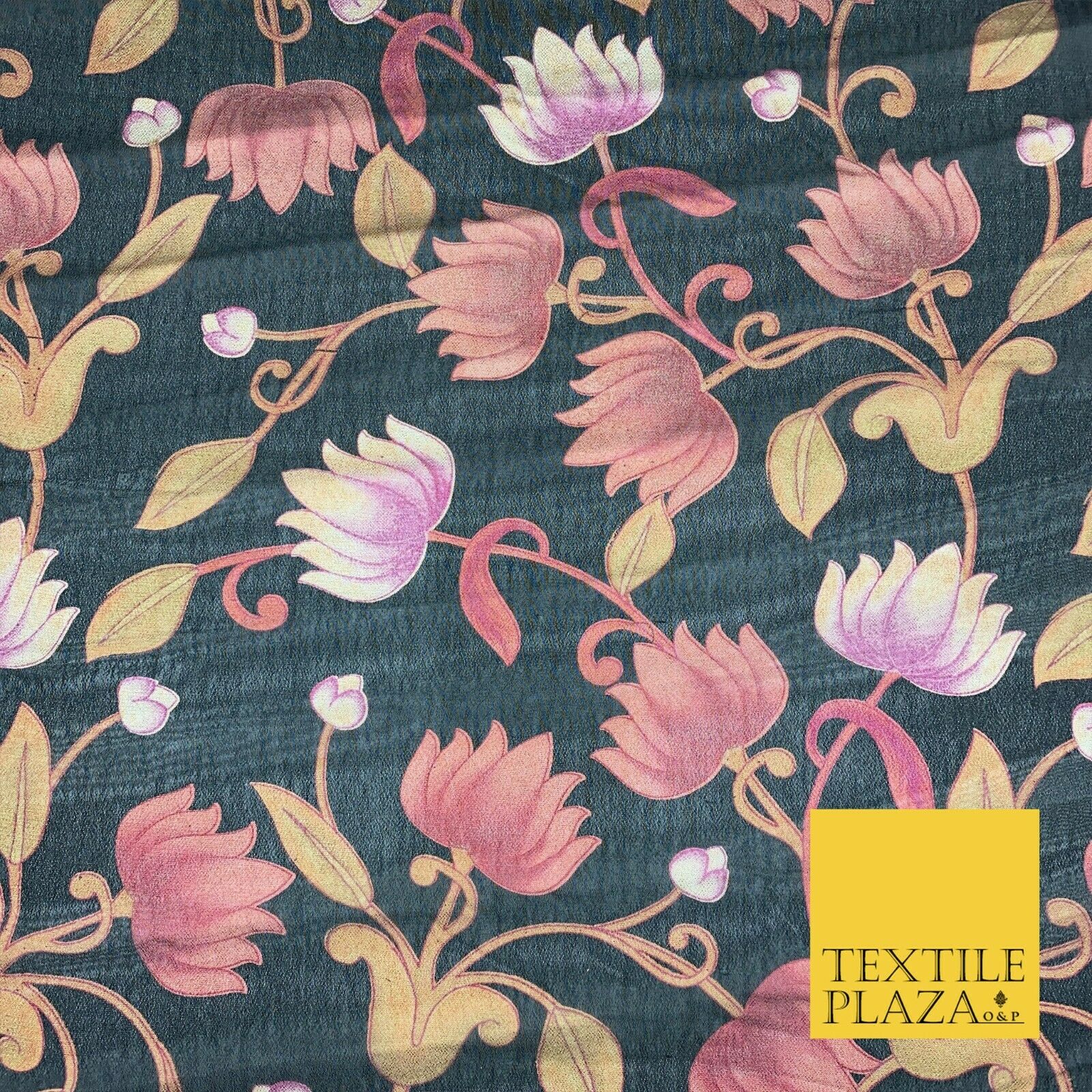 BLACK Floral Lotus Premium Printed Sheen Georgette Dress Fabric Drape 1670