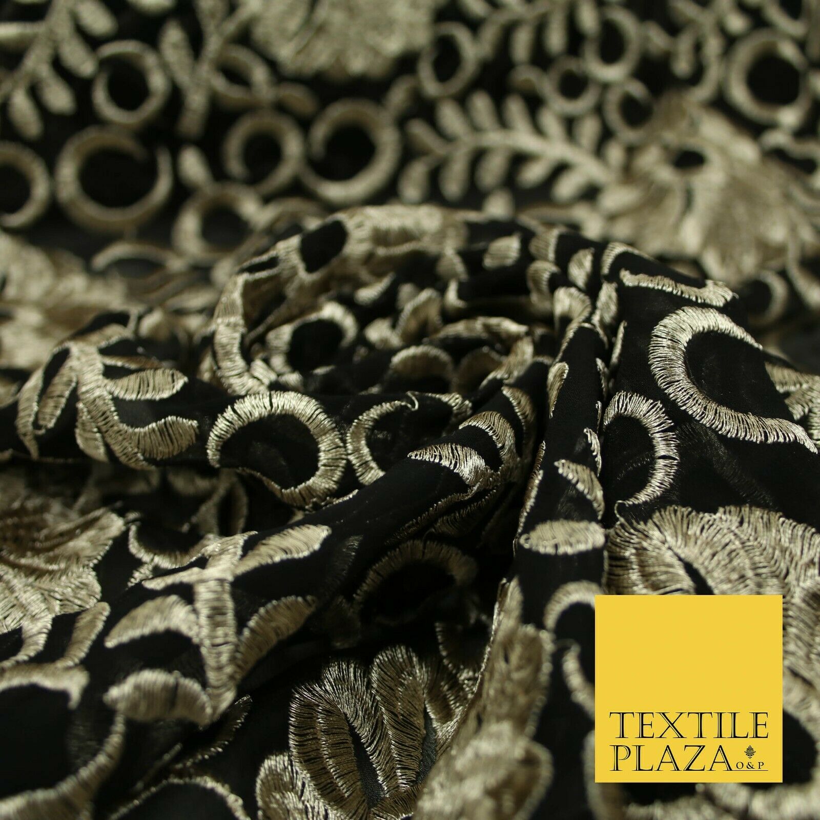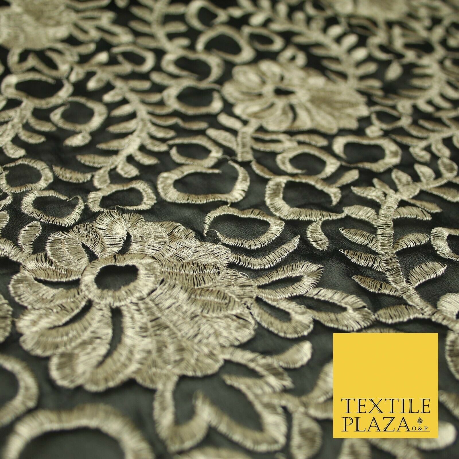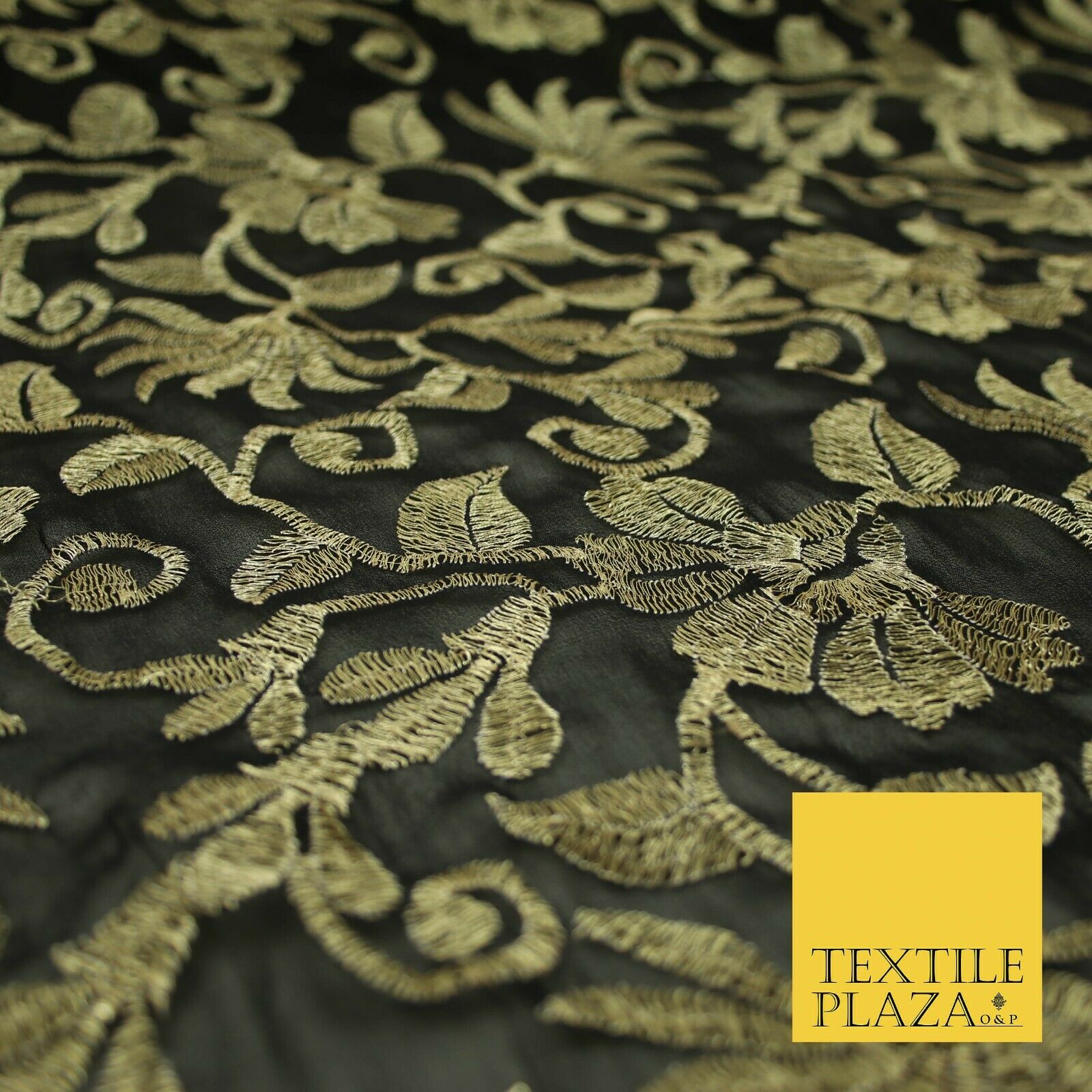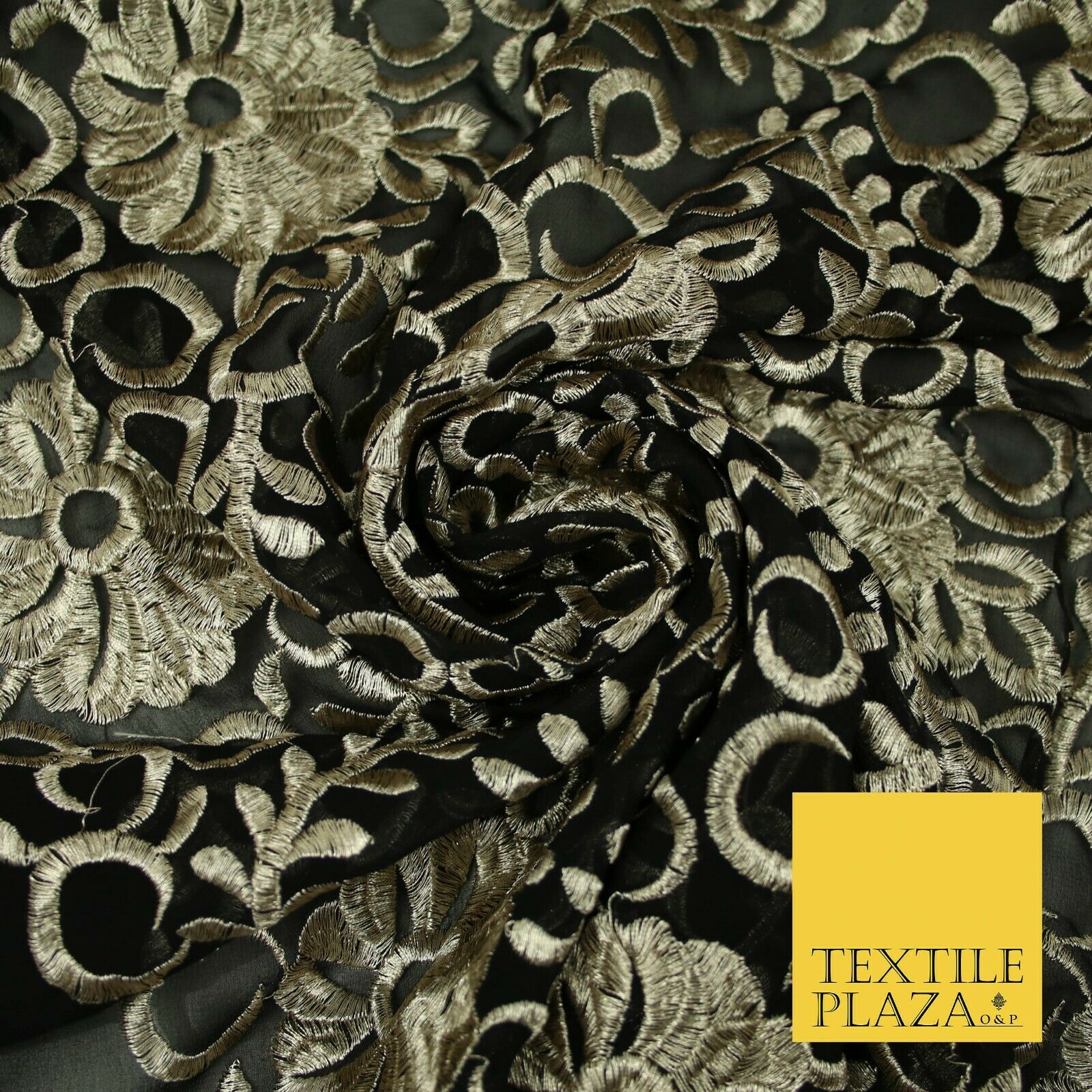 Black Metallic Floral Swirl Embroidery Bridal Wedding Dress Georgette Fabric