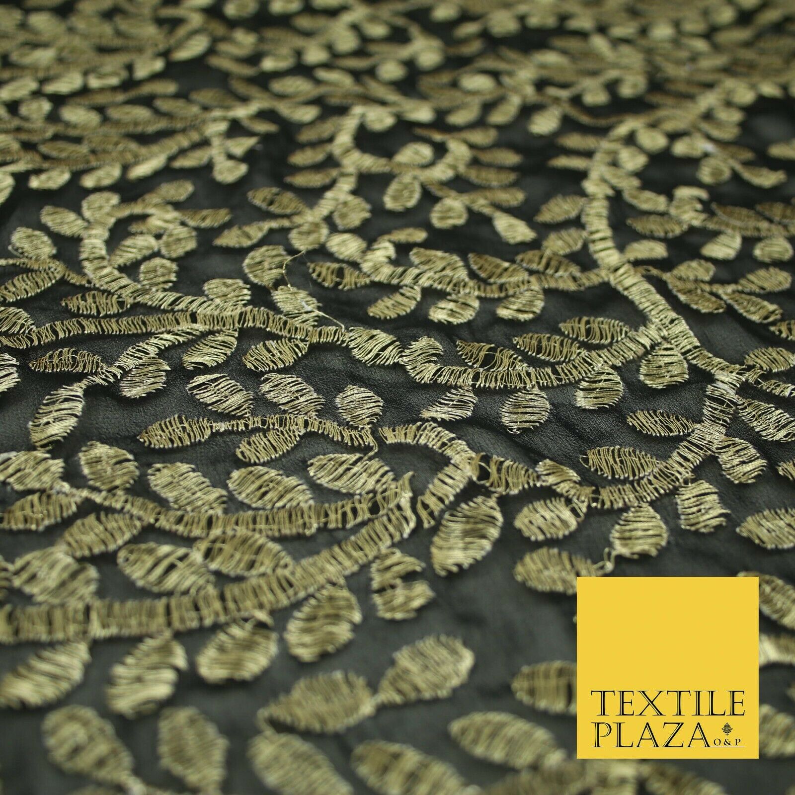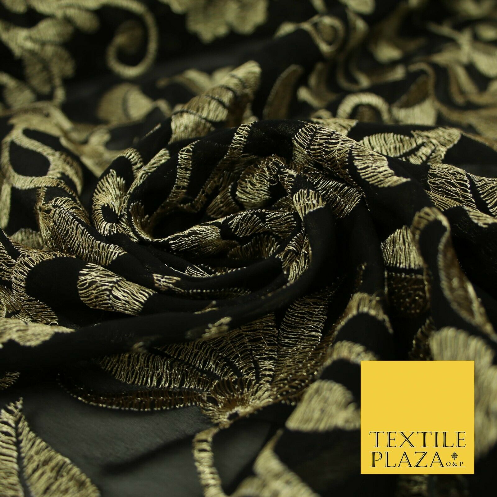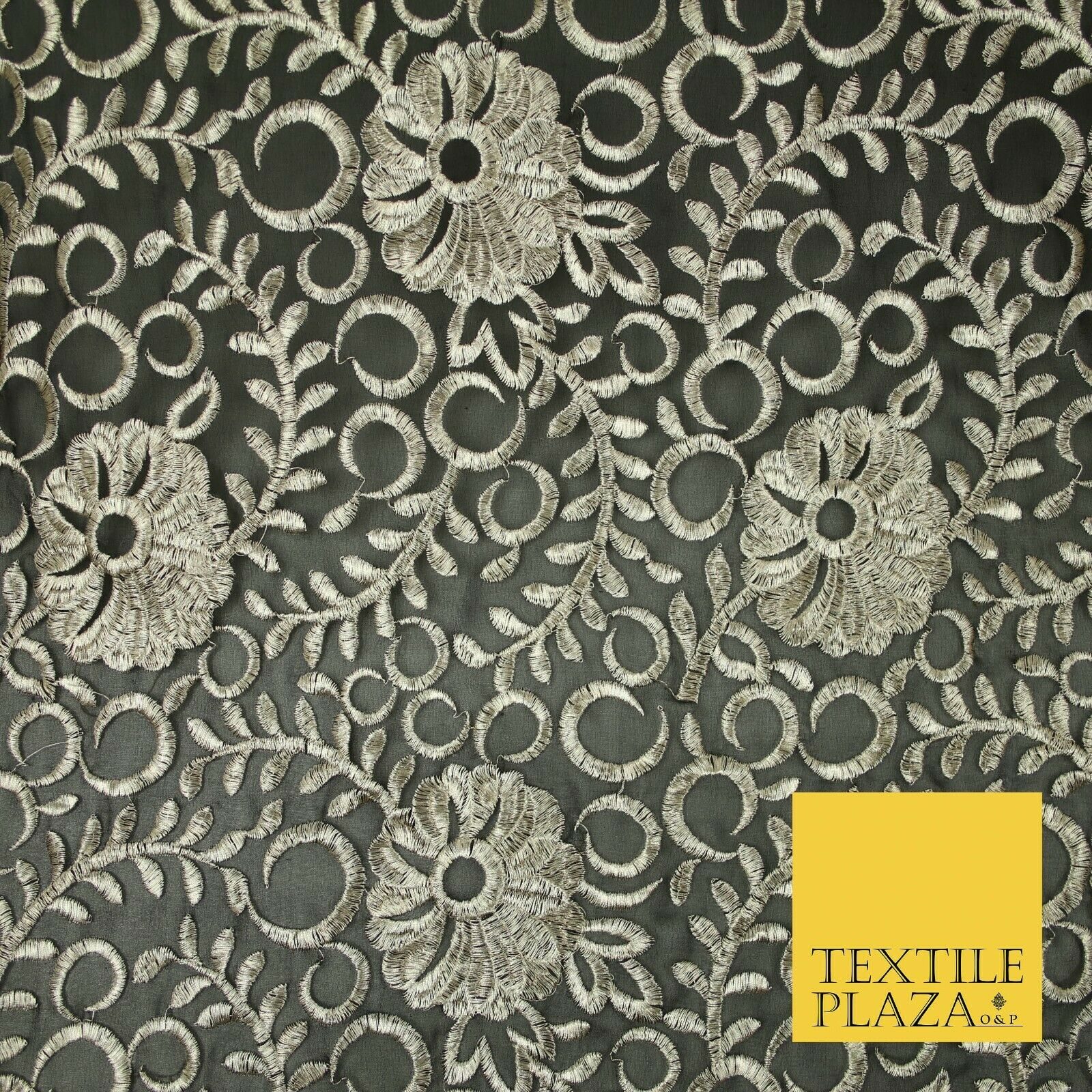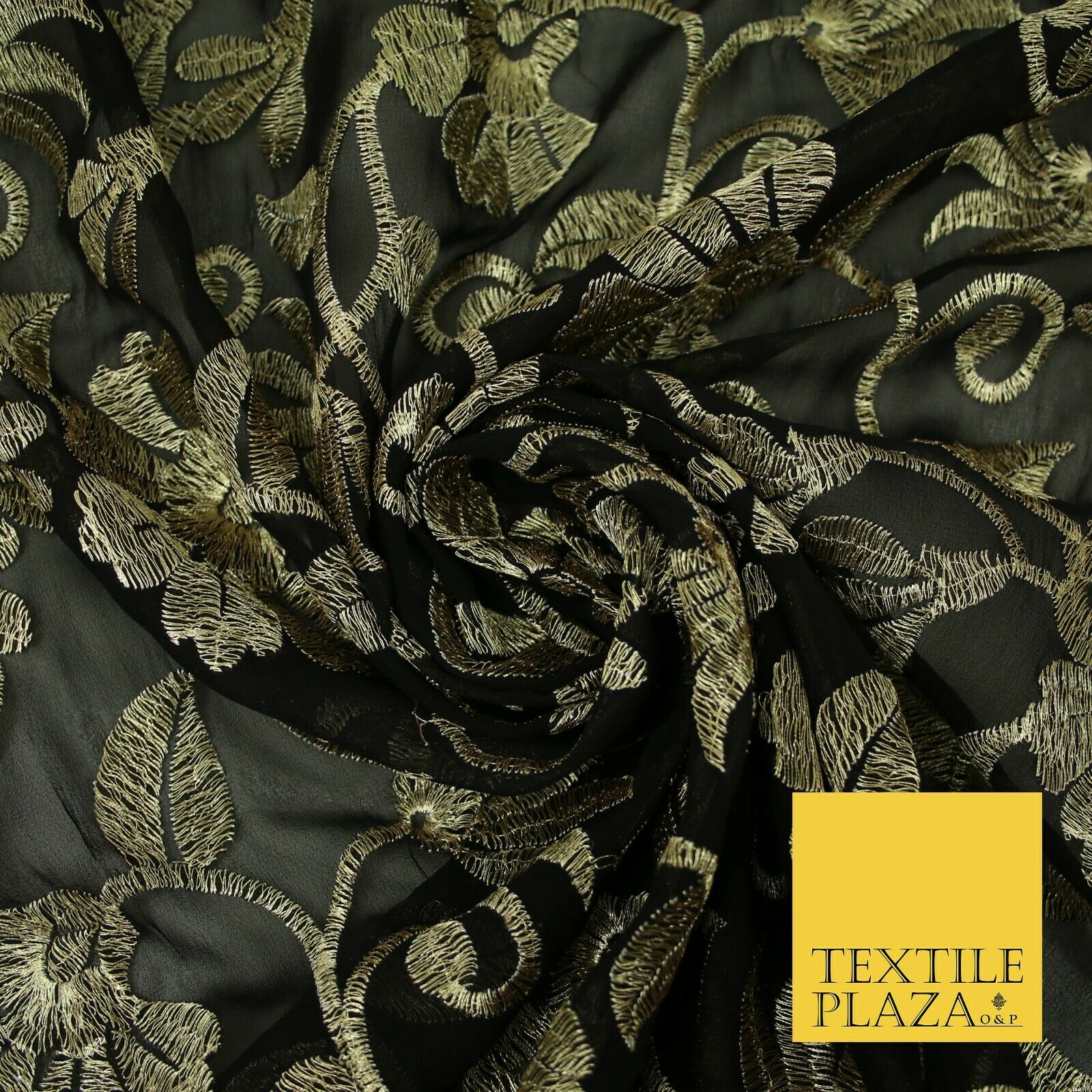 Black Metallic Floral Swirl Embroidery Bridal Wedding Dress Georgette Fabric