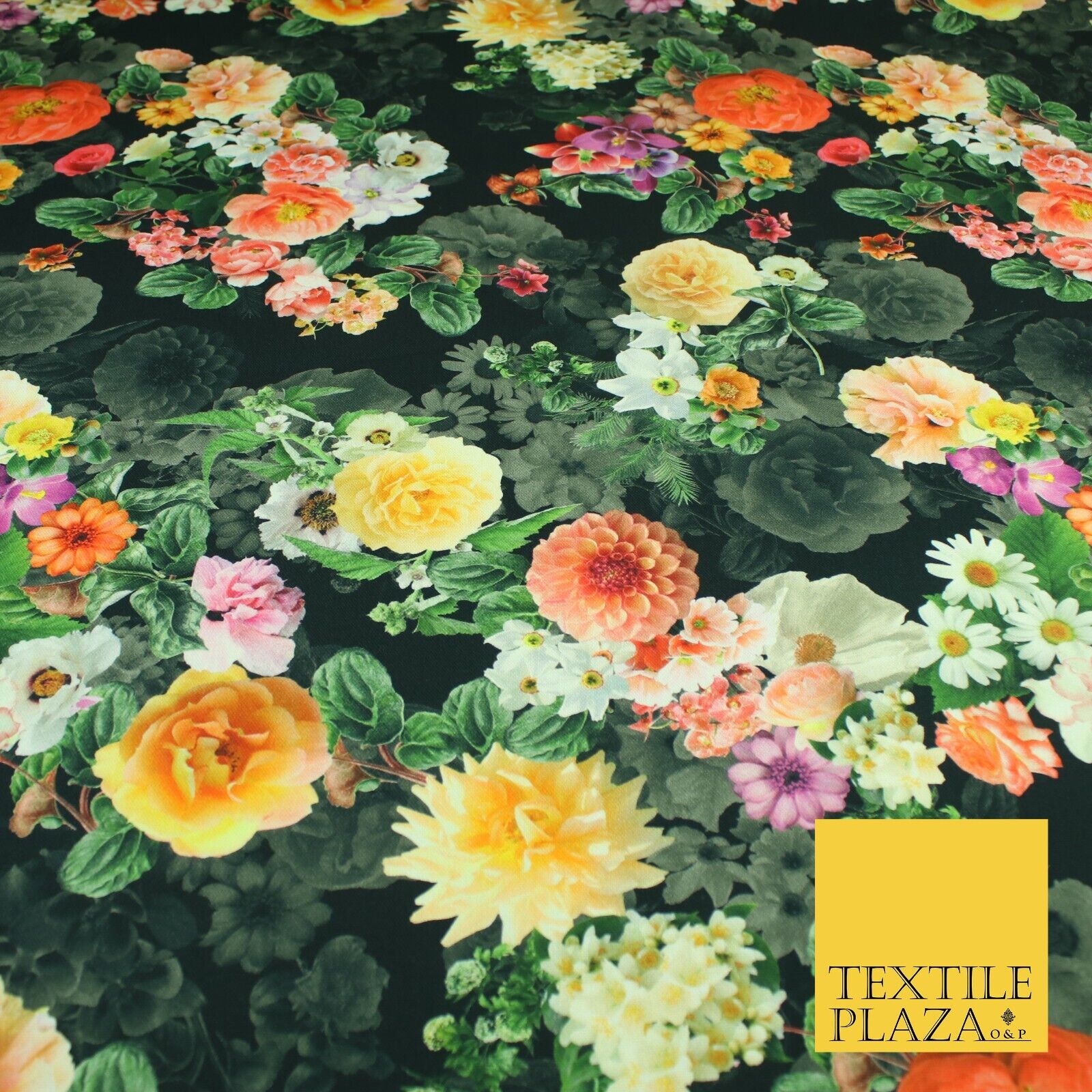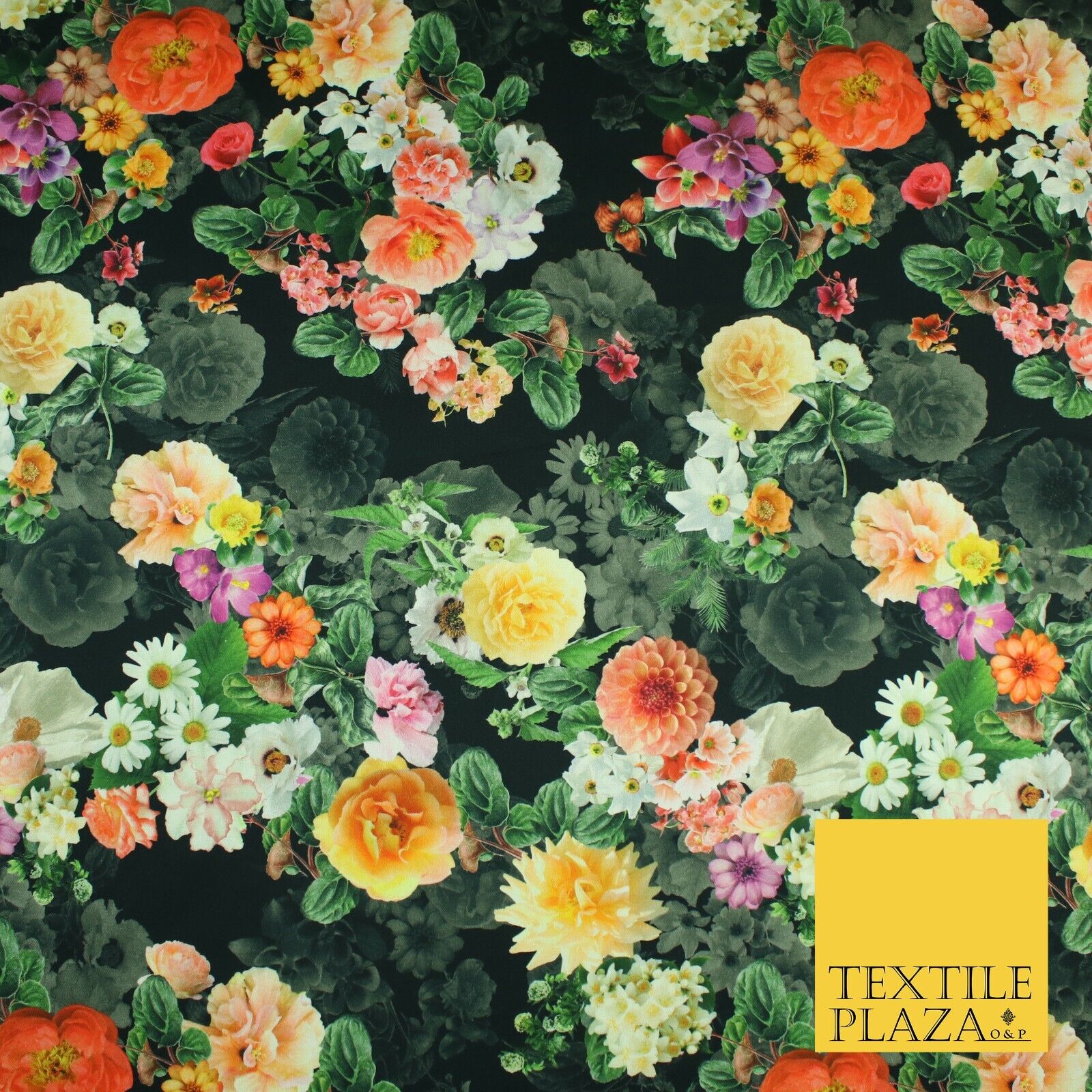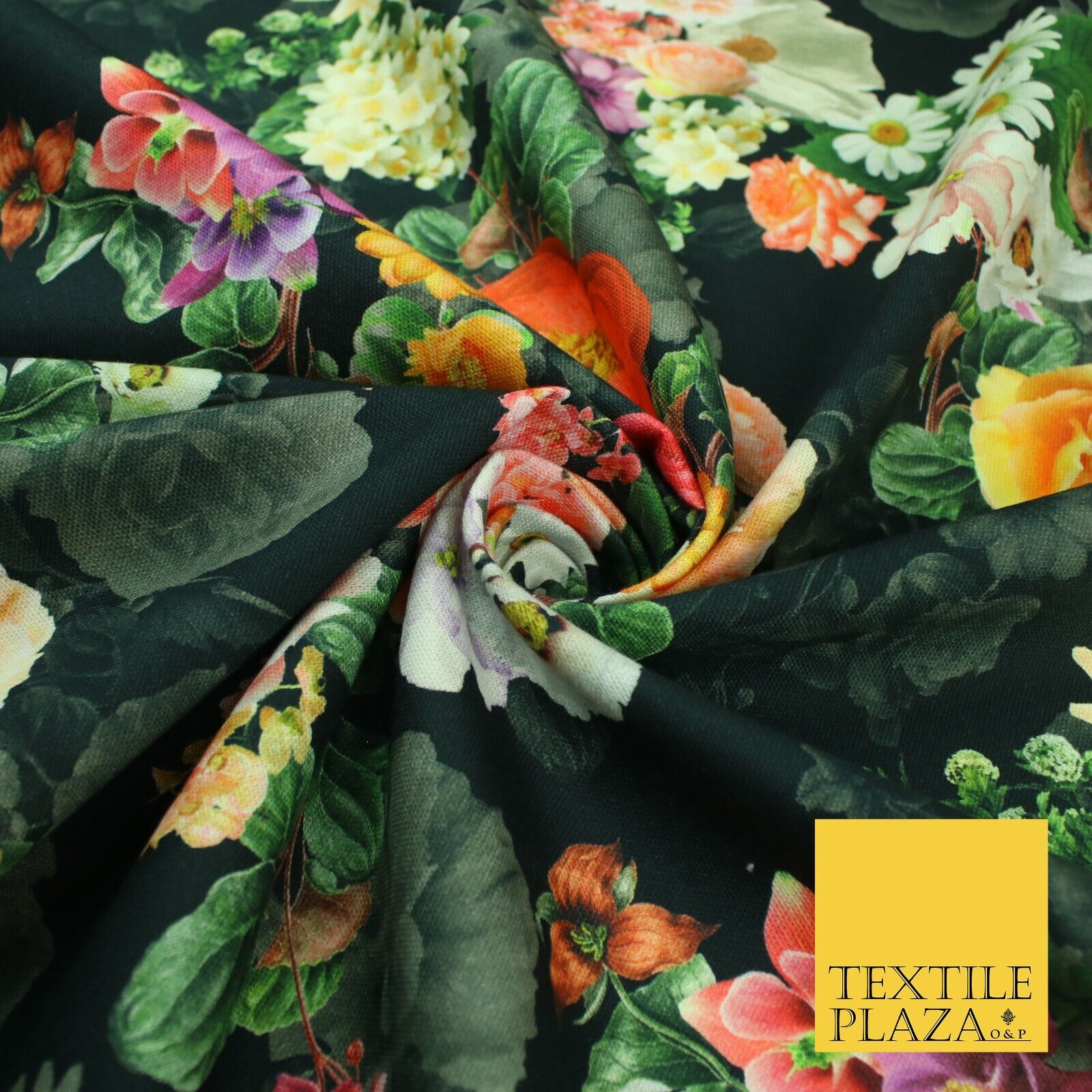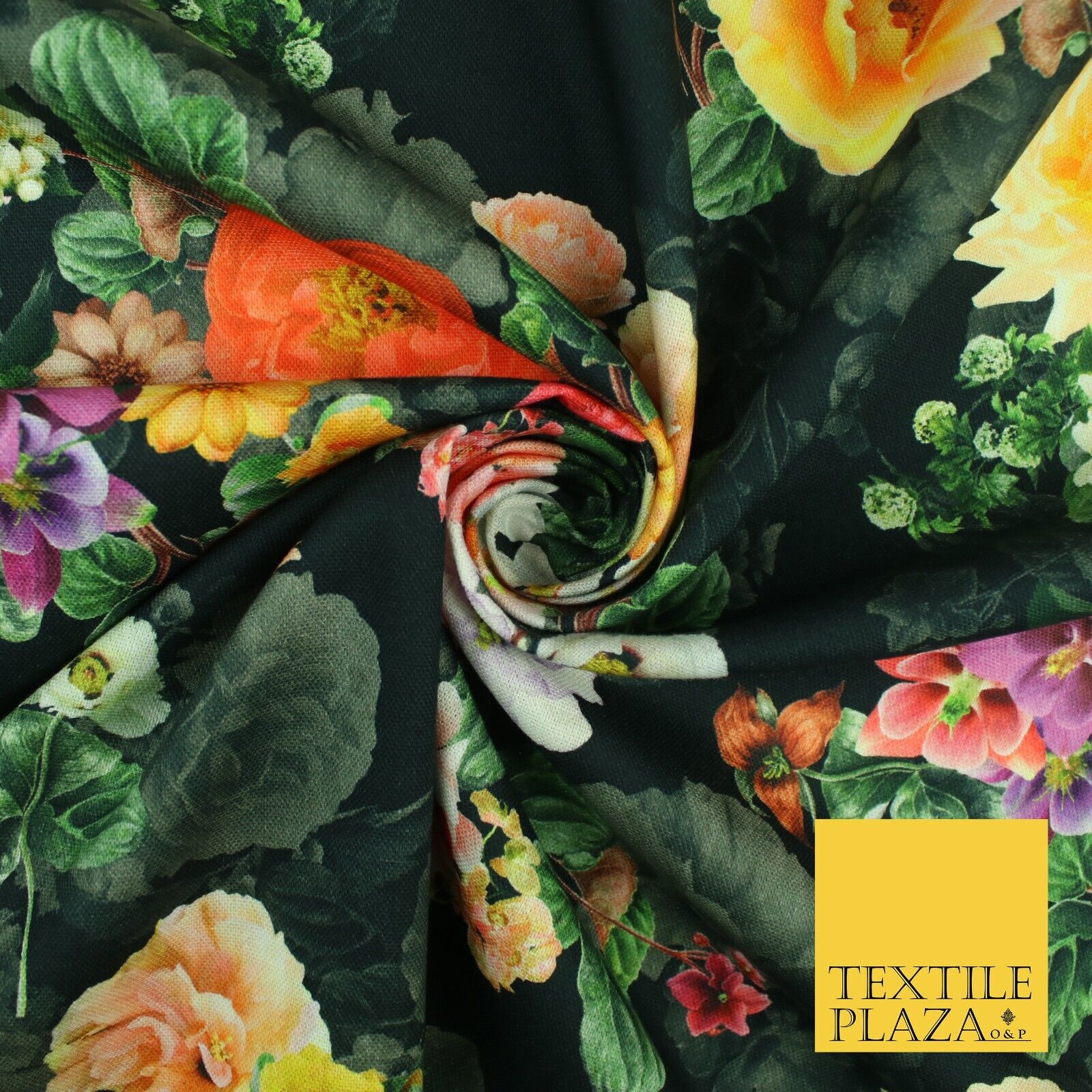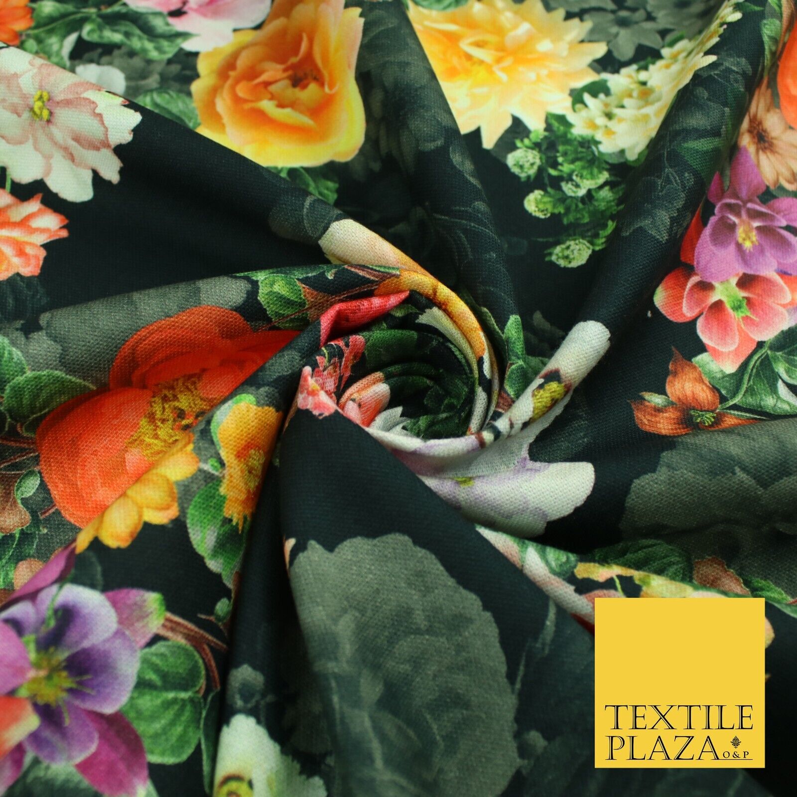 Black Multicolour Floral Cotton Canvas Panama Upholstery Curtain Fabric 8574