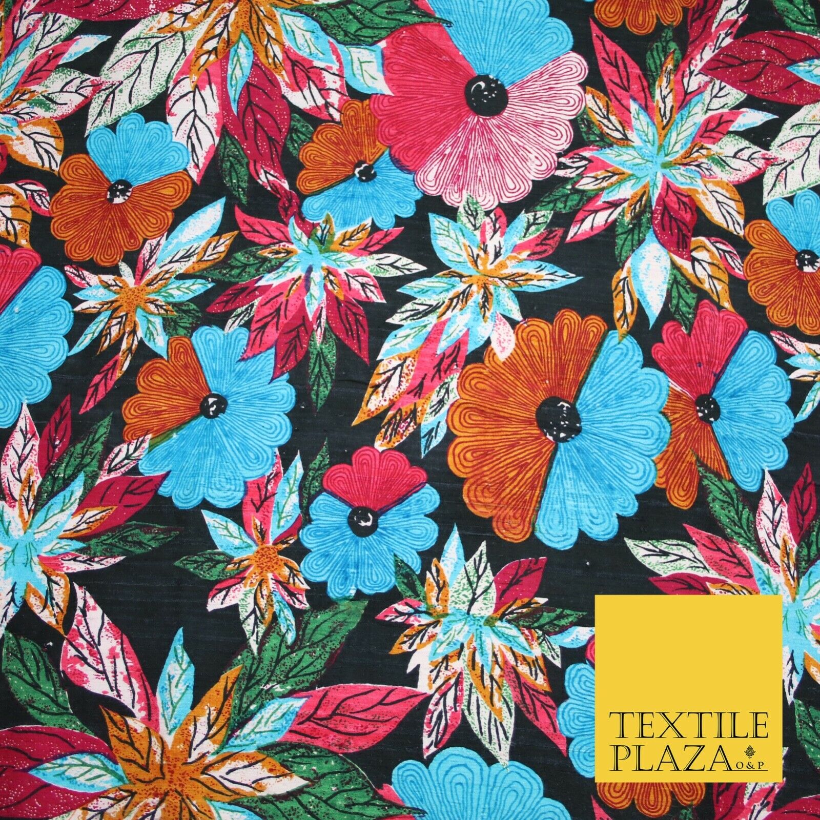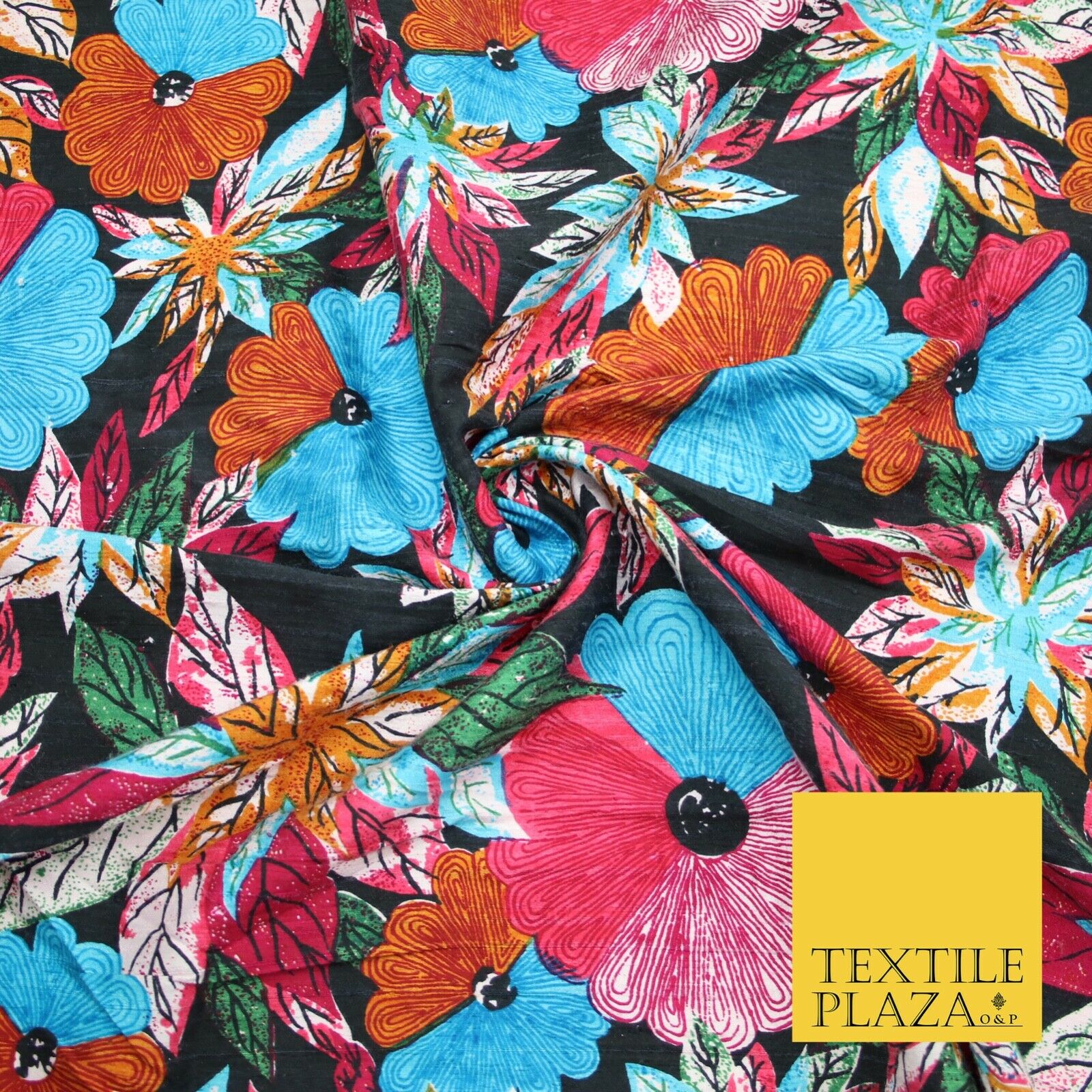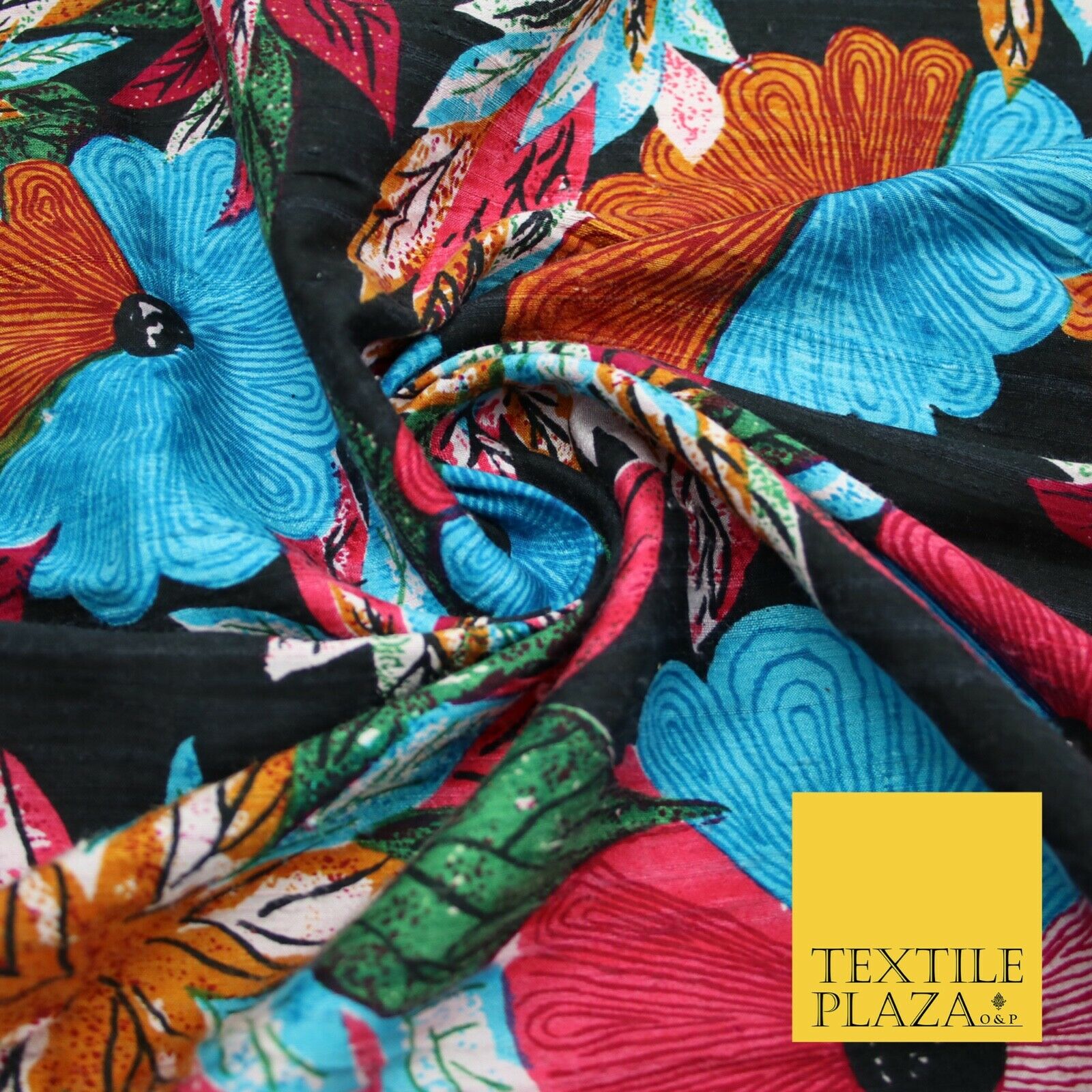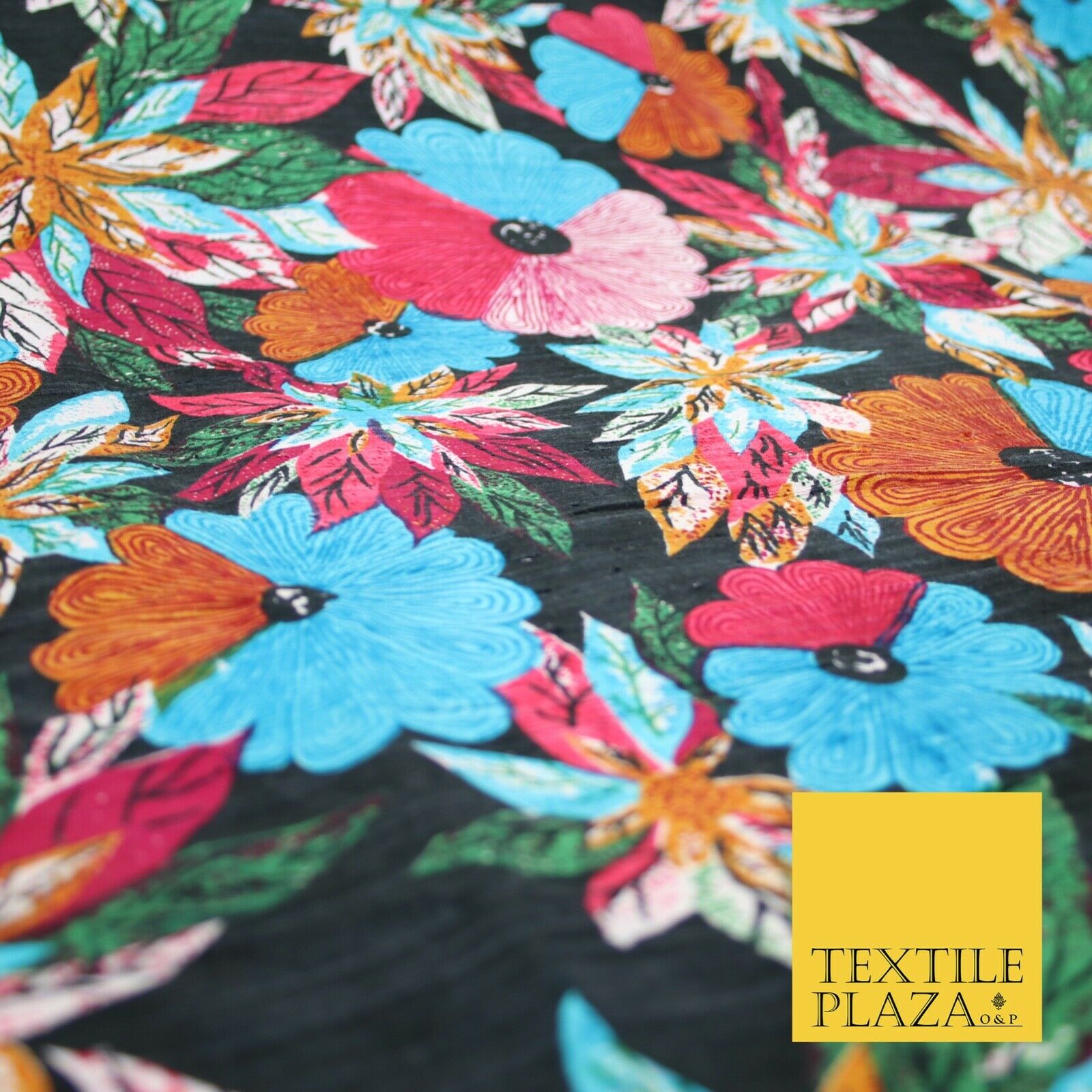 Black Multicolour Flower Funky Abstract Printed PURE Dupion Raw Silk Fabric 2483