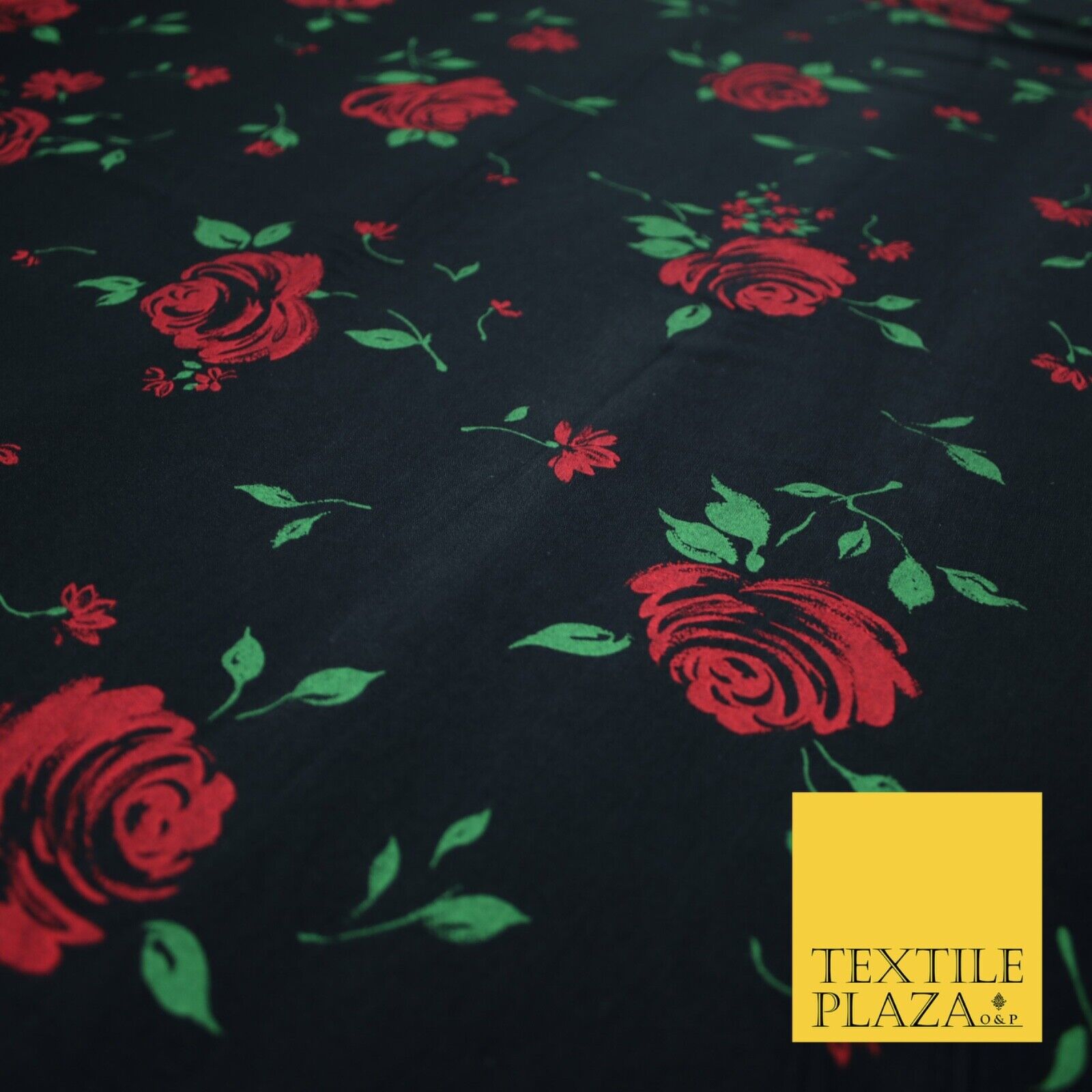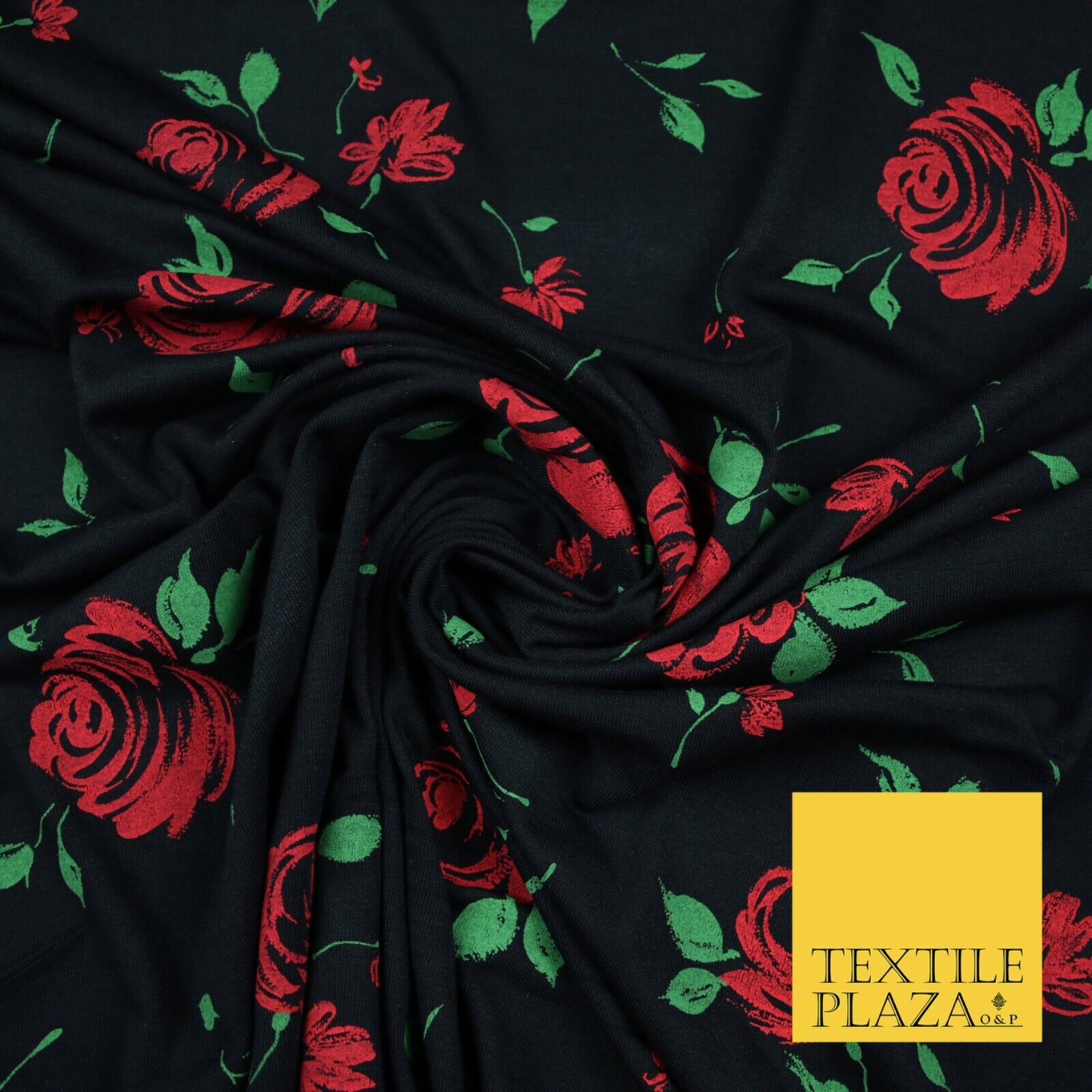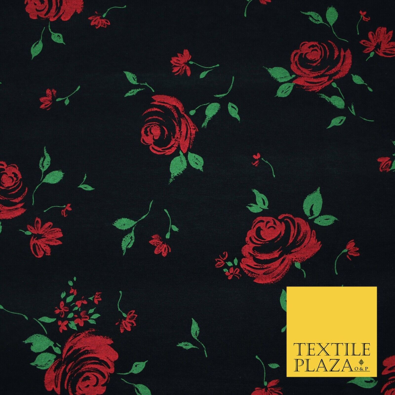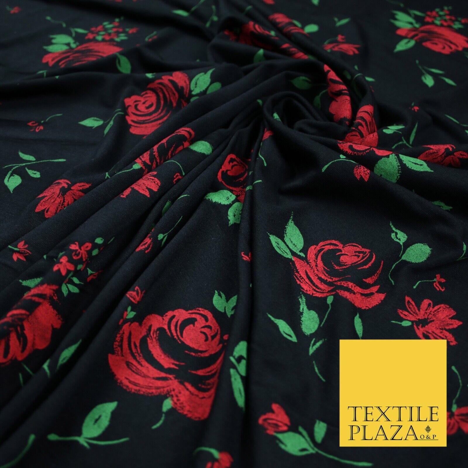 Black Red Roses Floral Print Soft Touch Stretch Jersey Fabric 56" 6735