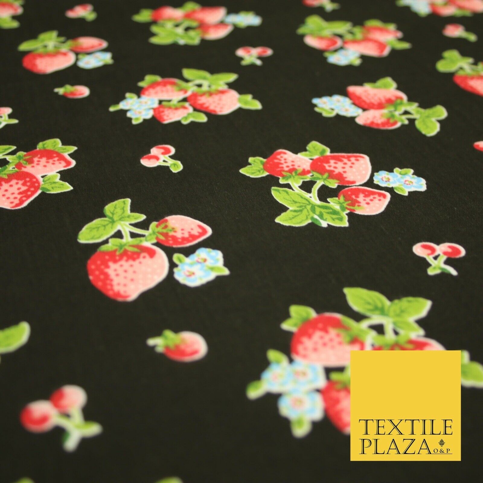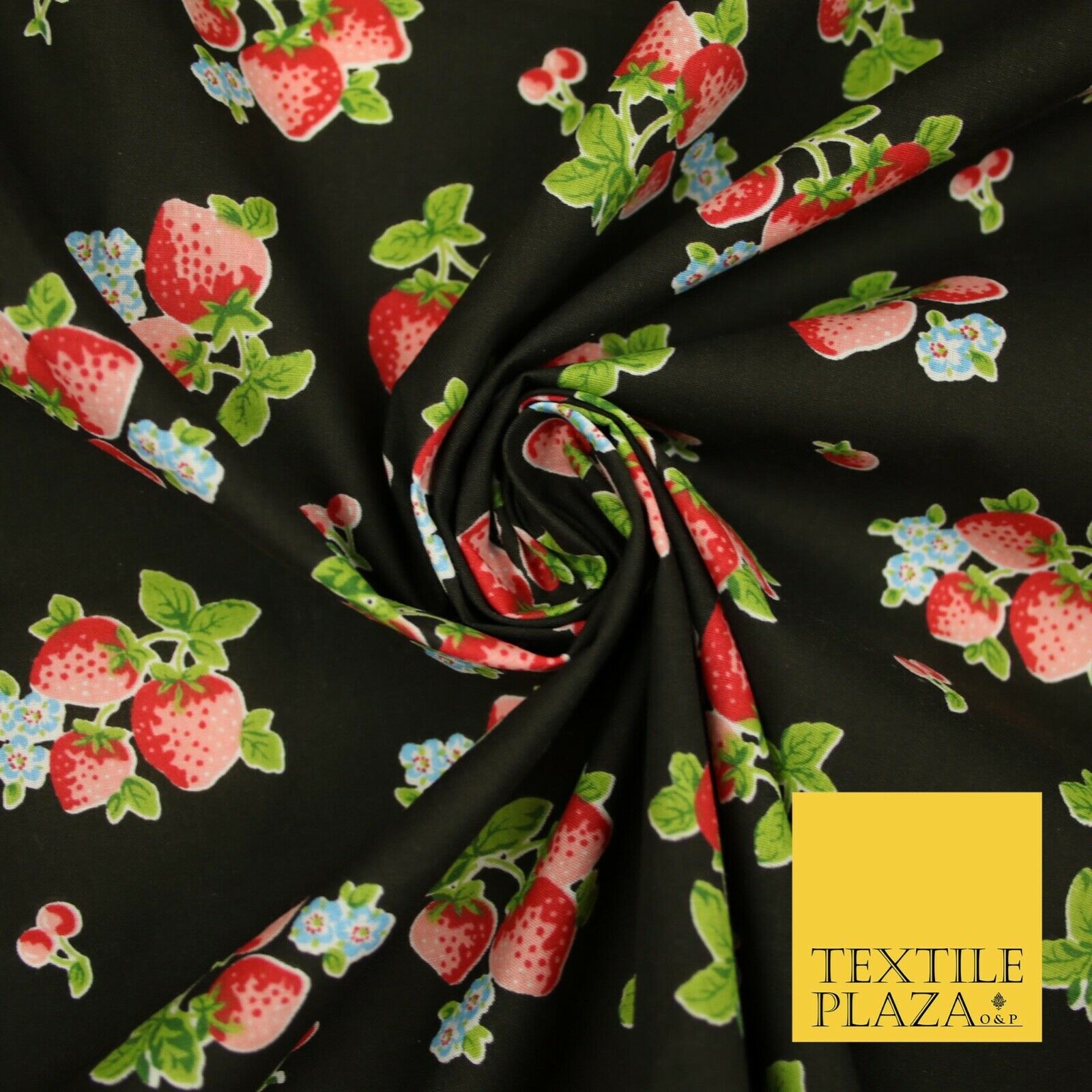 Black Red Strawberry Bunch Printed Poly Cotton Mask Fabric Polycotton 45" 3795