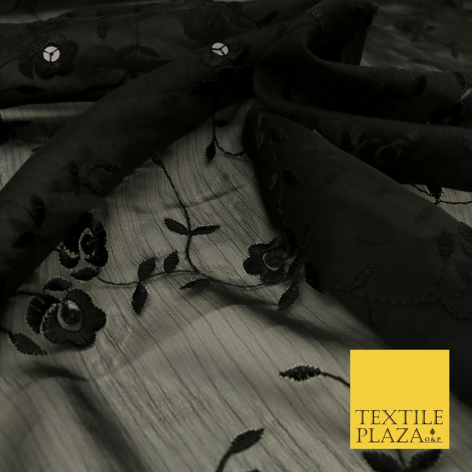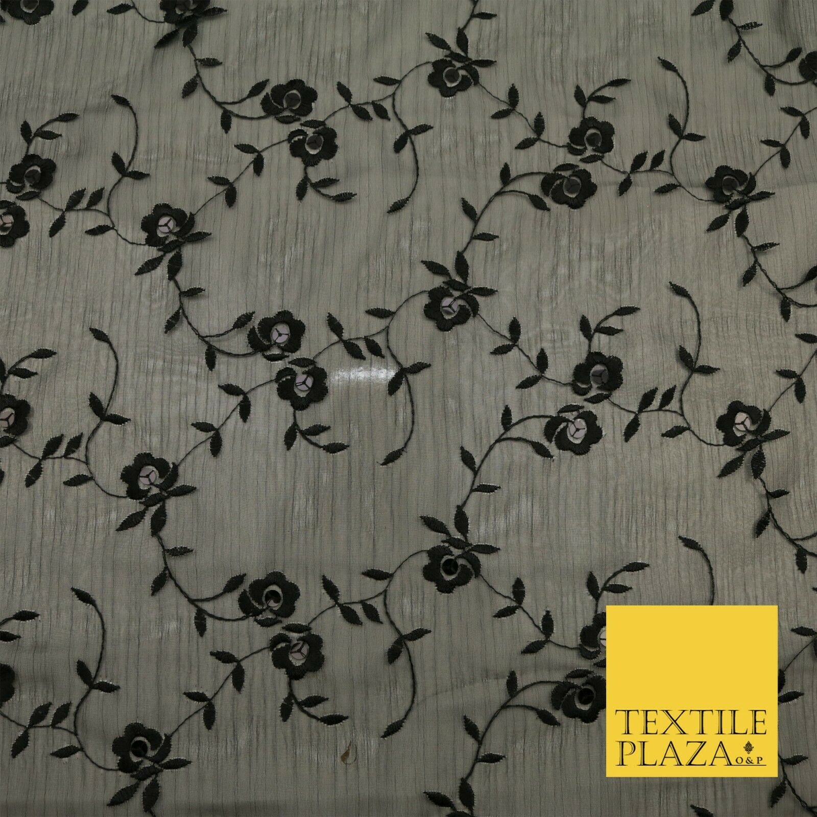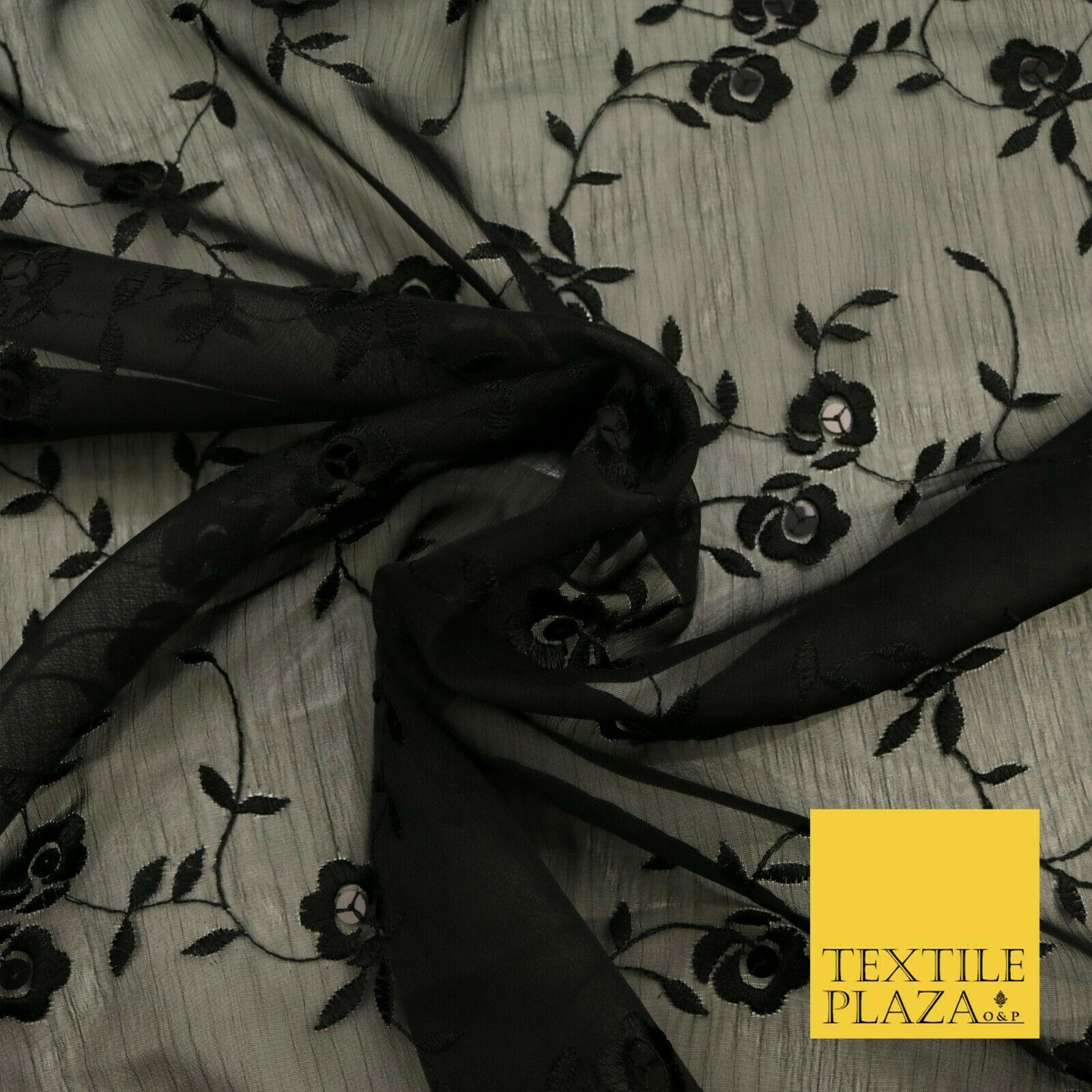 Black Rose Stem Threadwork Chiffon Georgette Dress Fabric Fancy 1600