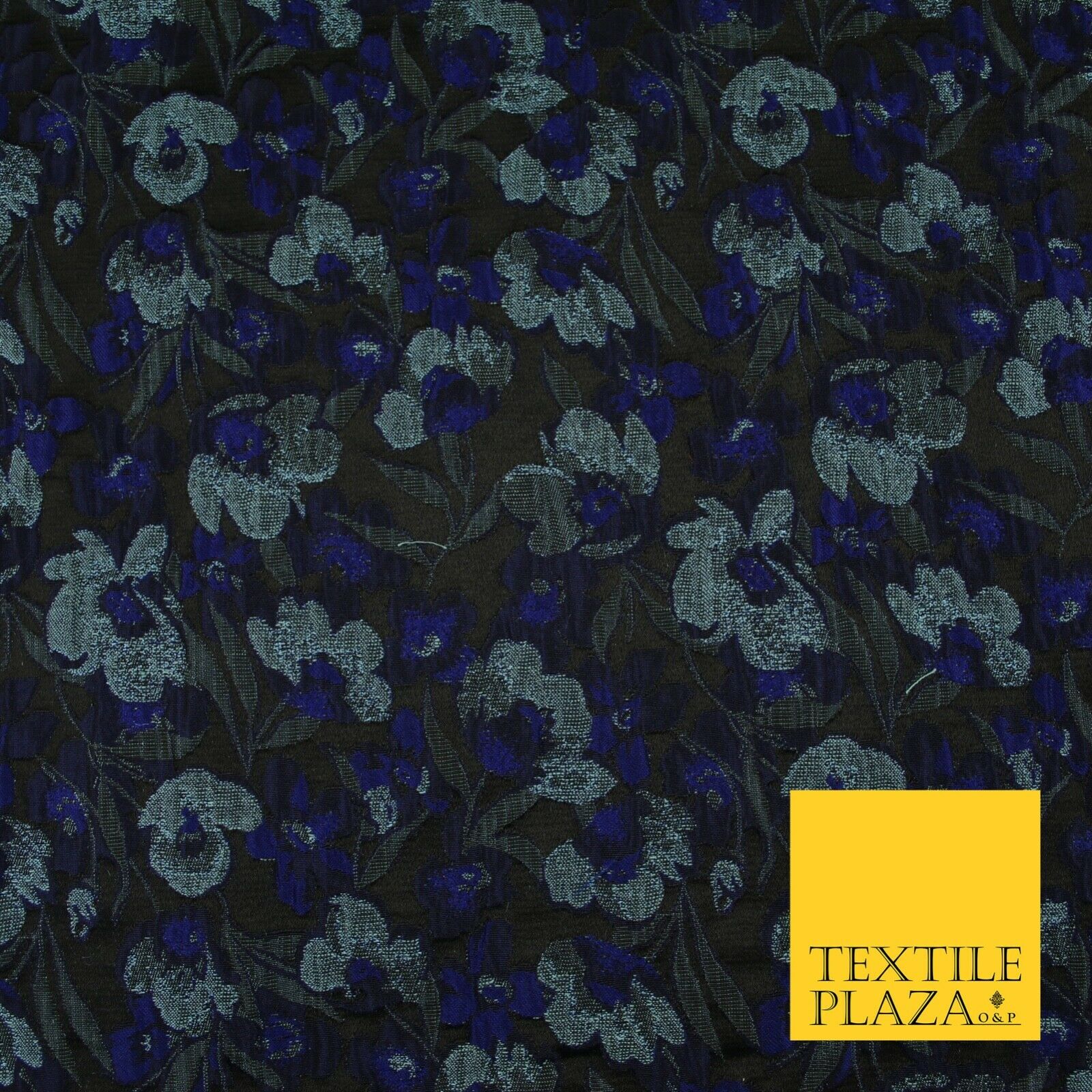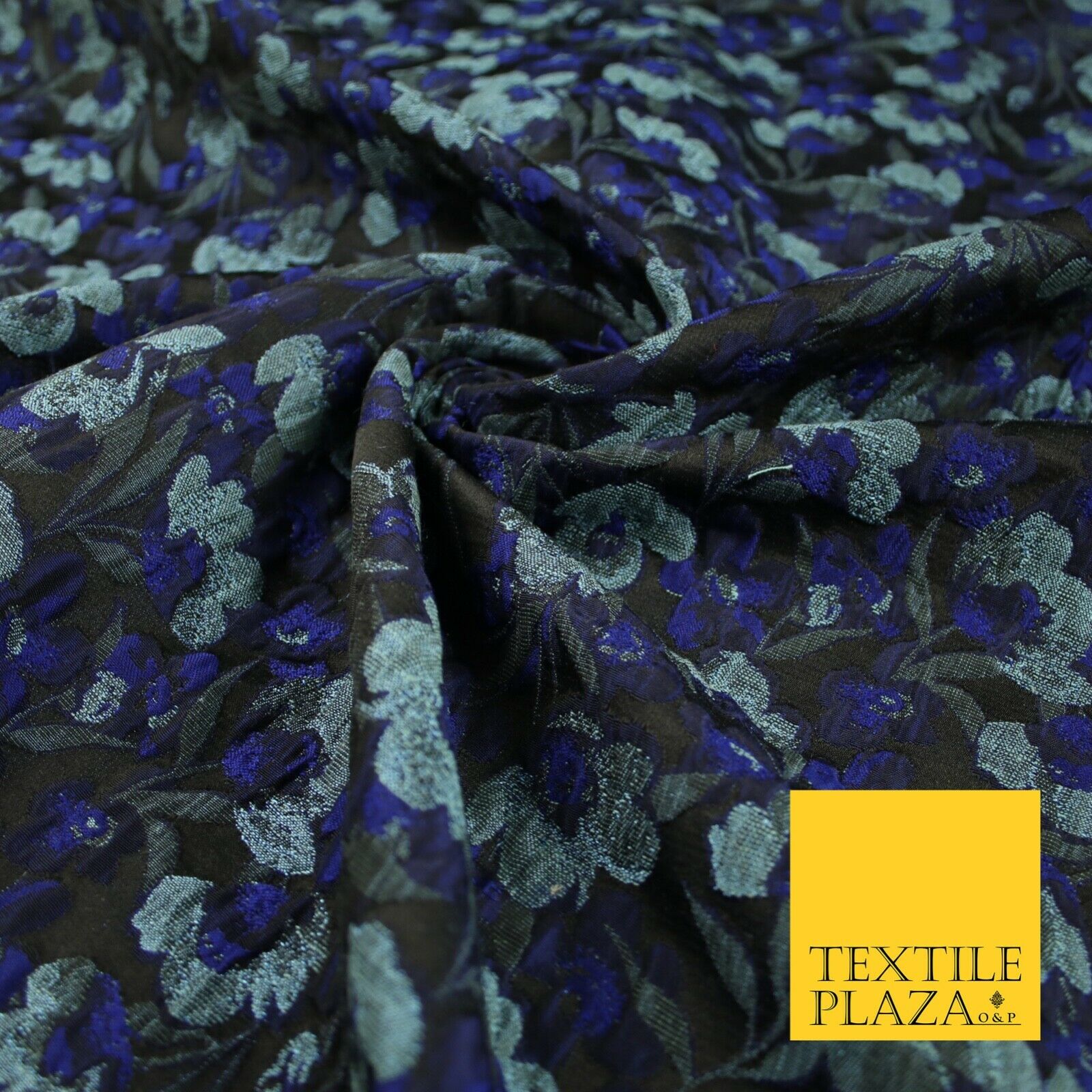 Black Royal Blue Duck Egg Intense Pansy Floral Textured Brocade Fabric 7148