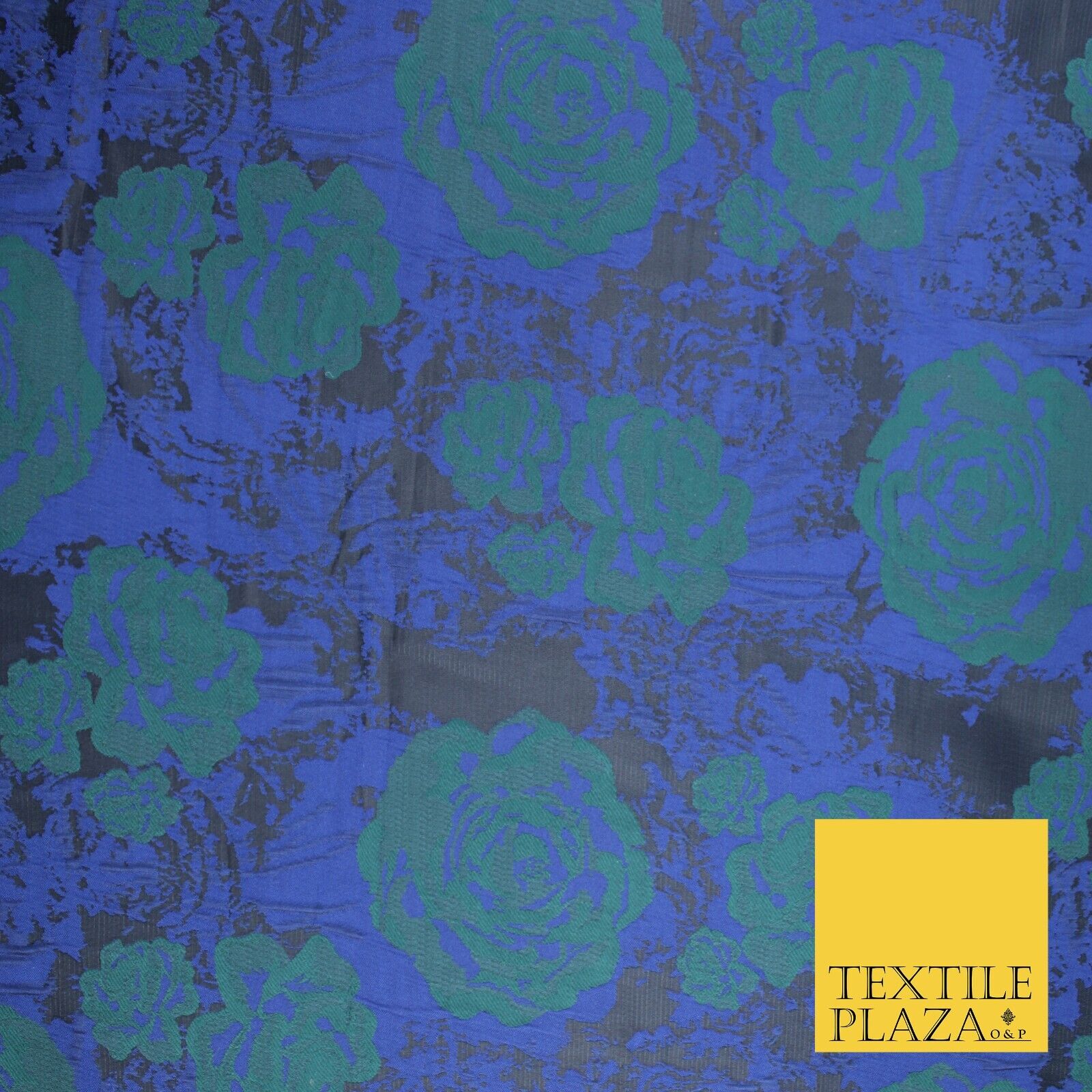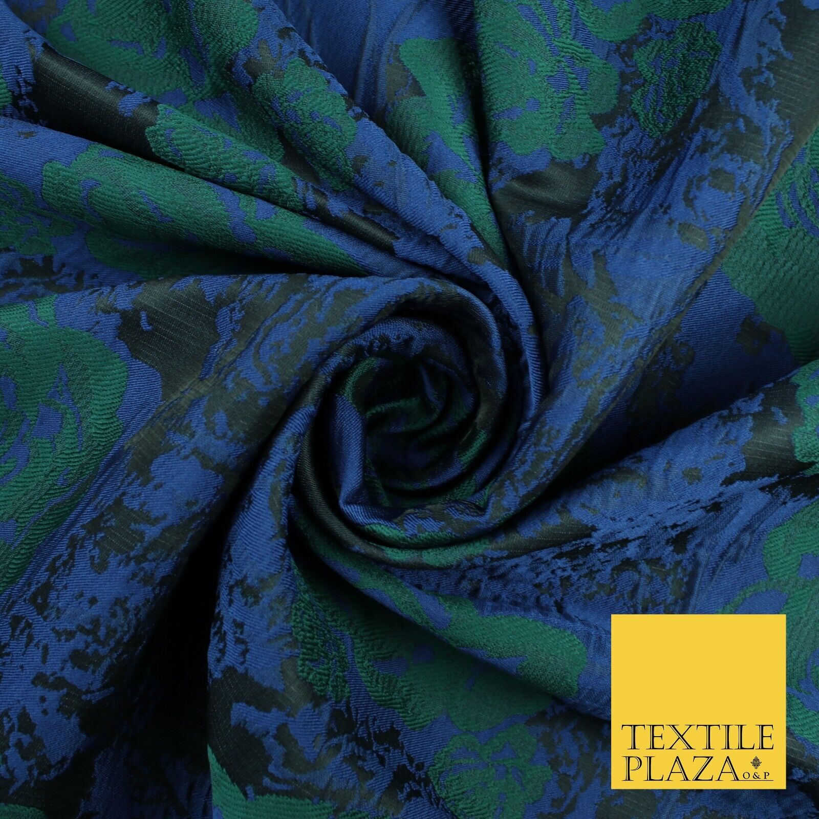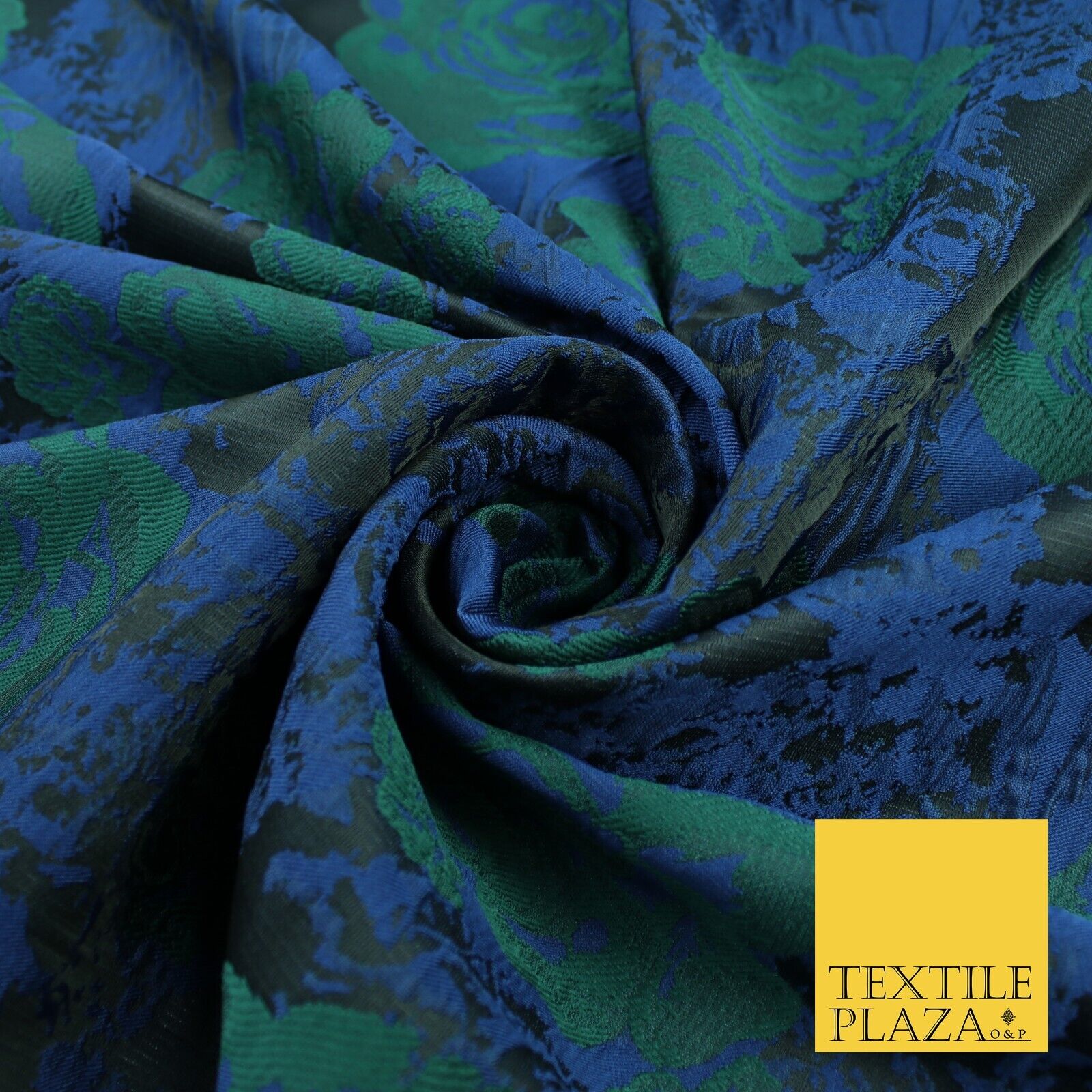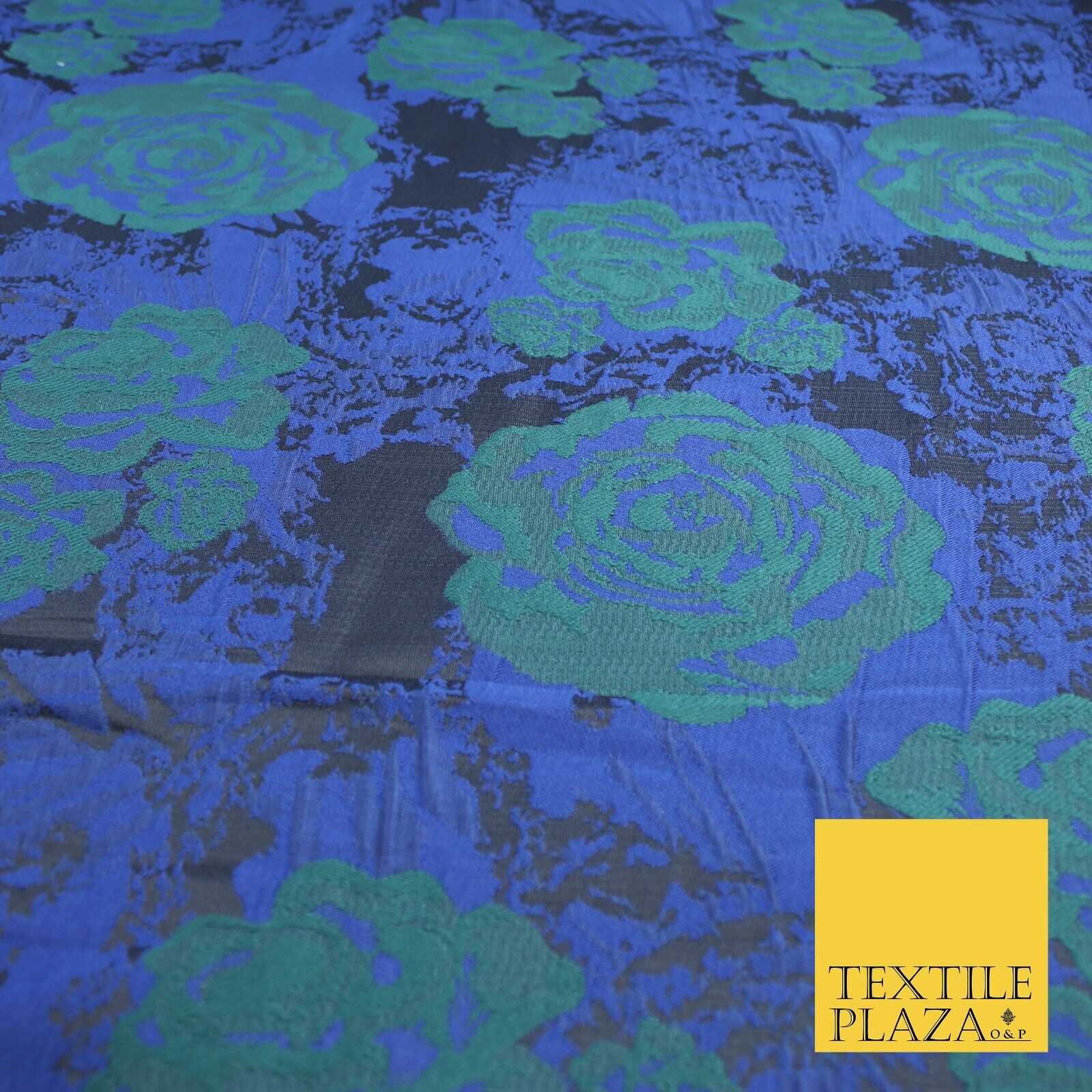 Black Royal Blue Green Floral Roses Bloom Textured Brocade Jacquard Fabric 8525