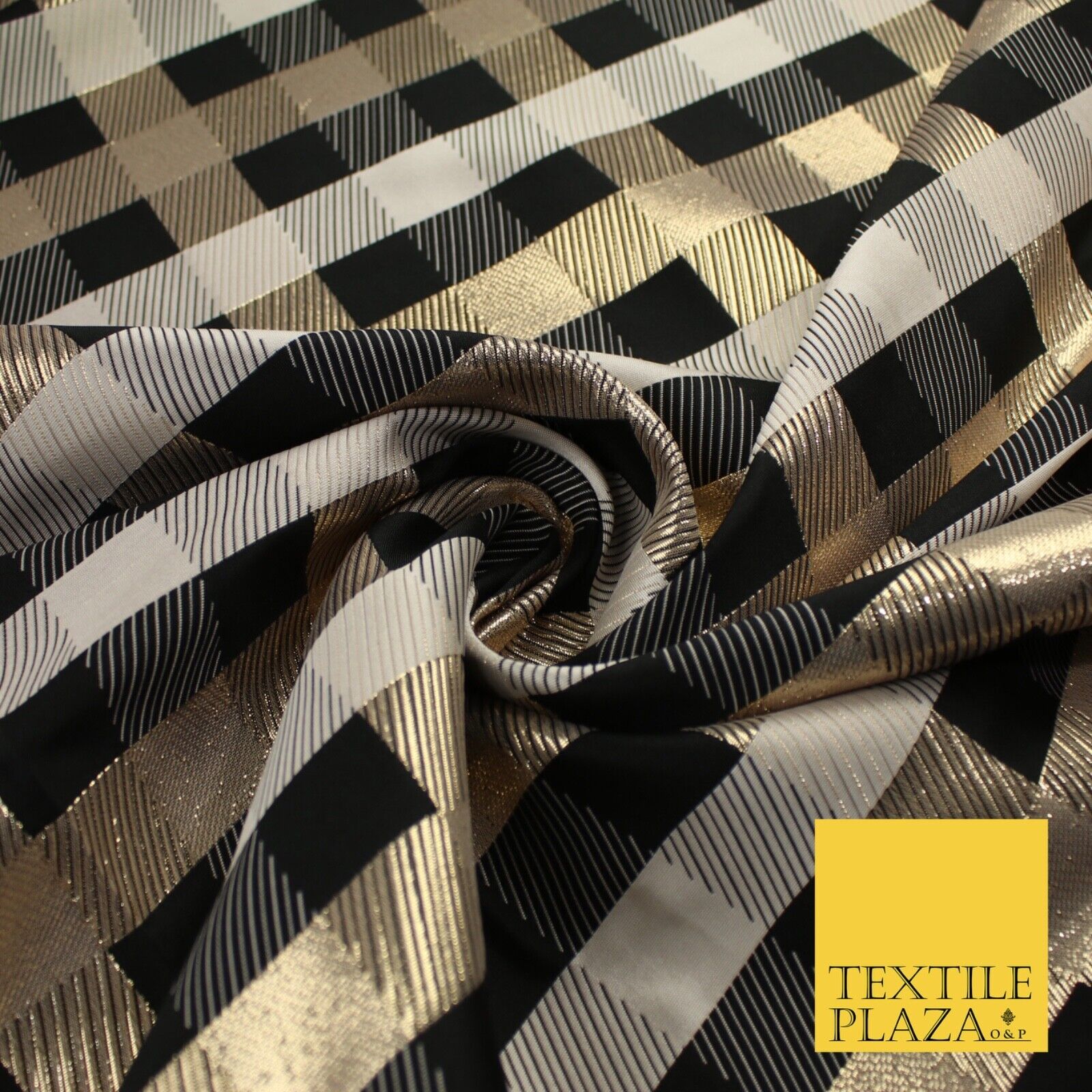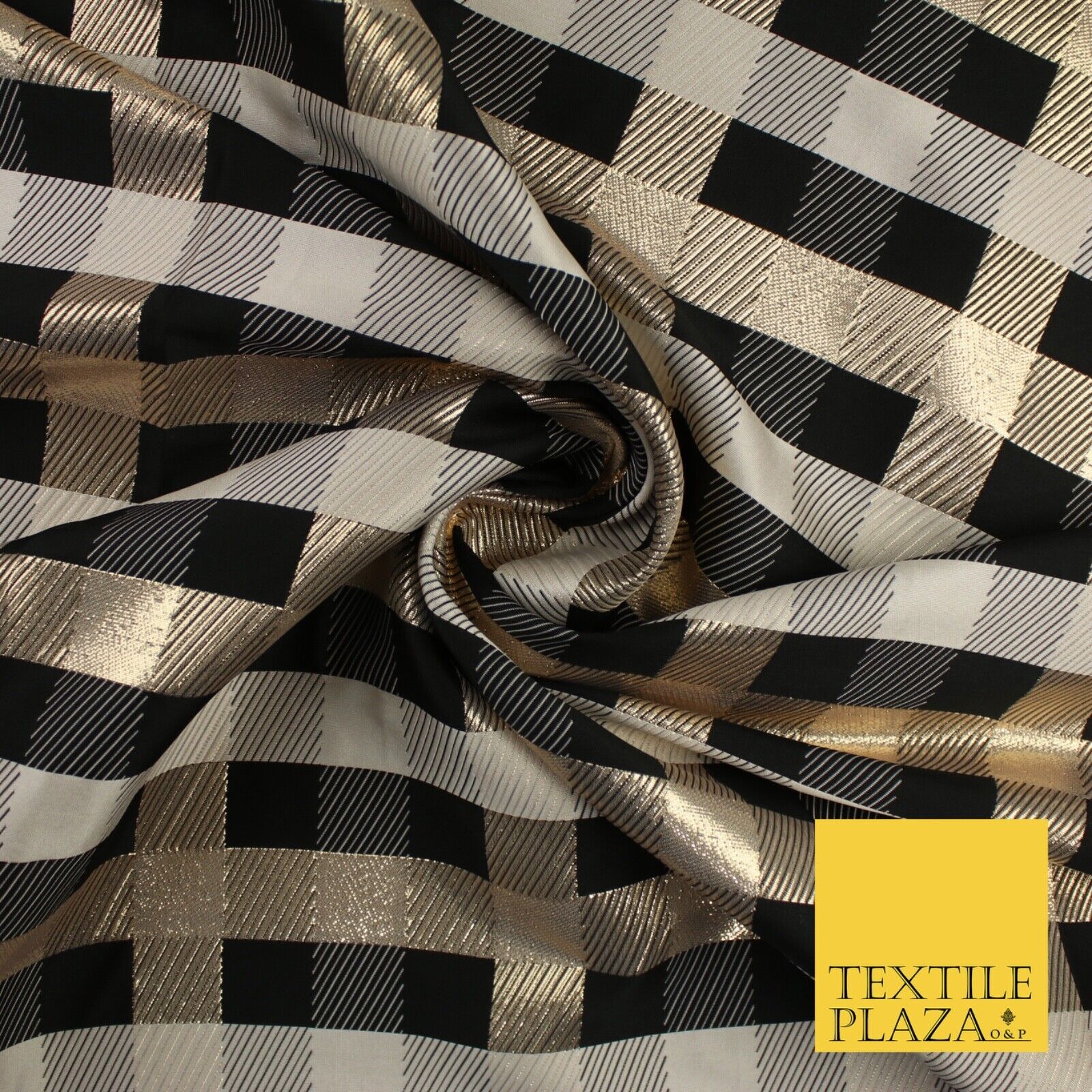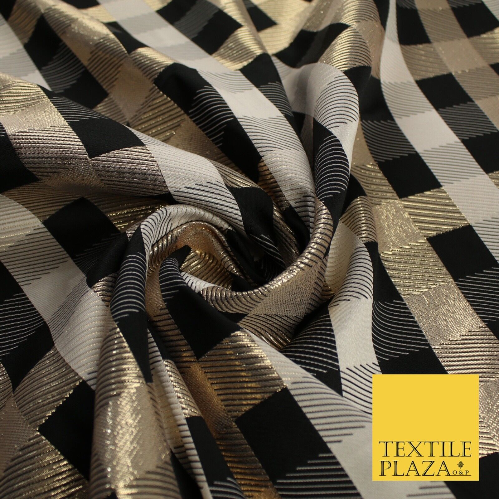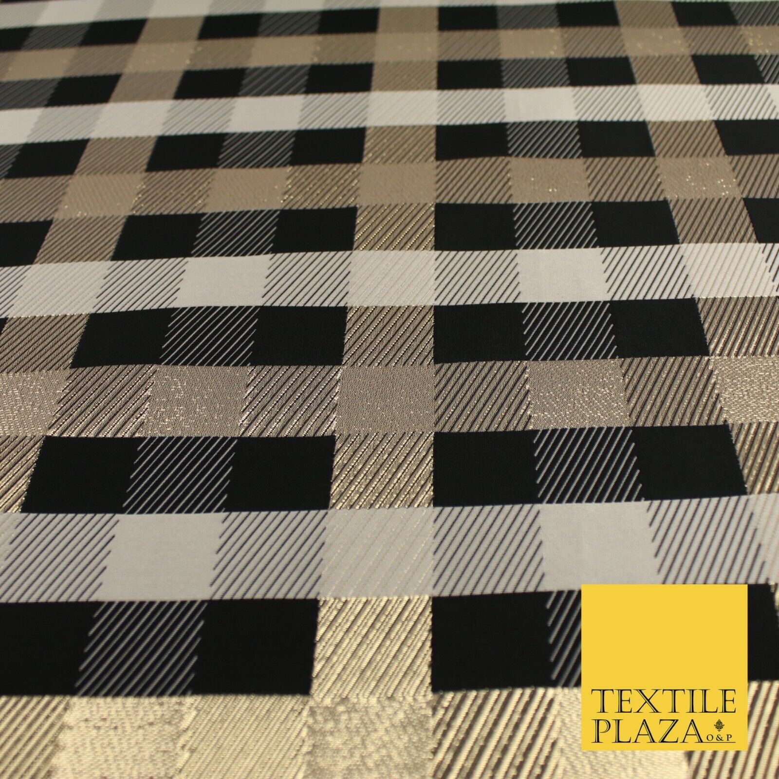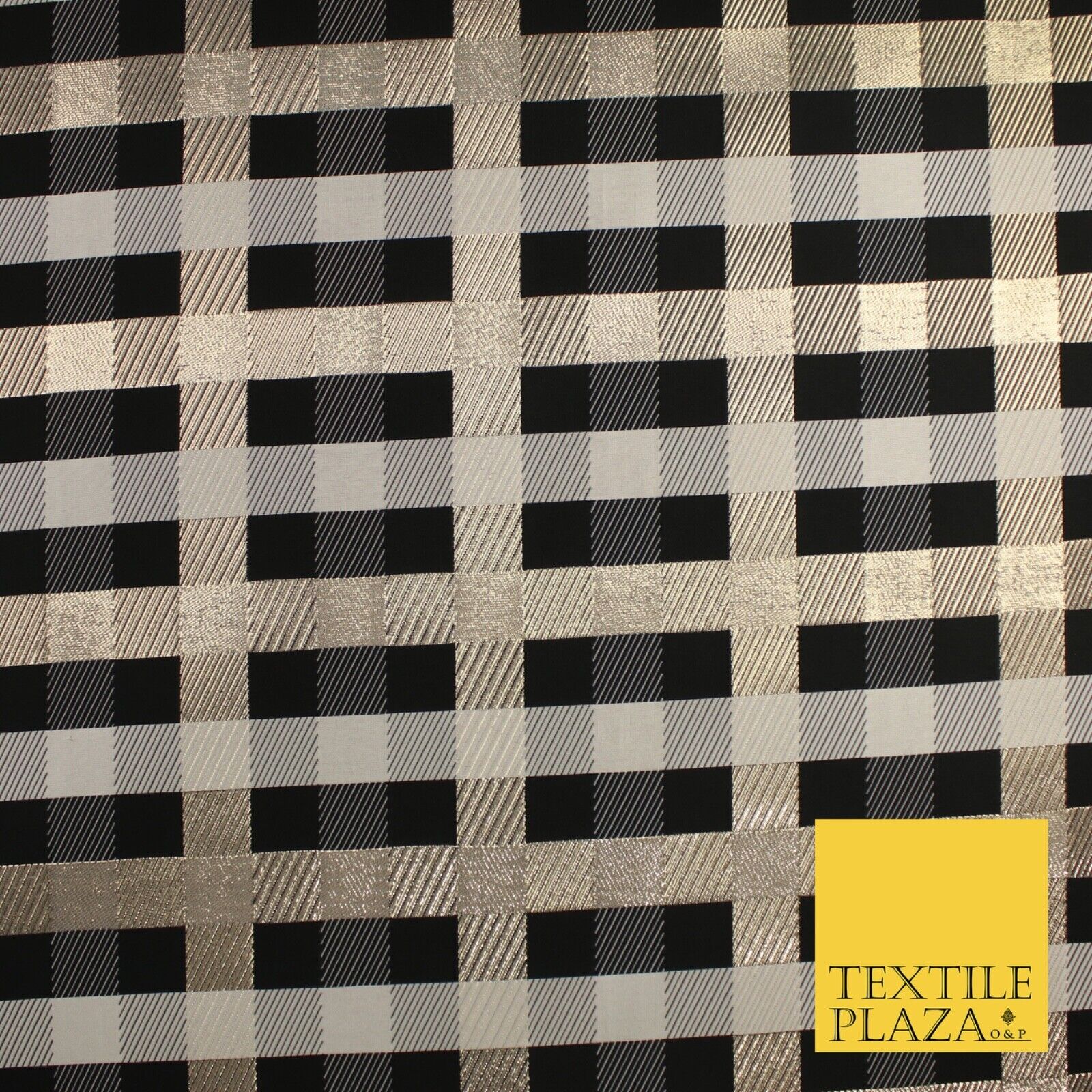 Black Stone Gold Tartan Check Metallic Textured Brocade Dress Fabric 9918