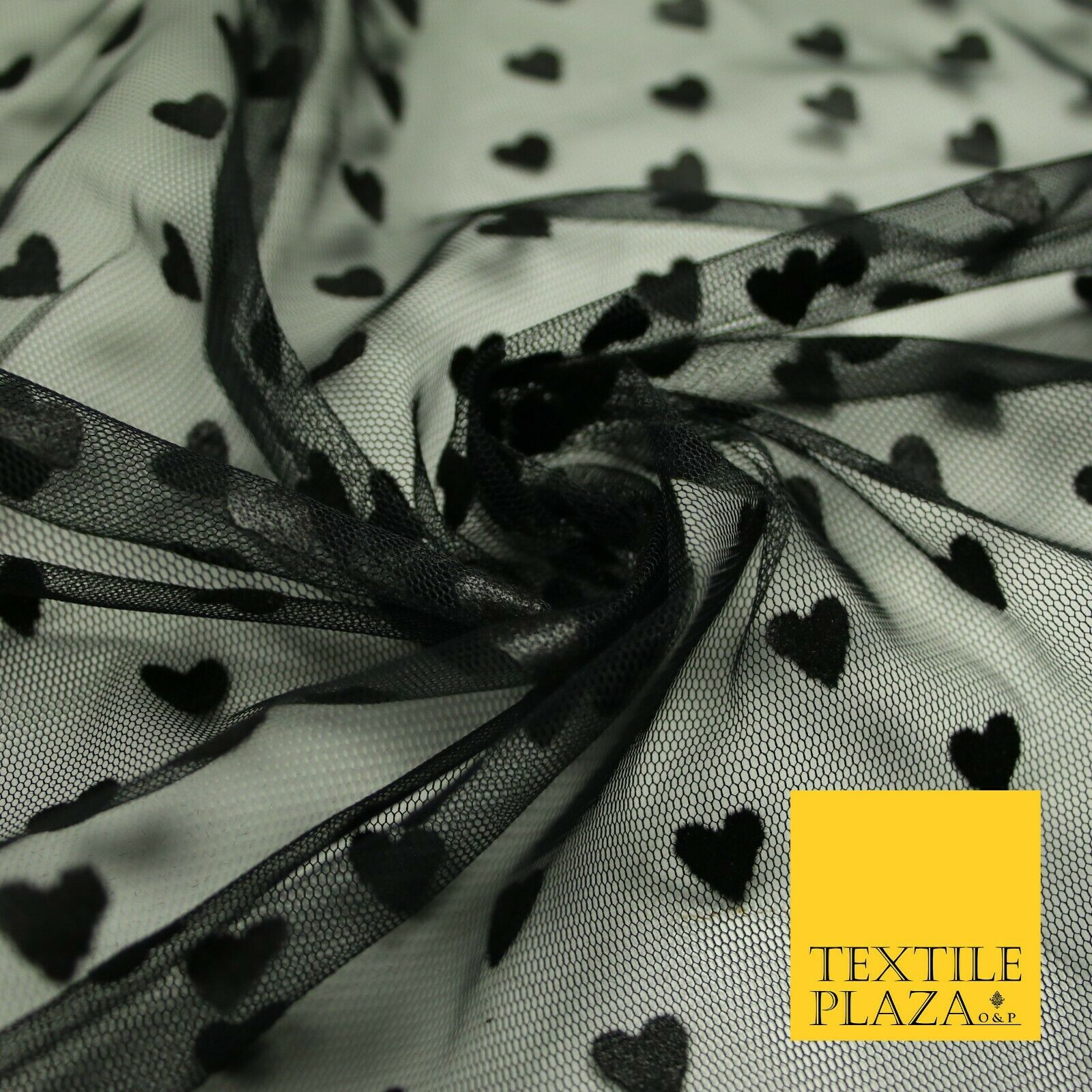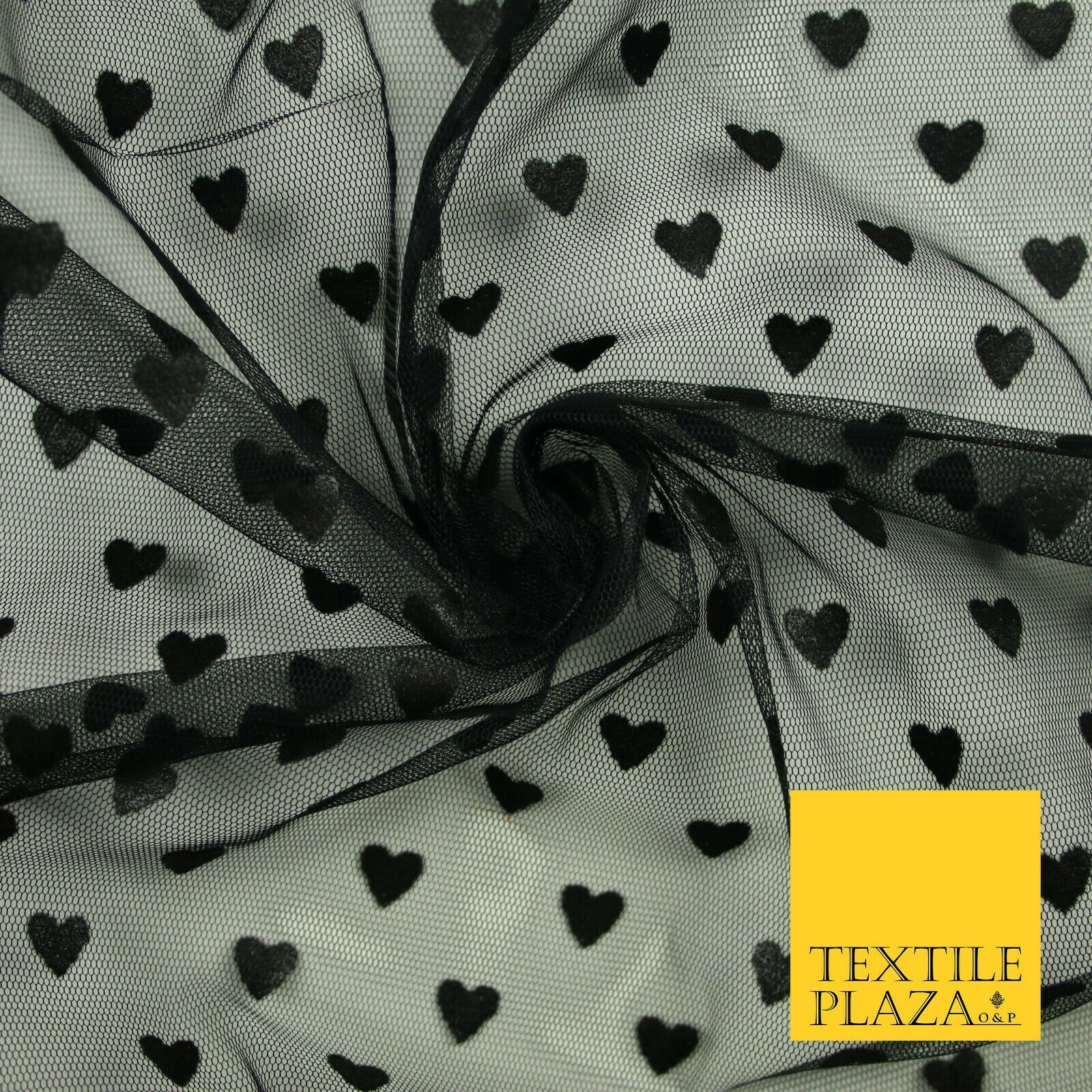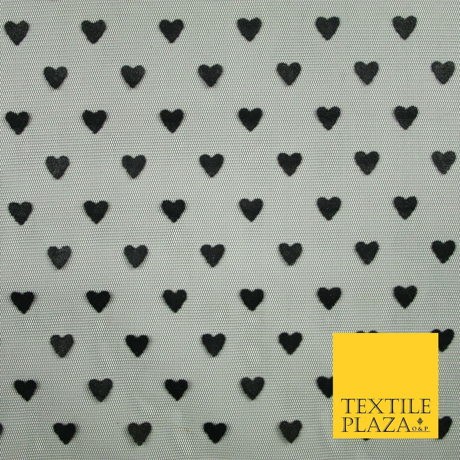 Black Valentine Love Hearts Flocked Power Mesh Net Stretch Dress Fabric 58" 7074