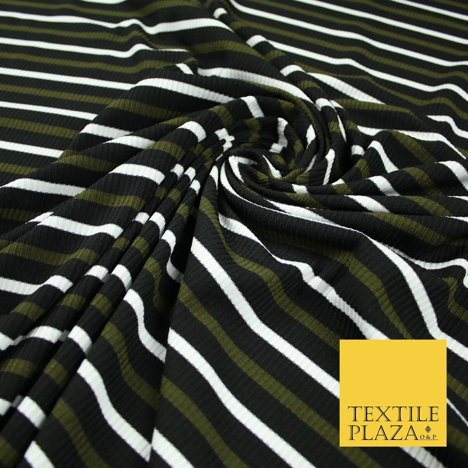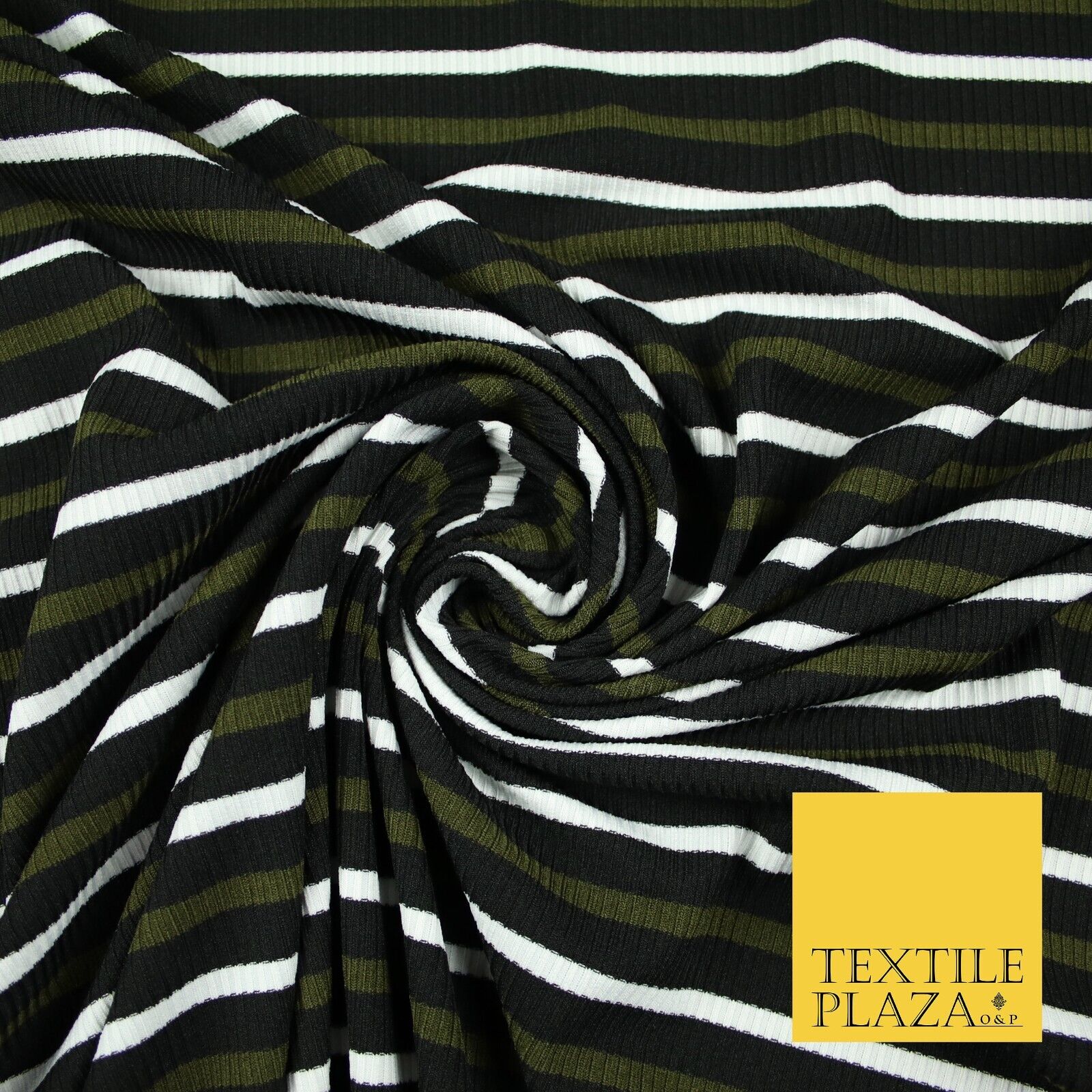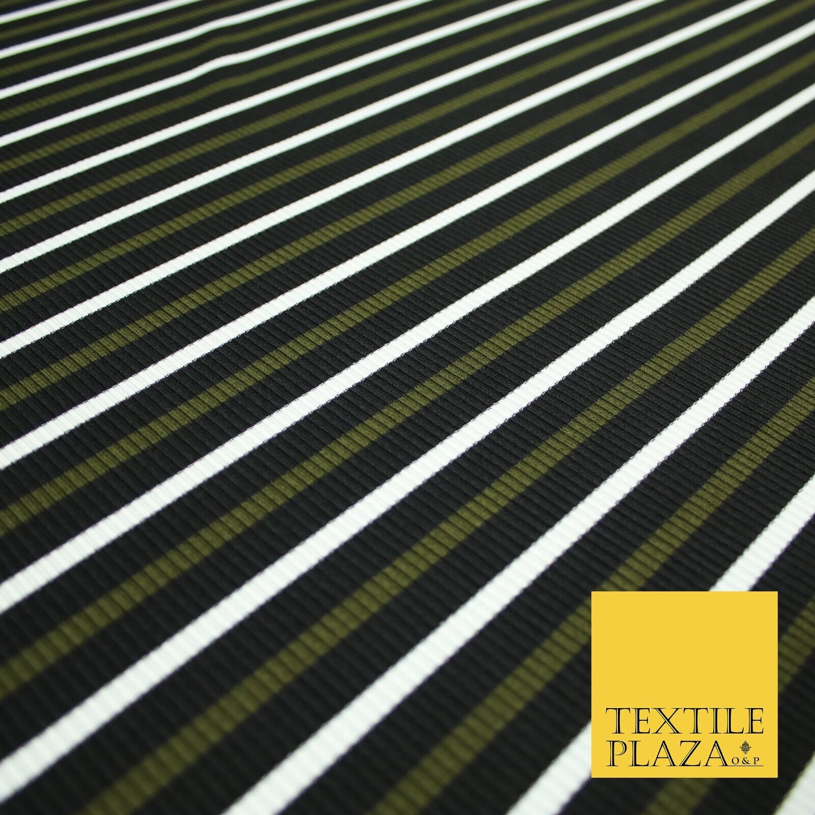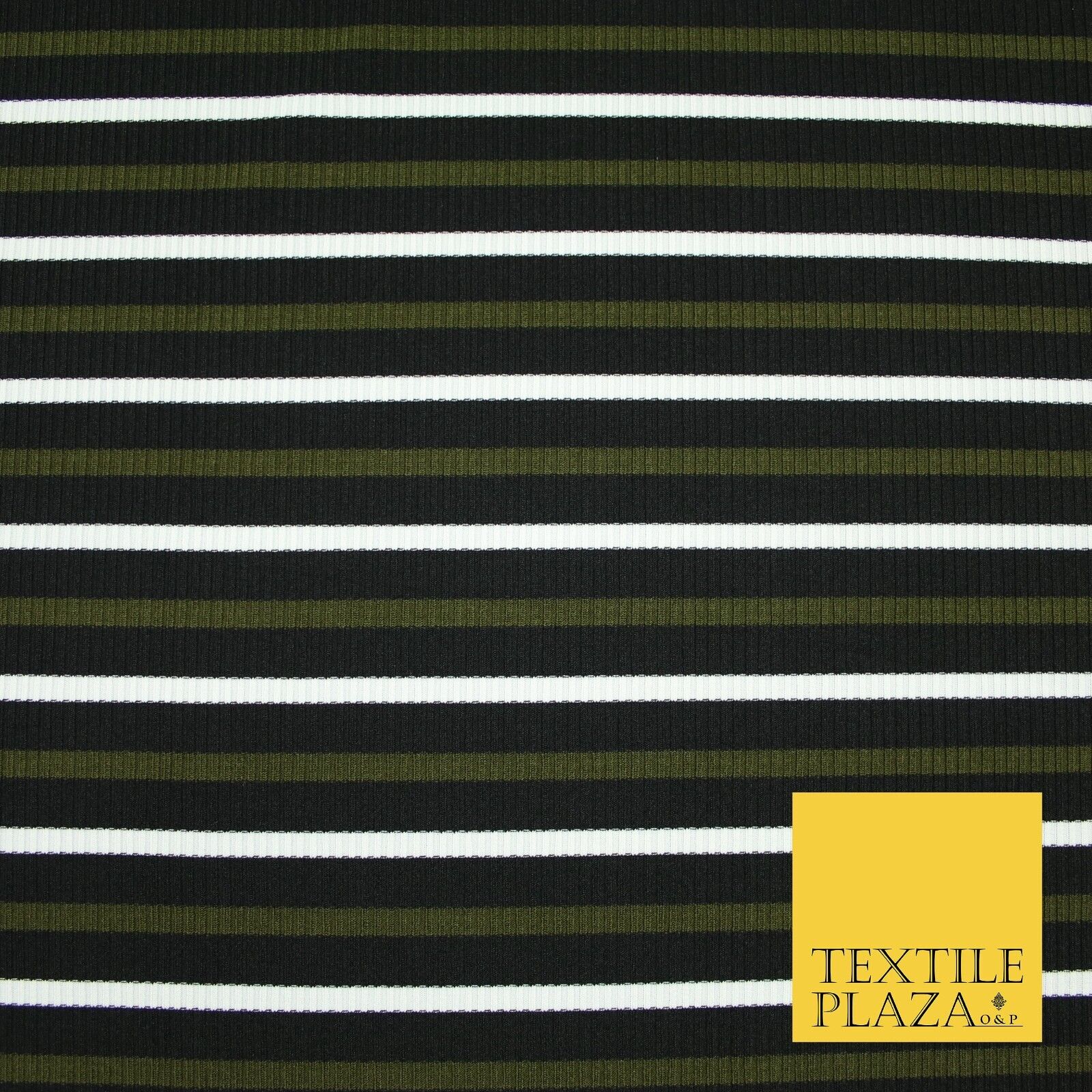Black, White & Khaki Green Ribbed Stripe Print Stretch Jersey Fabric 56" 6626