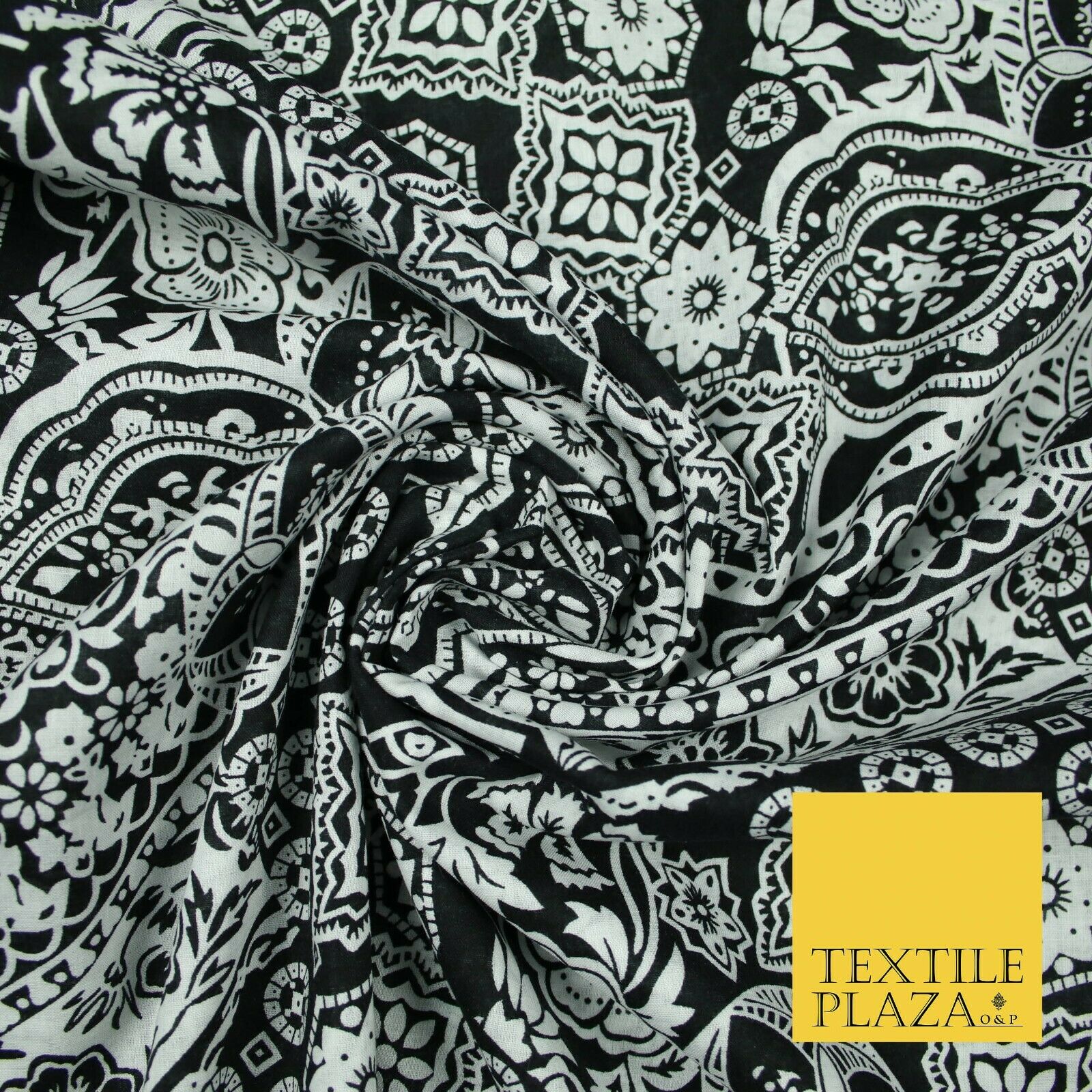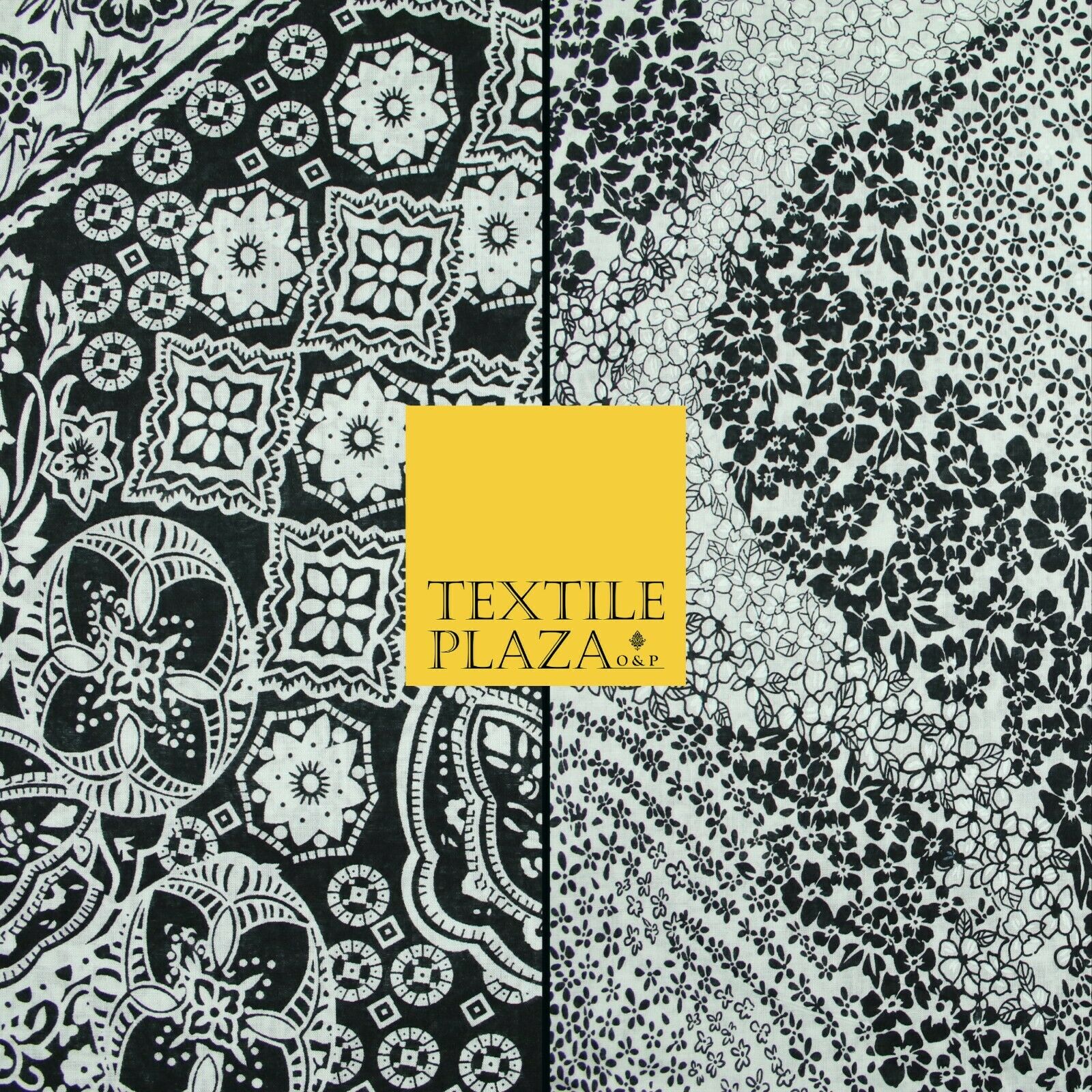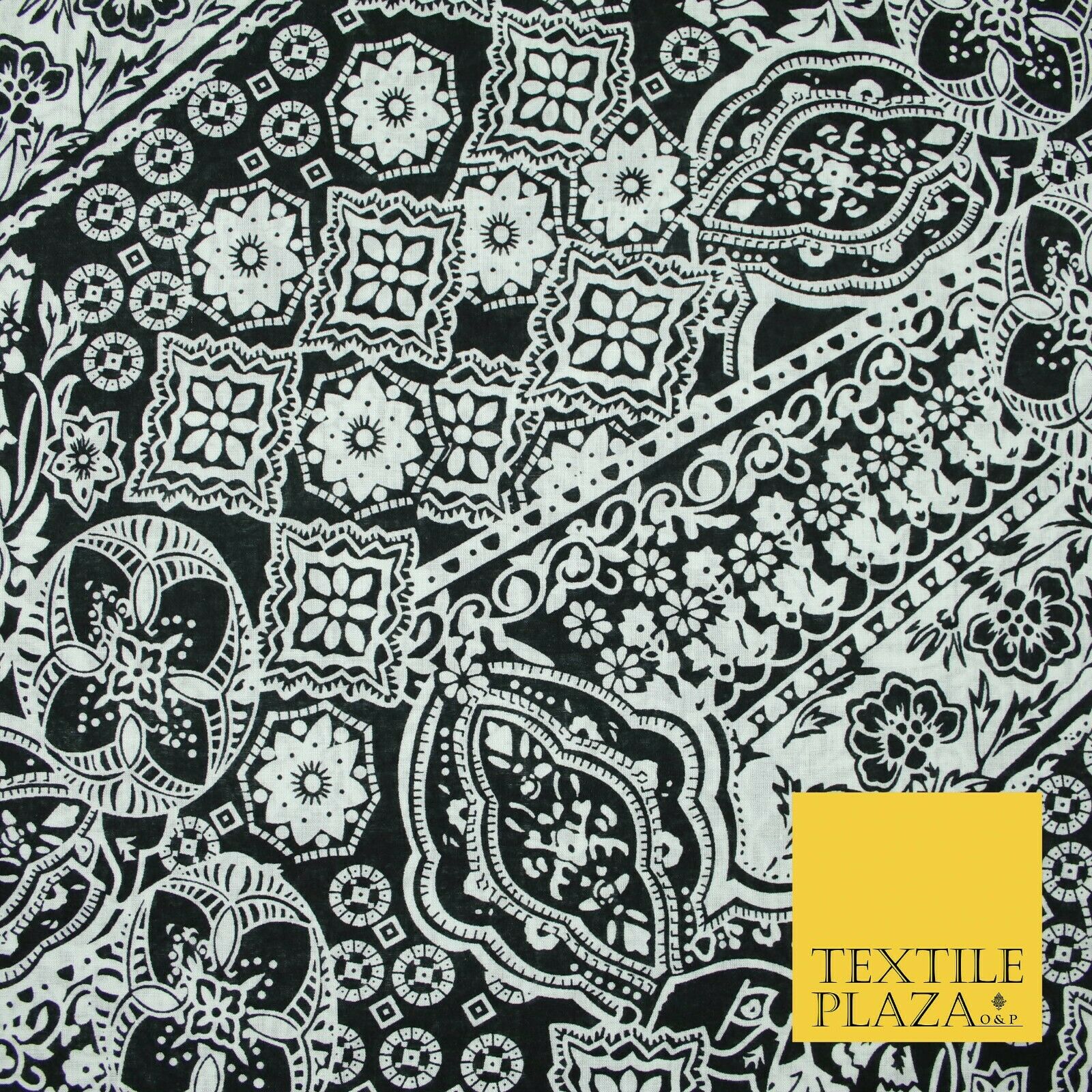 Black White Monotone Ornate Tribal Floral 100% Cotton Lawn Print Dress Fabrics