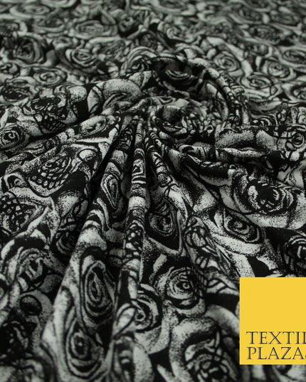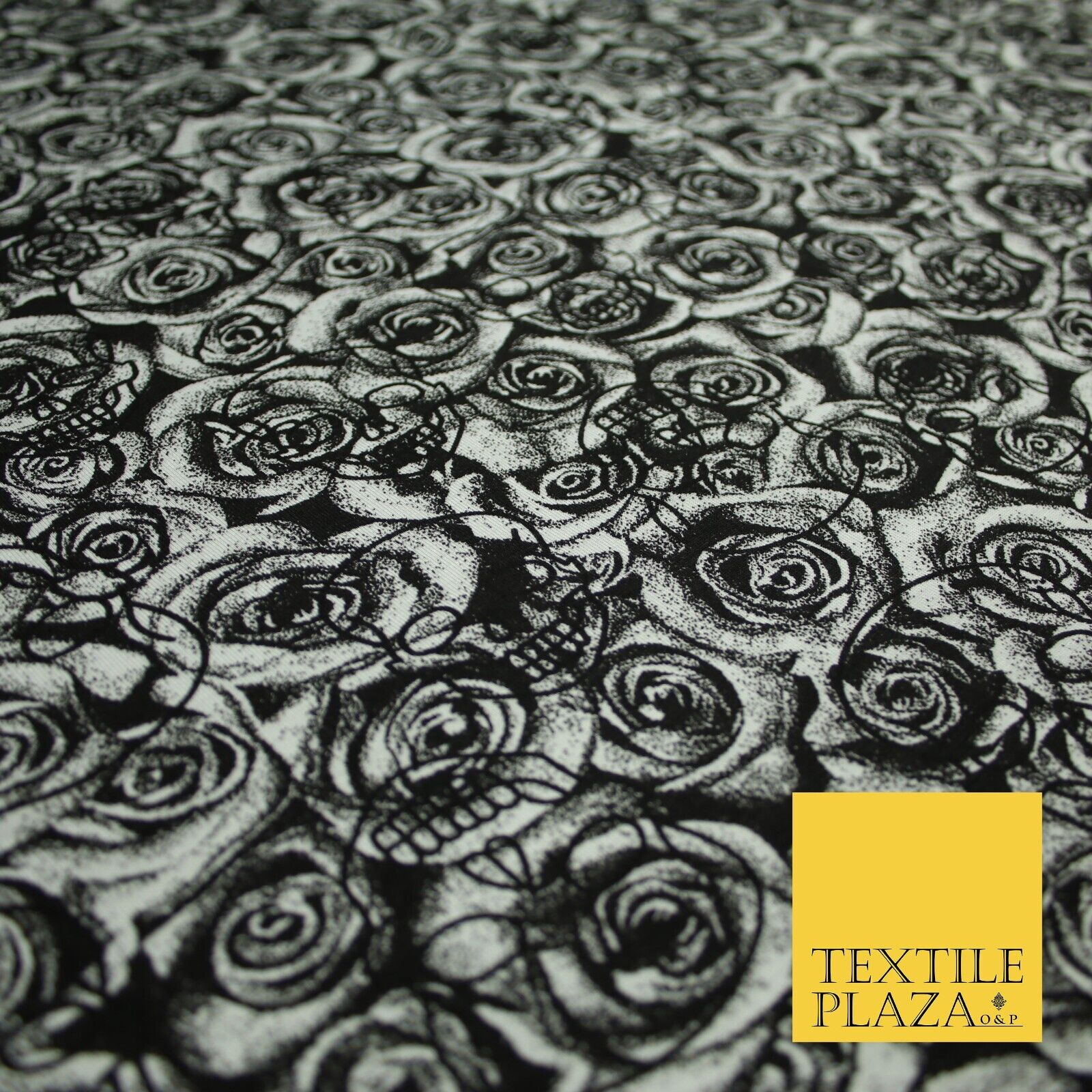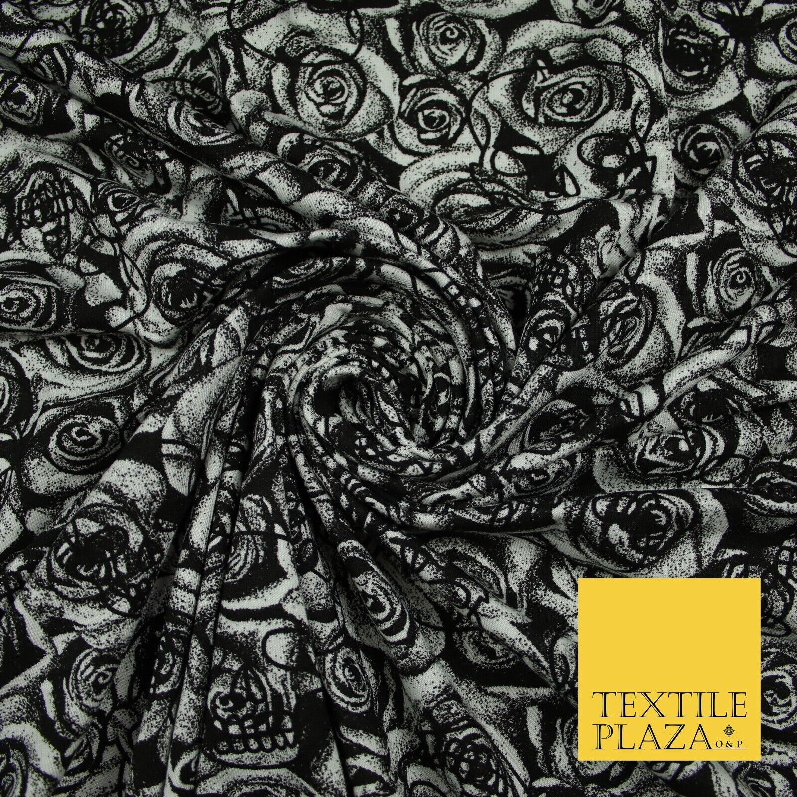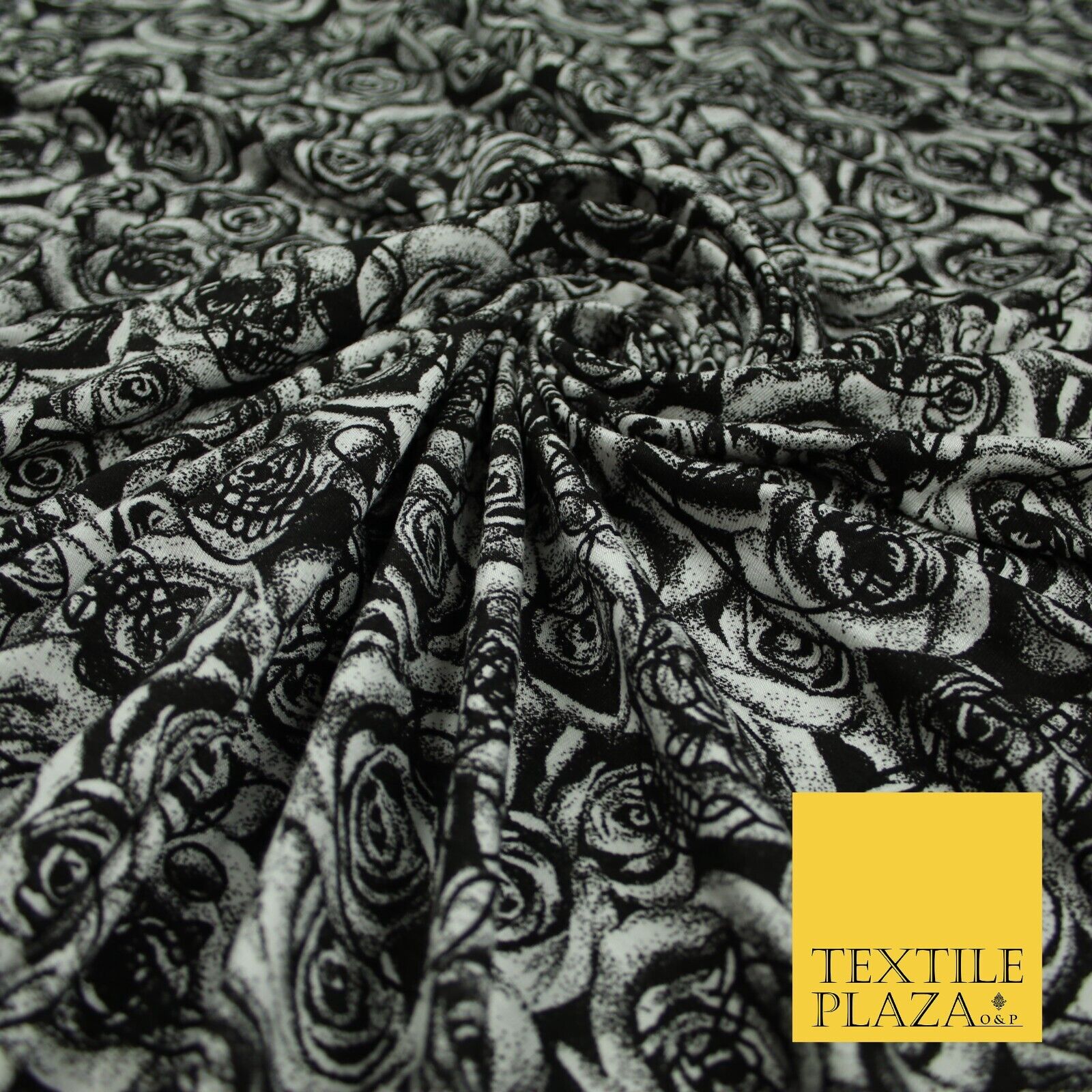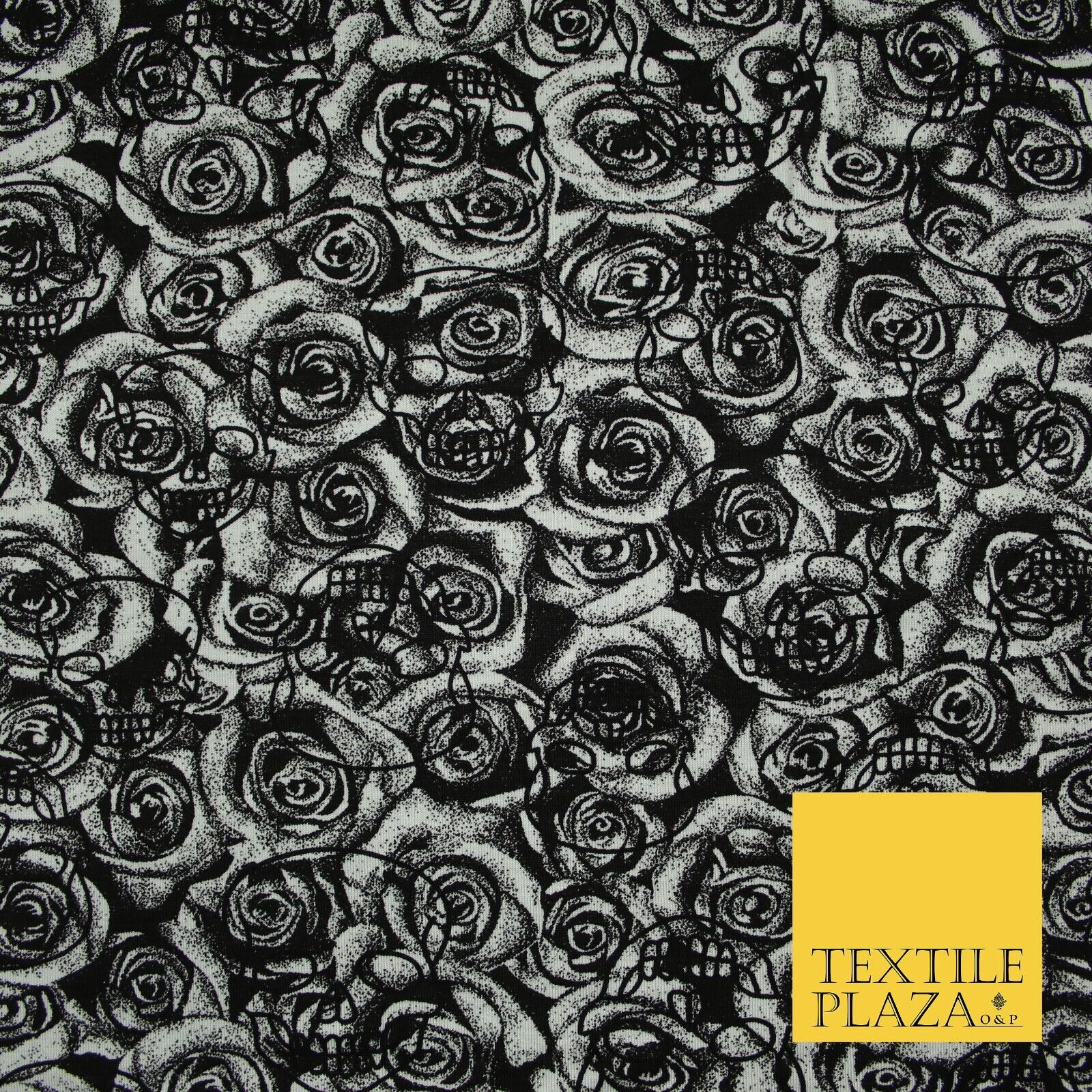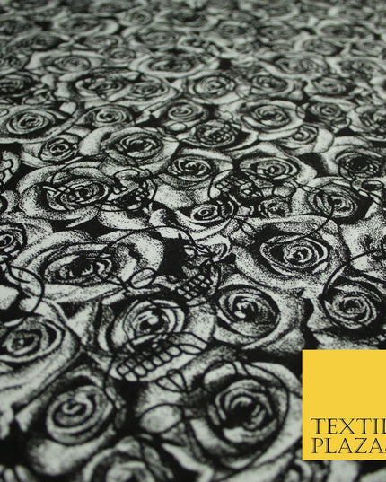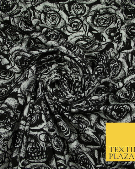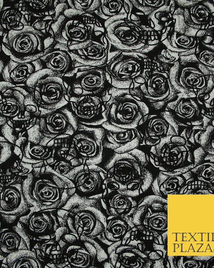 Black & White Skulls Roses Print Soft Stretch Jersey Fabric 56" 6647