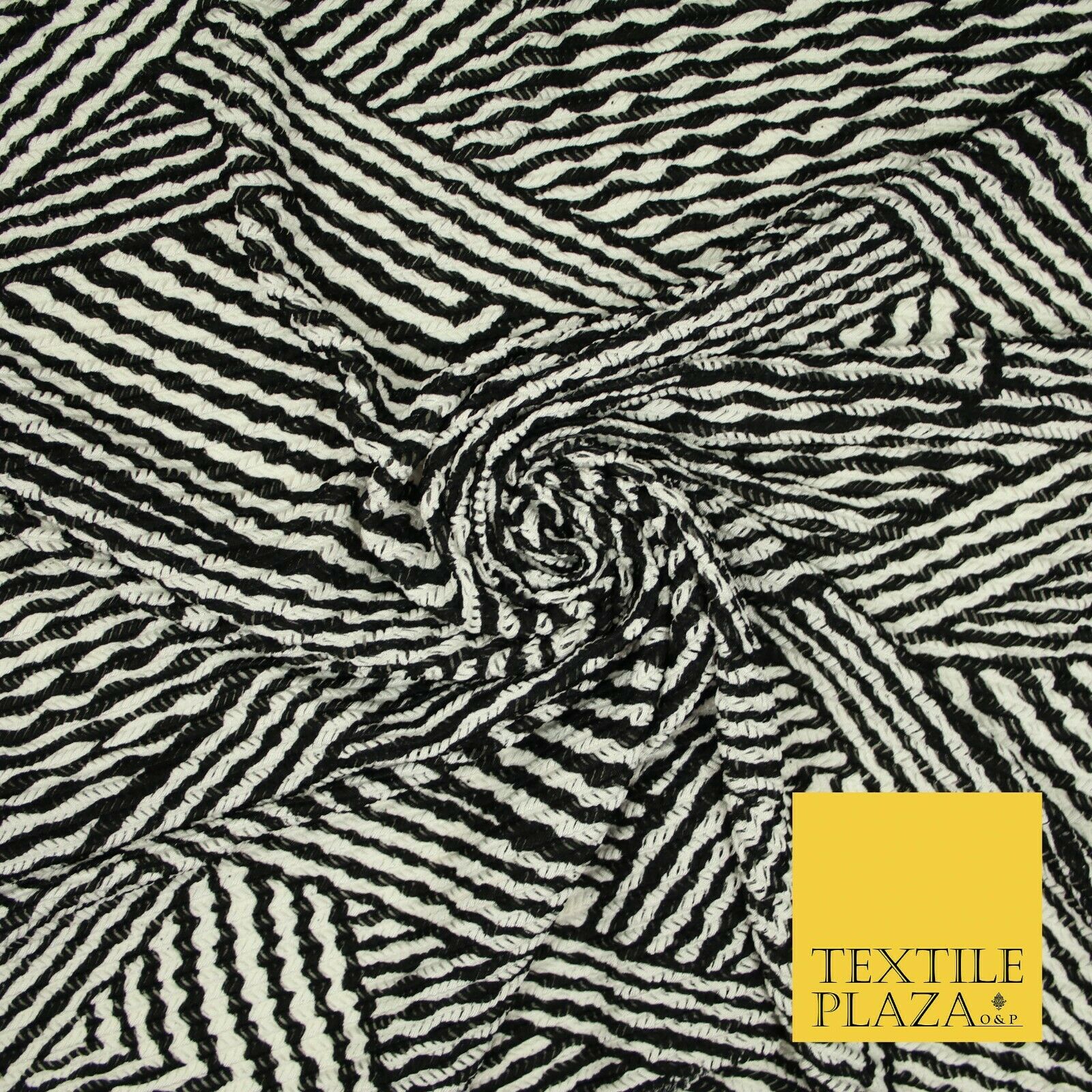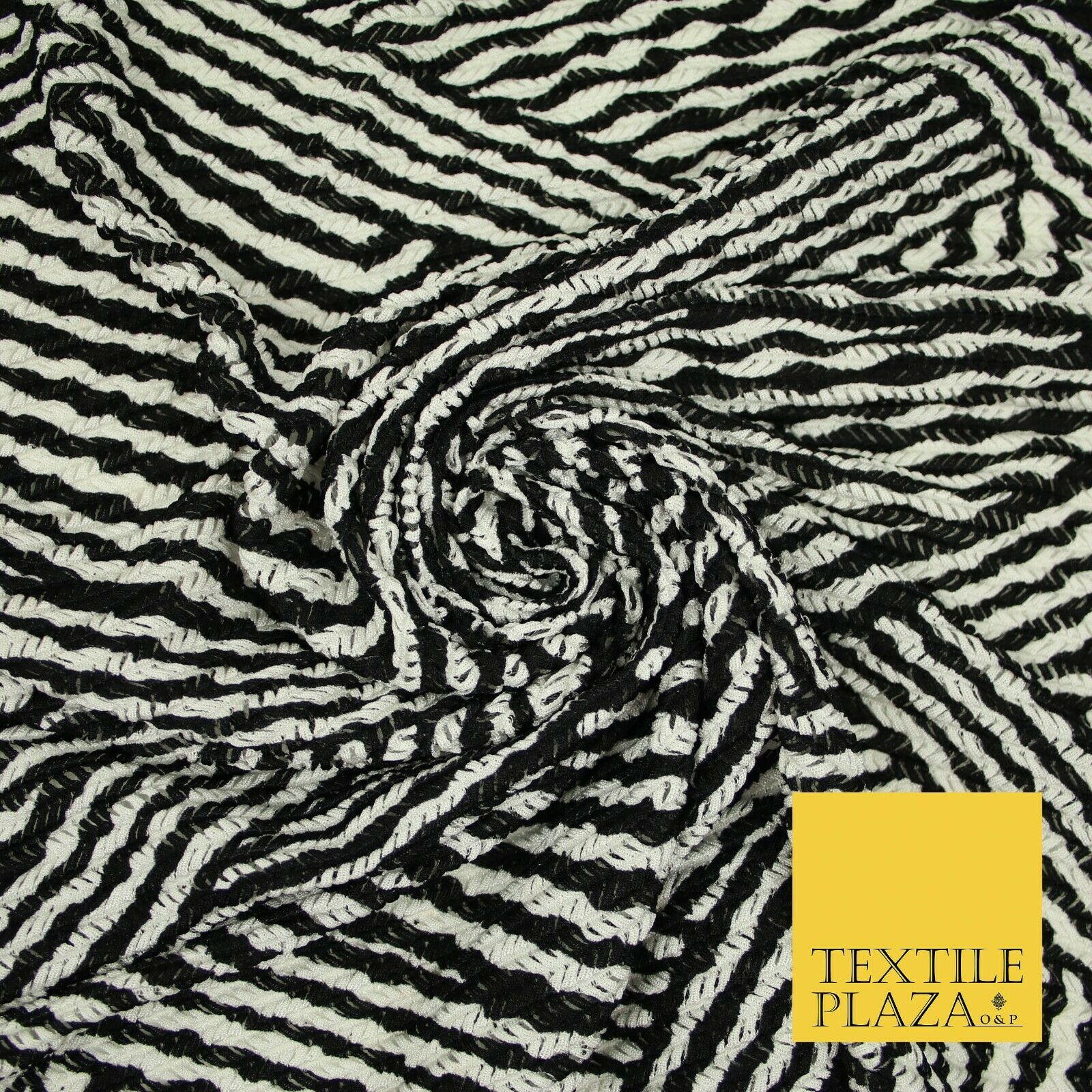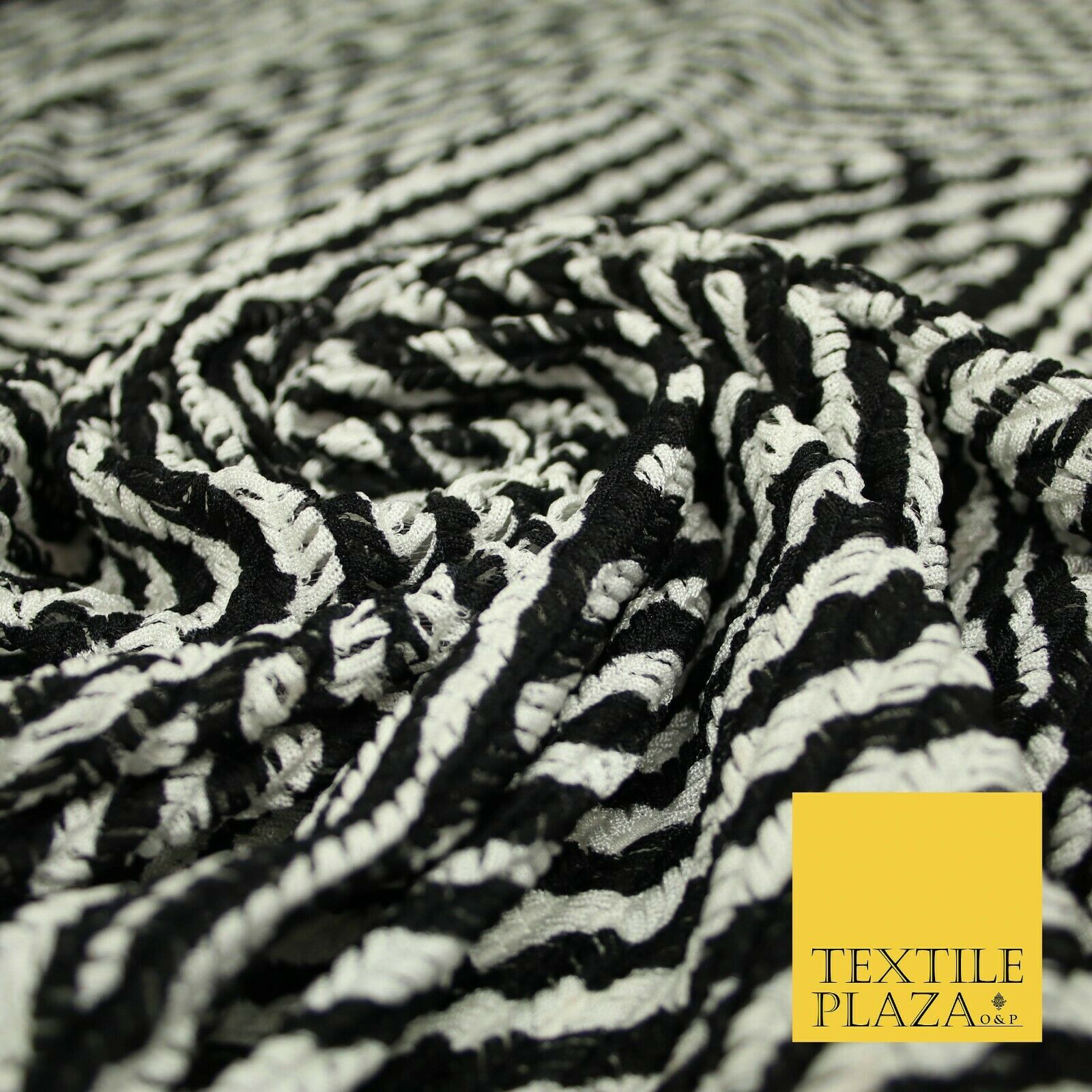 Black & White Striped Crinkle Pleated Herringbone Cuts Stretch Dress Fabric 4191
