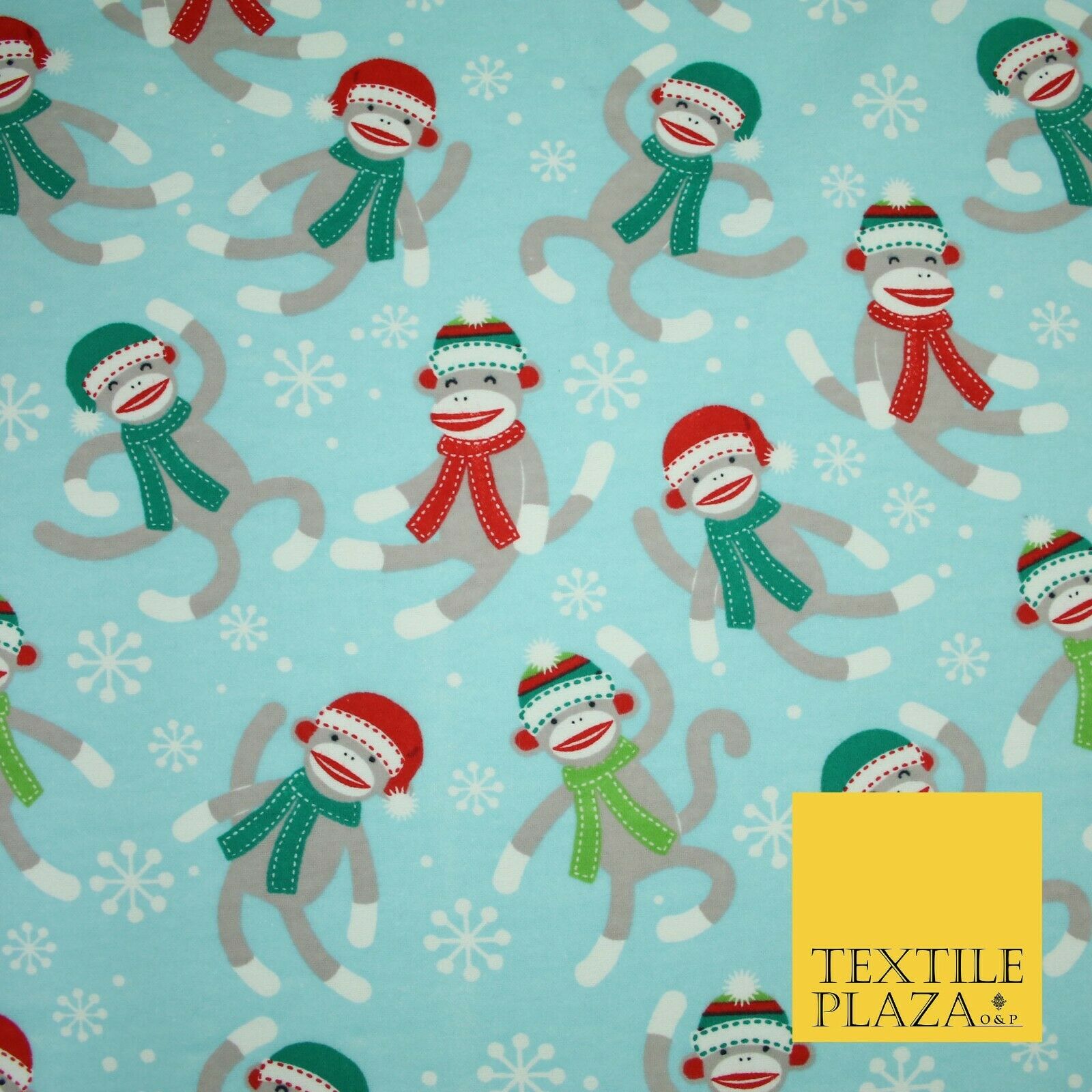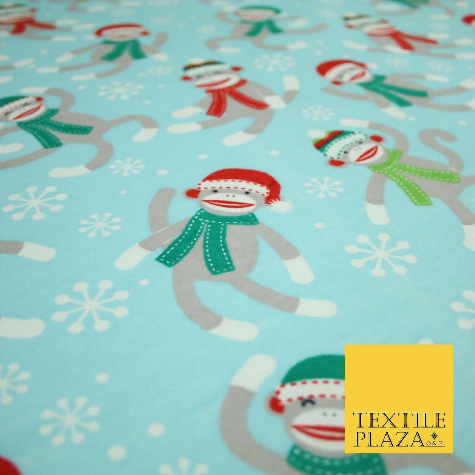 Blue Christmas Festive Monkey Winceyette Soft Brushed Cotton Print Fabric 3960
