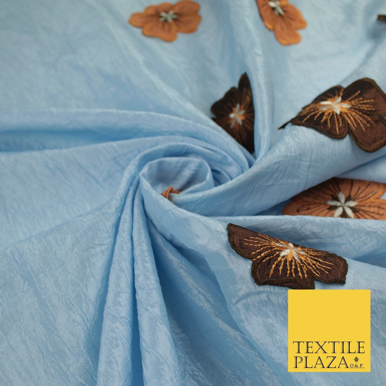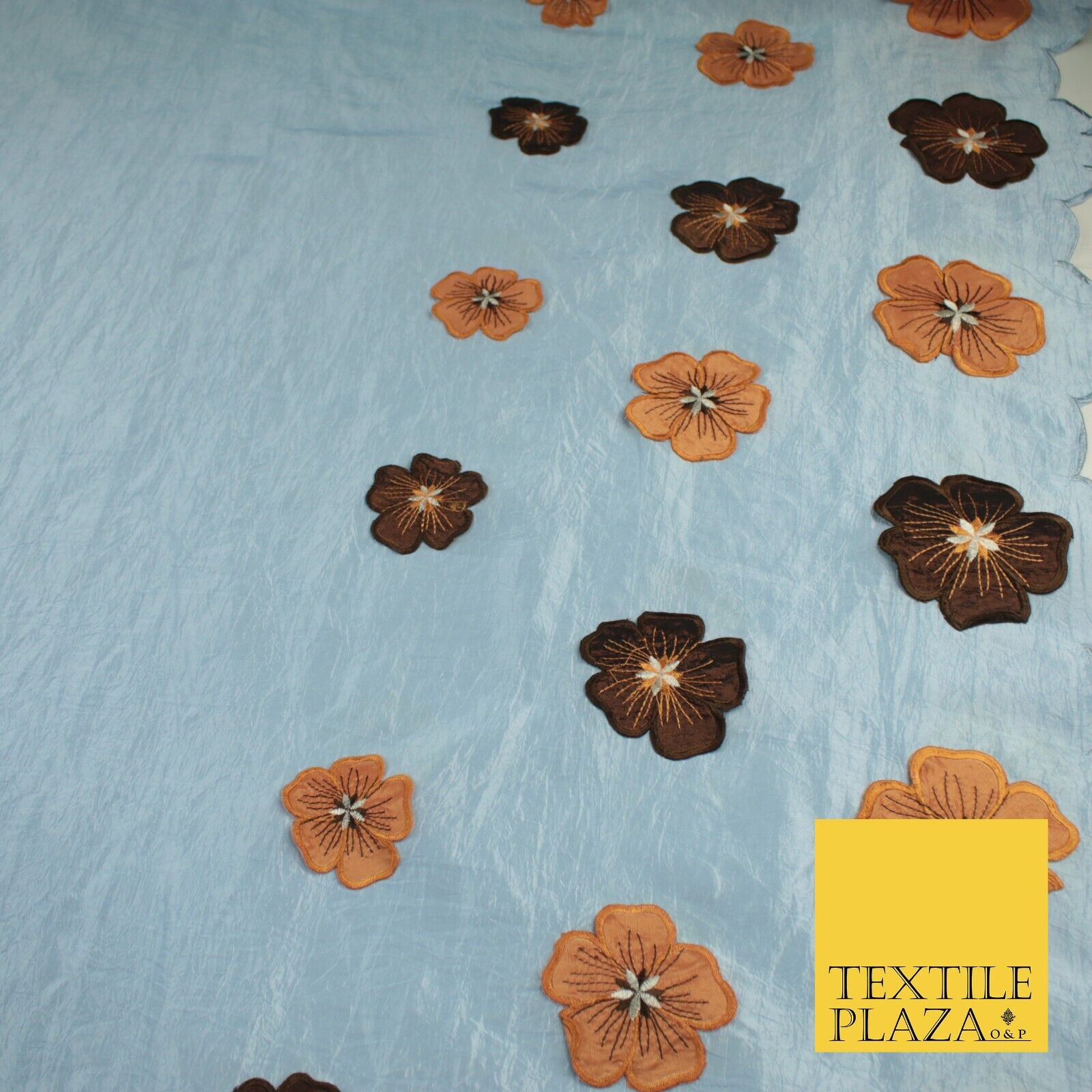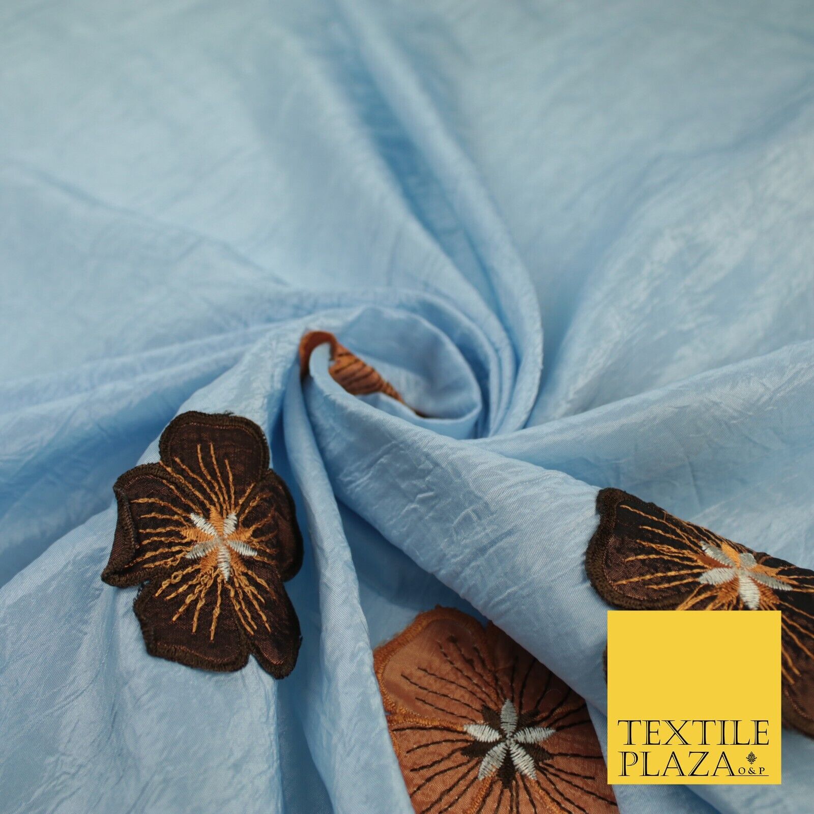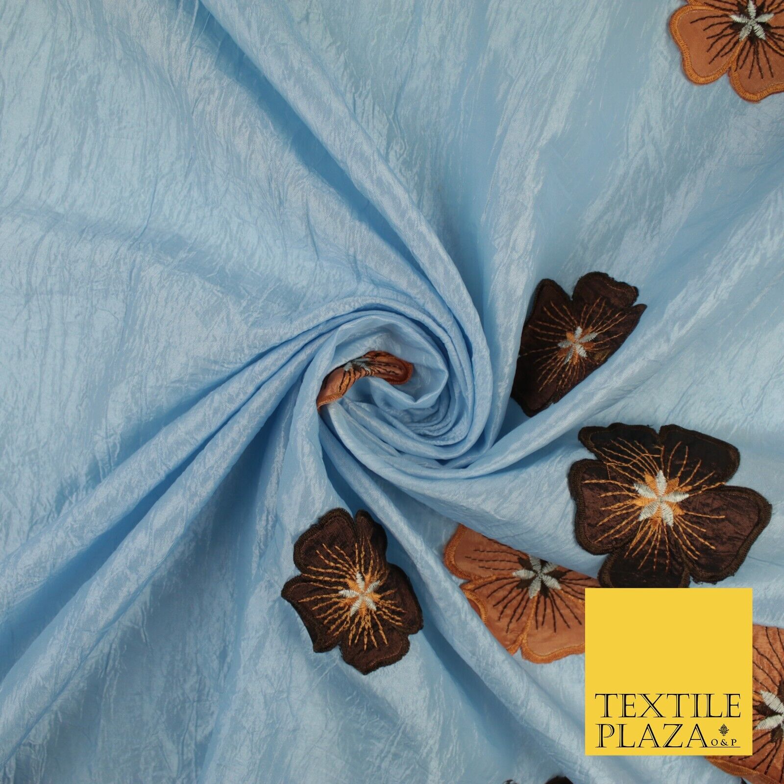 Blue Faux Silk Taffeta with Brown Rust Applique Flowers Dress Fabric 55" 10388