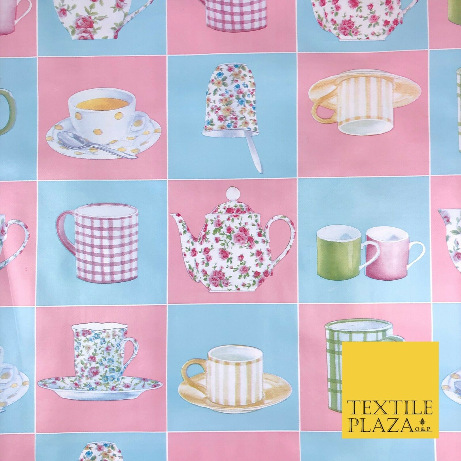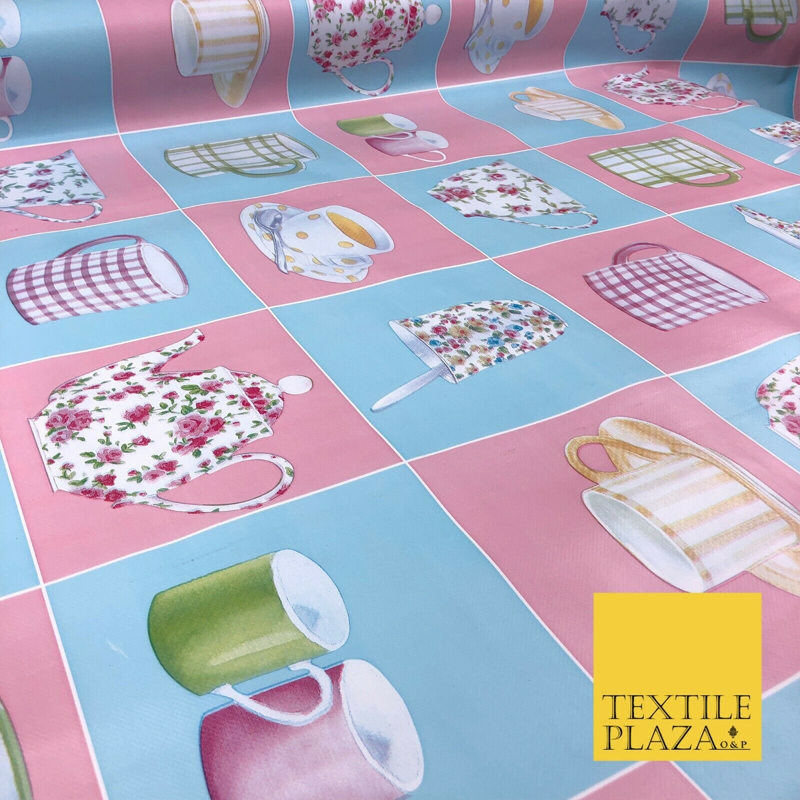 Blue Pink Tea Party Cup Mug Pot PVC VINYL Tablecloth Oilcloth Wipe Clean 1264