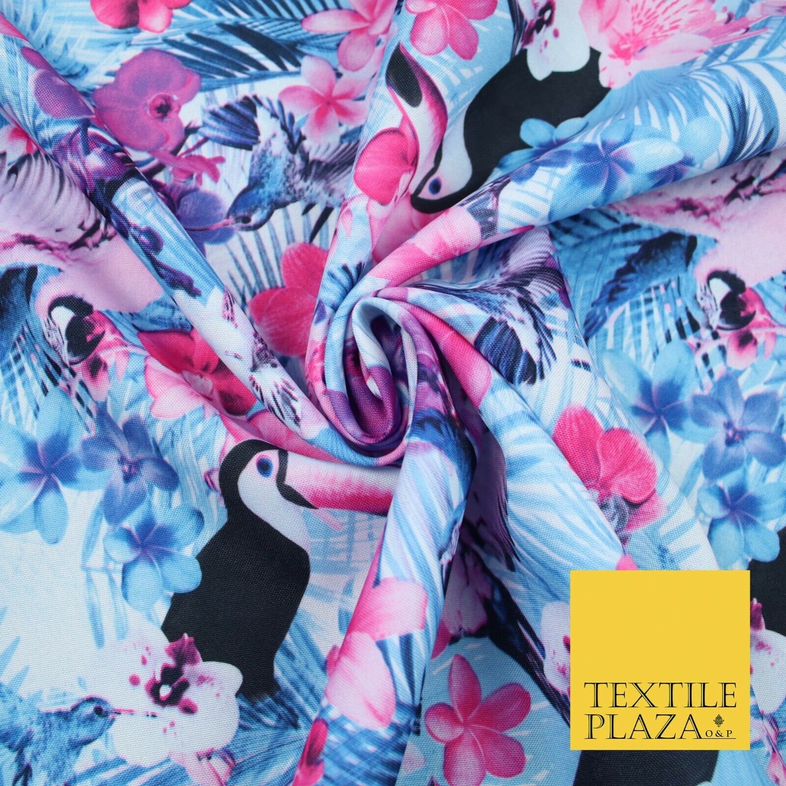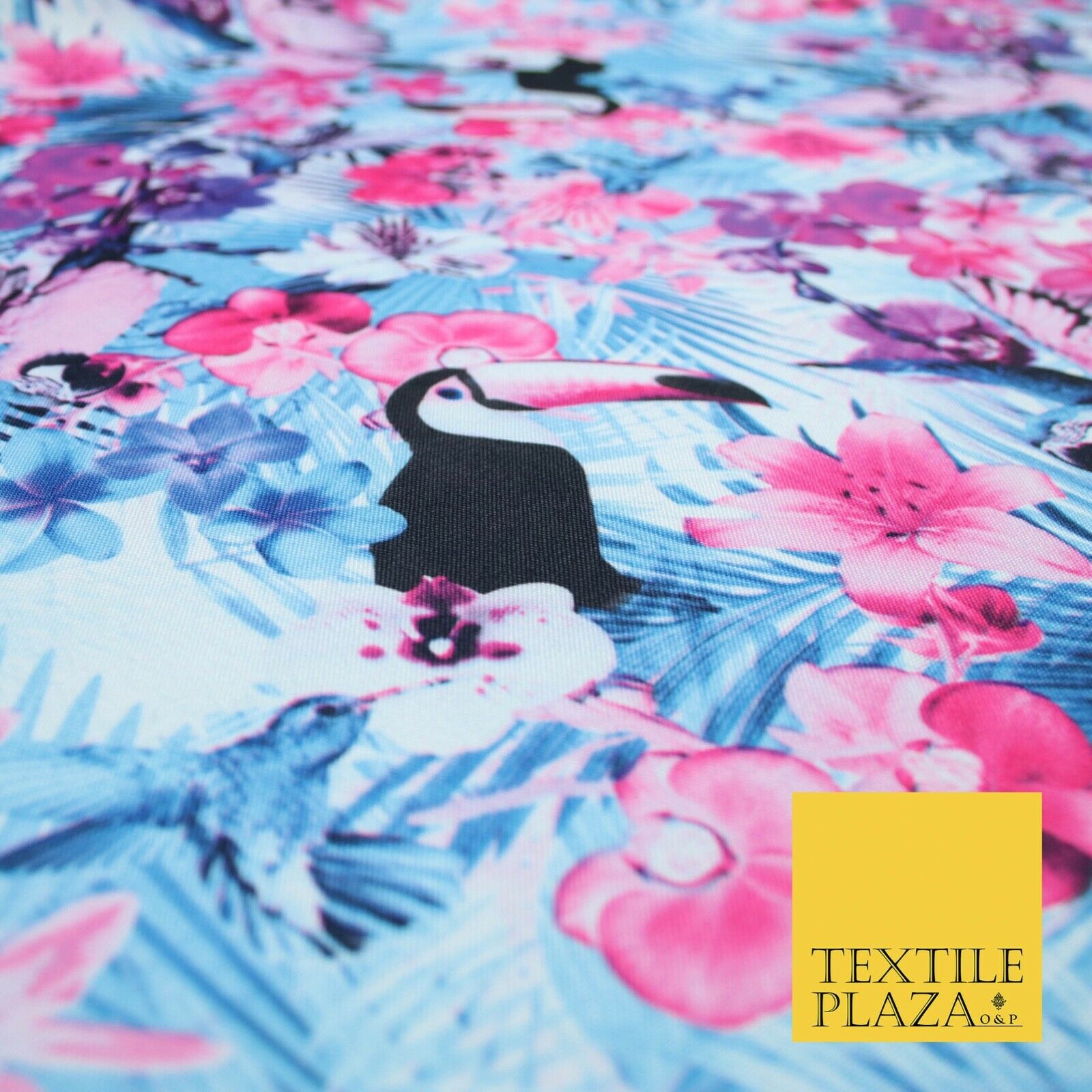 Blue Pink Toucan Bird Tropical Floral Wildlife Panama Bi-Stretch Fabric 58" 5513