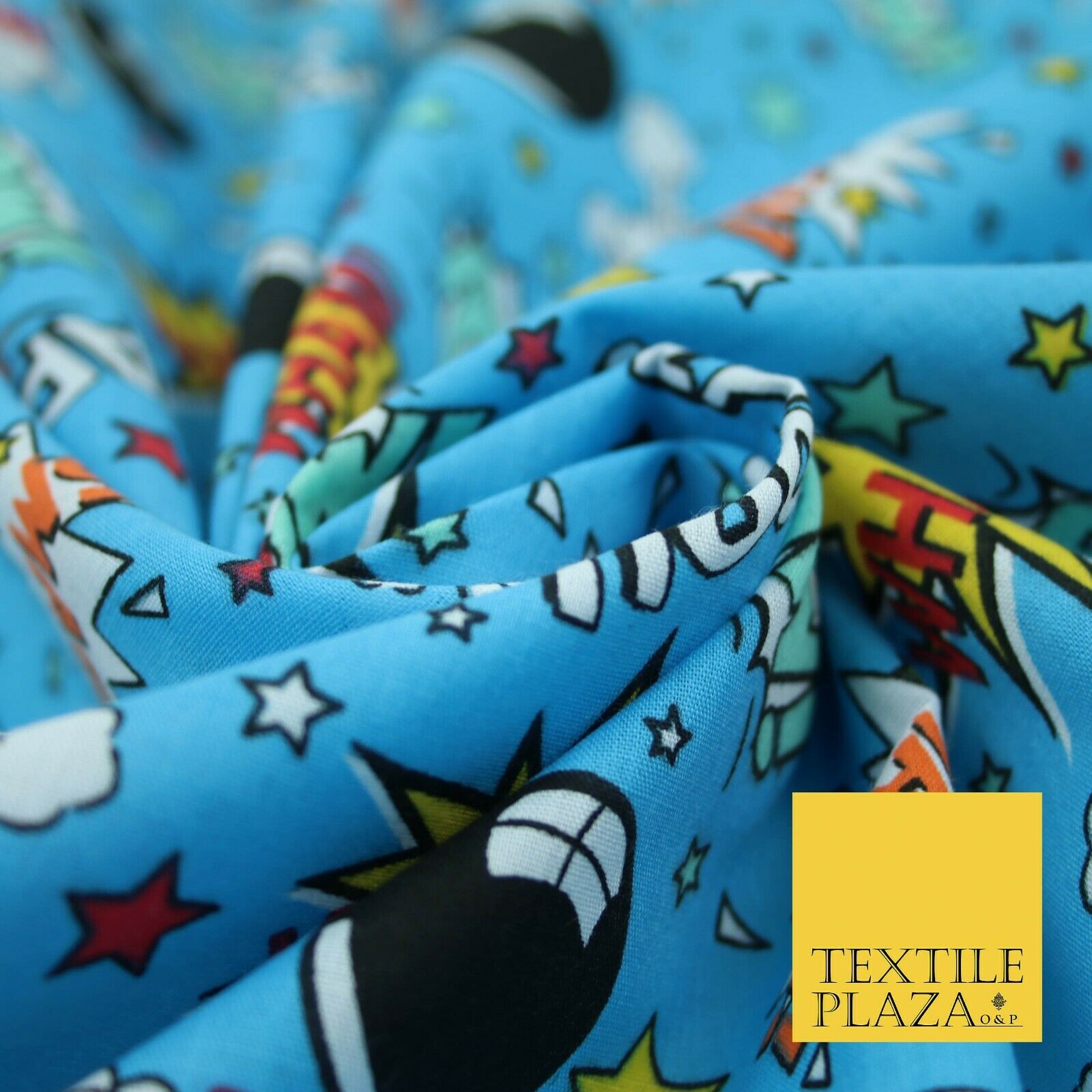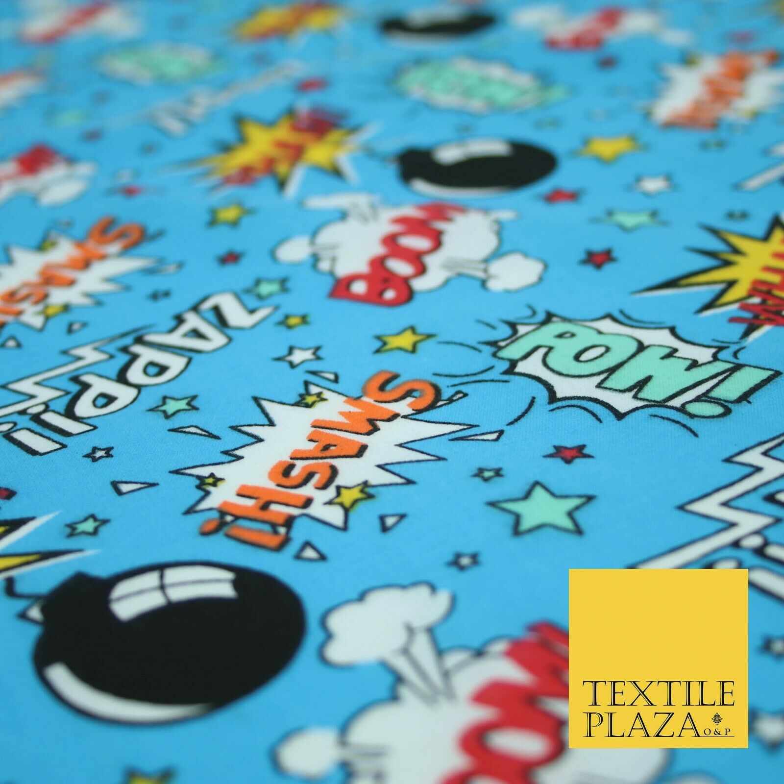 Blue POW ZAPP WHAM Kids Cartoon Comic Book Bomb Printed Polycotton Fabric 44"