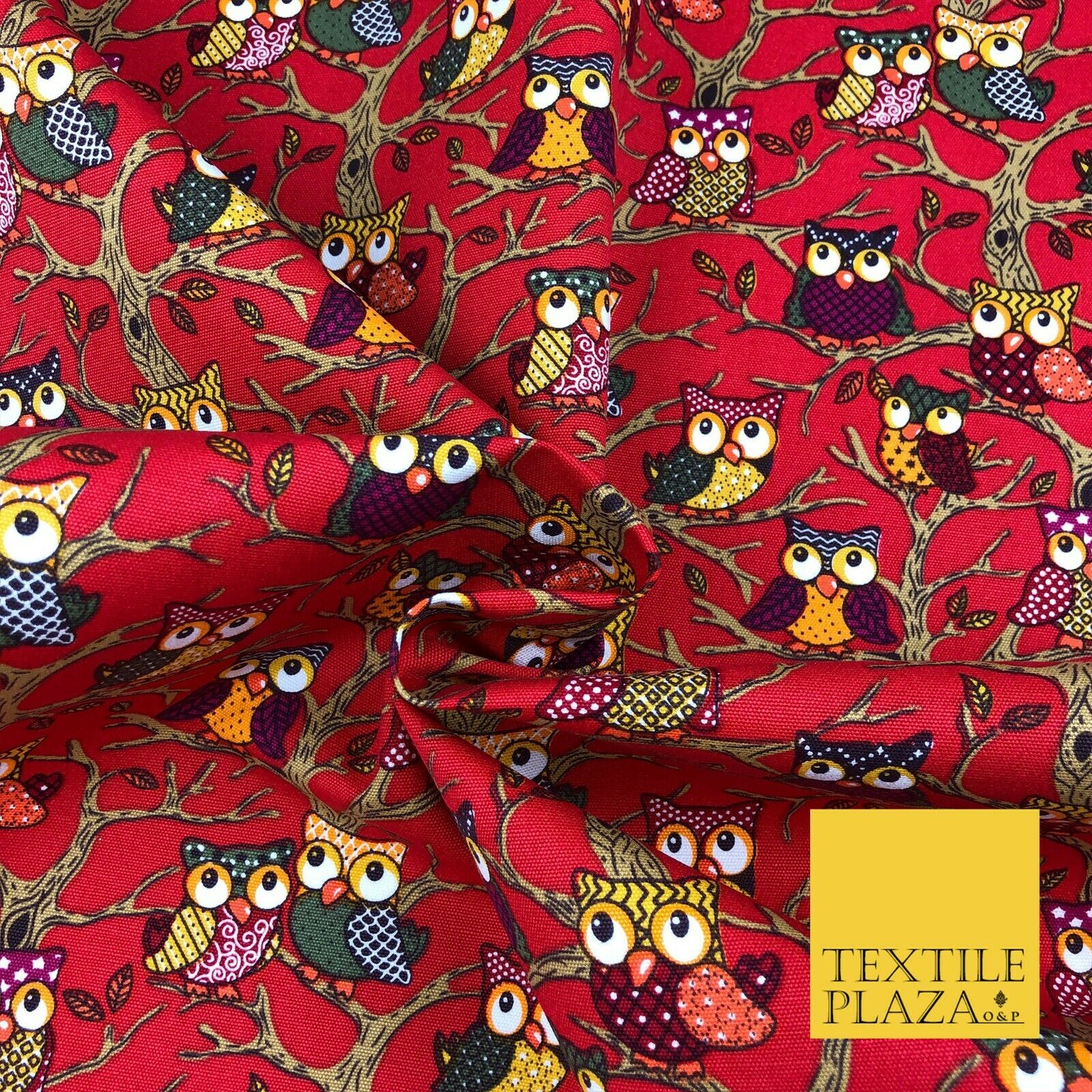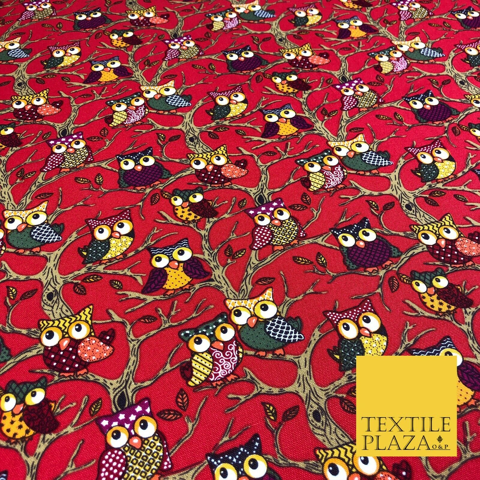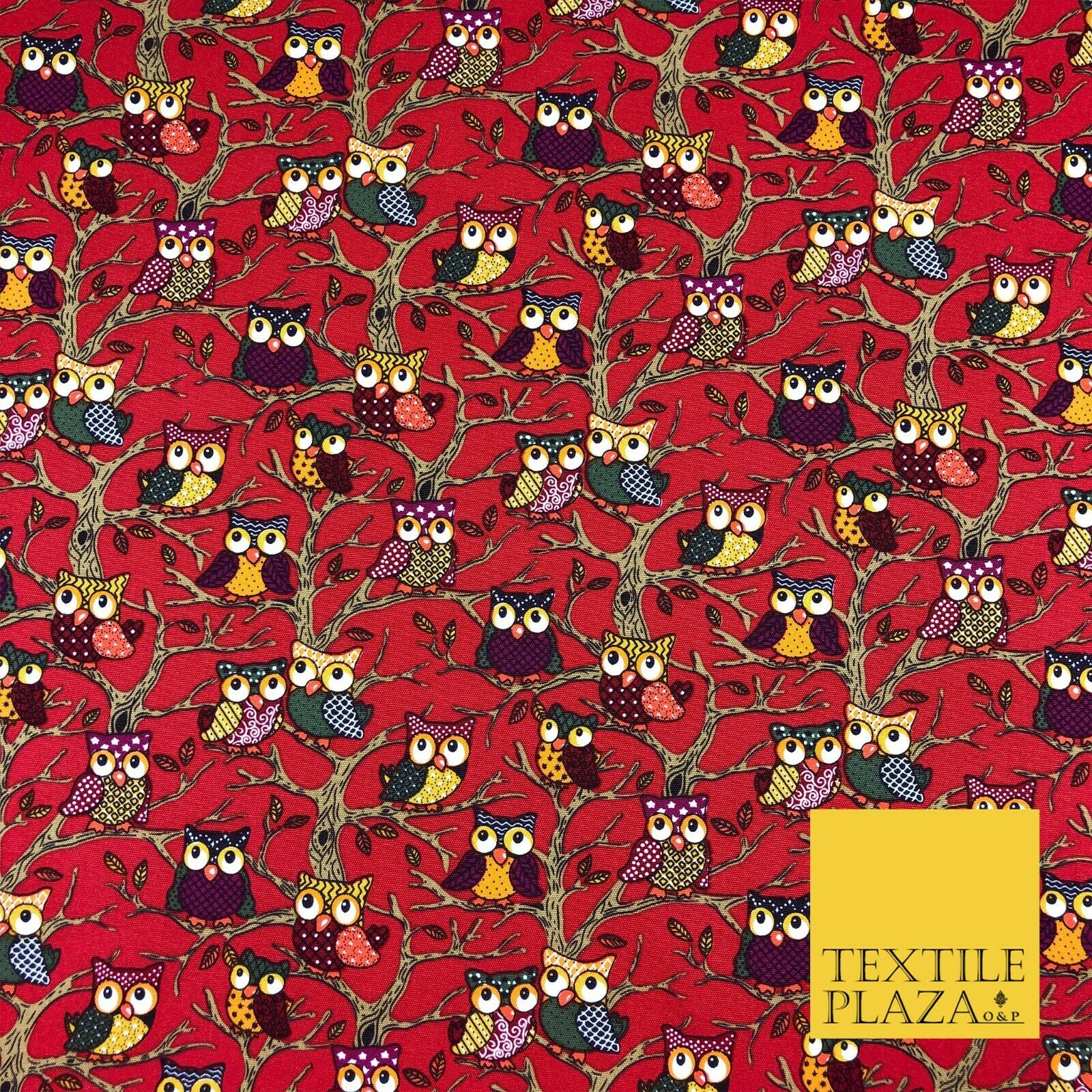 Cherry Red Tree Owls 100% COTTON CANVAS Print Fabric Craft Upholstery 1402