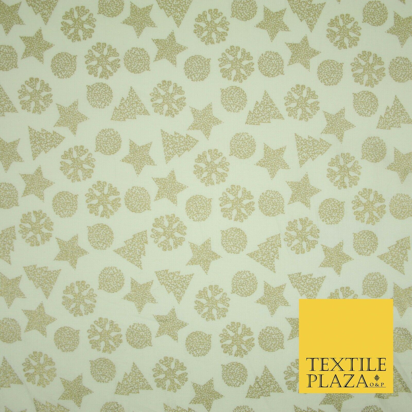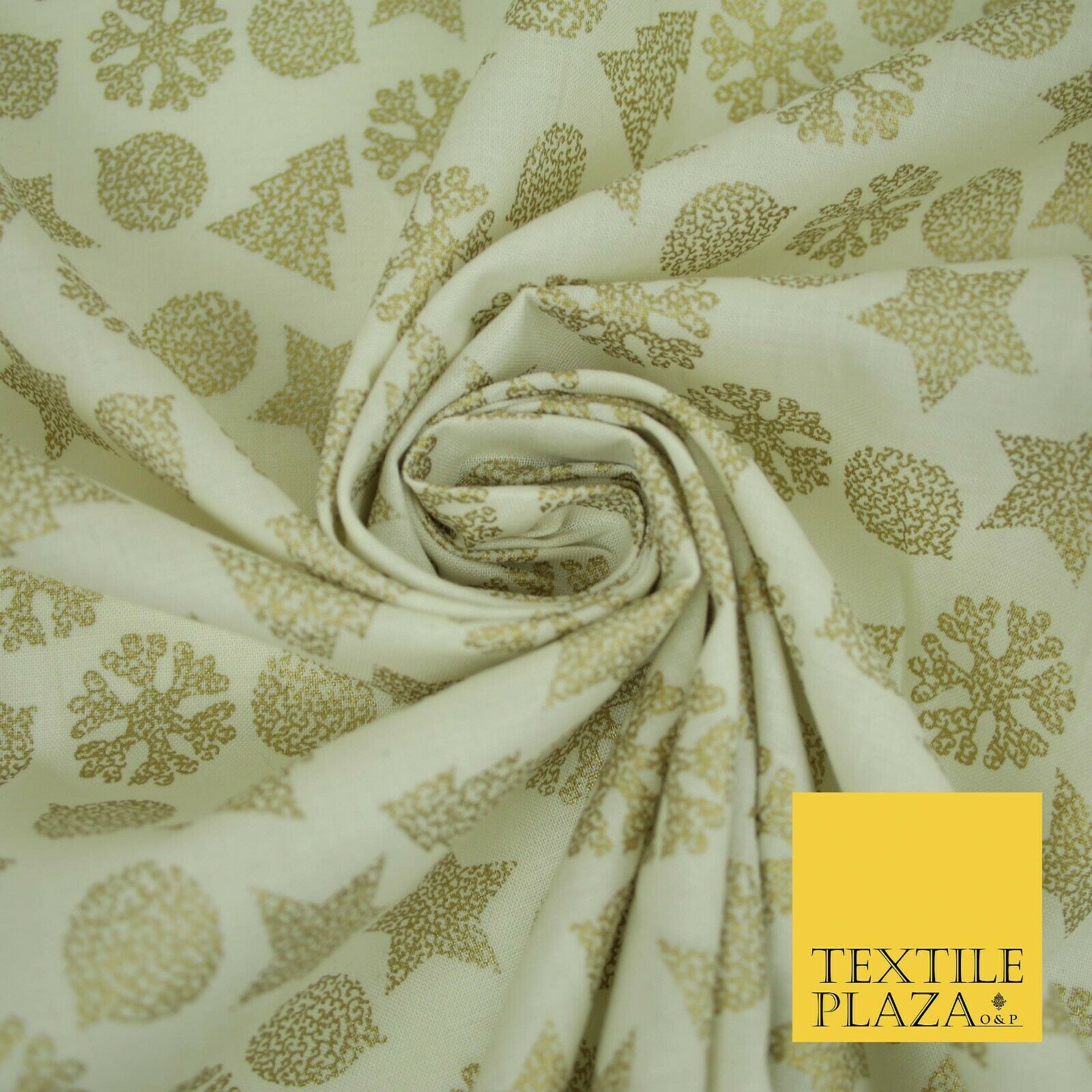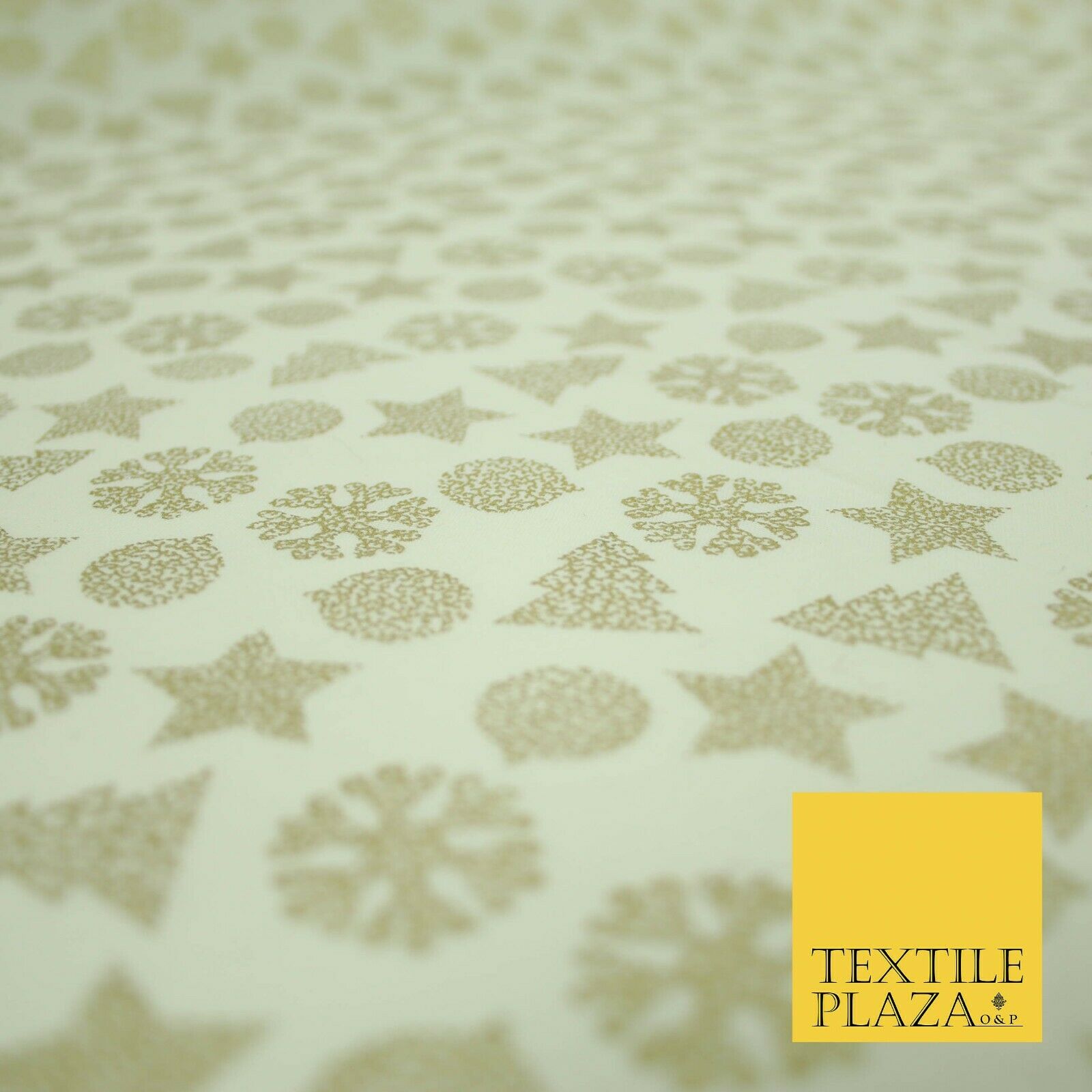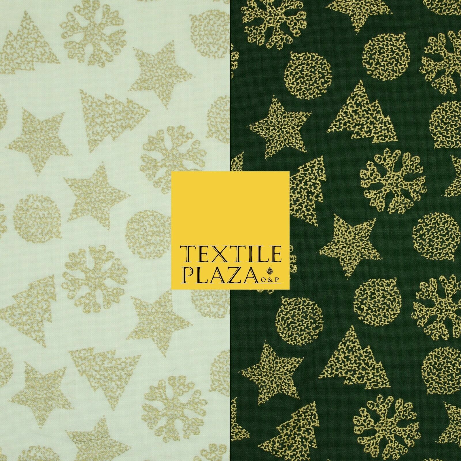 Christmas Gold Metallic Star Snowflake Tree Bauble Printed 100%Cotton Fabric 54"