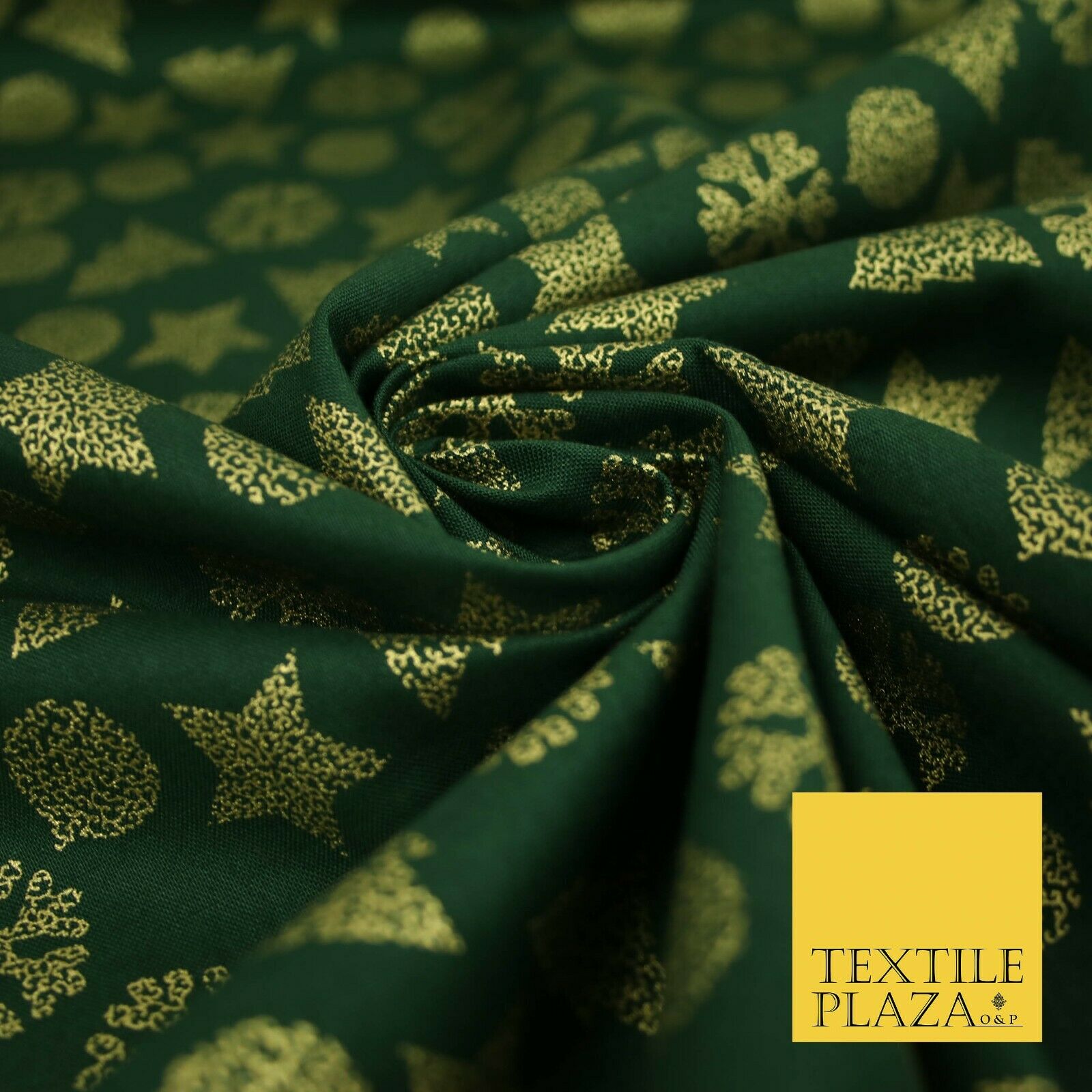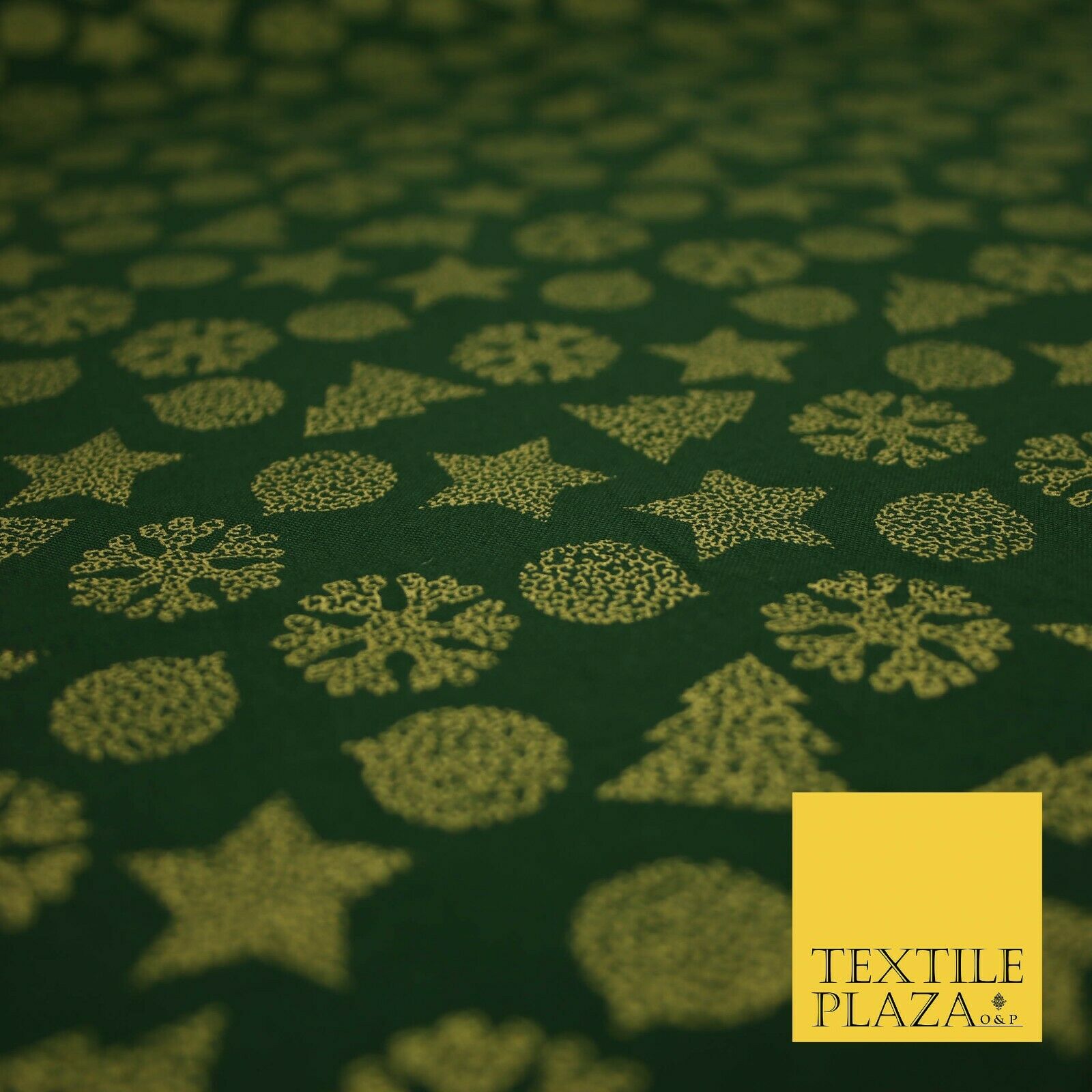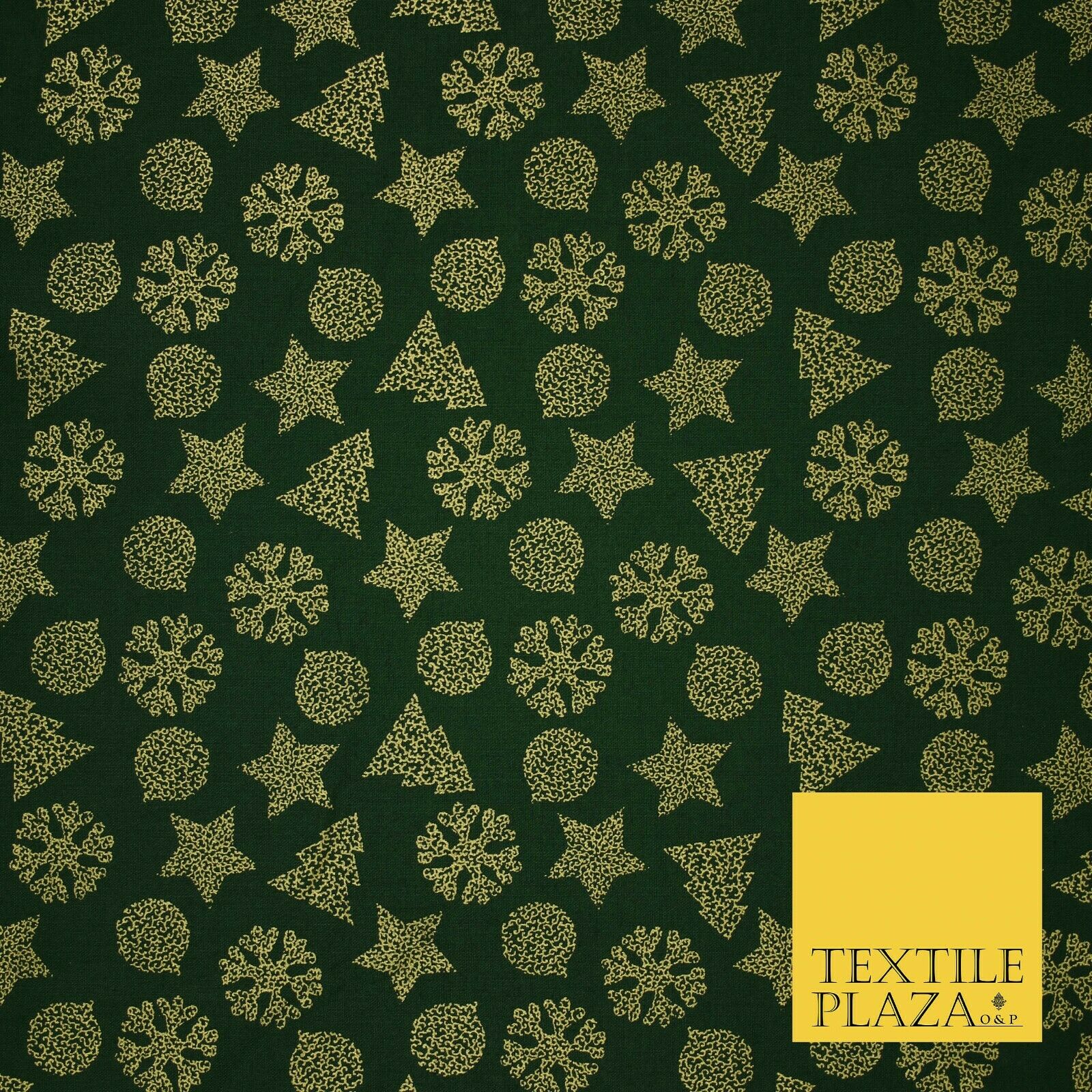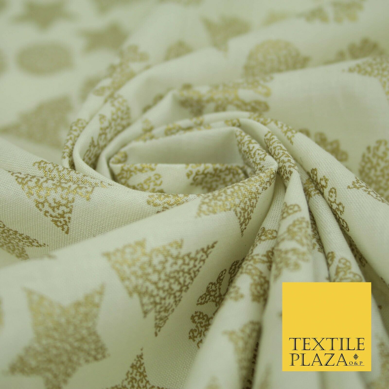 Christmas Gold Metallic Star Snowflake Tree Bauble Printed 100%Cotton Fabric 54"