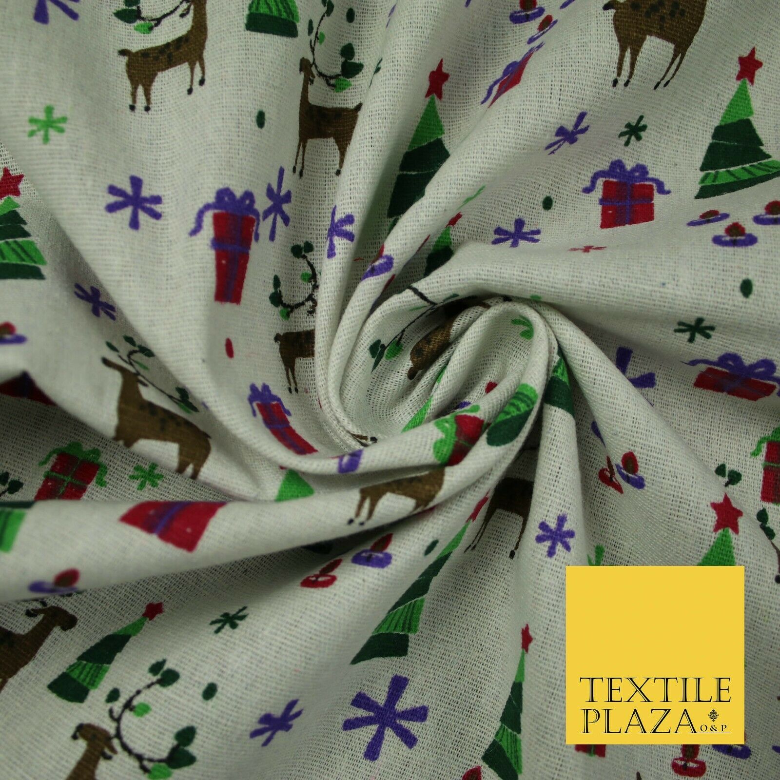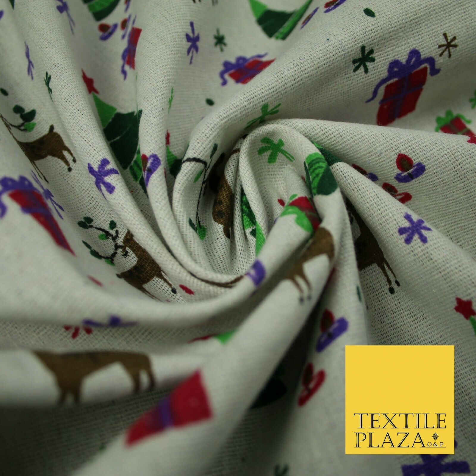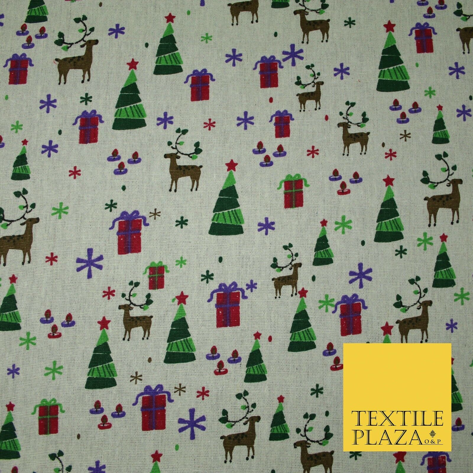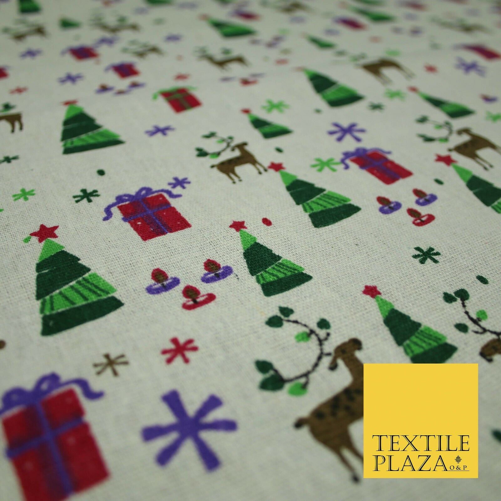 Christmas Tree Gifts Reindeer Festive Printed 100% Cotton Canvas Fabric 55" 4481