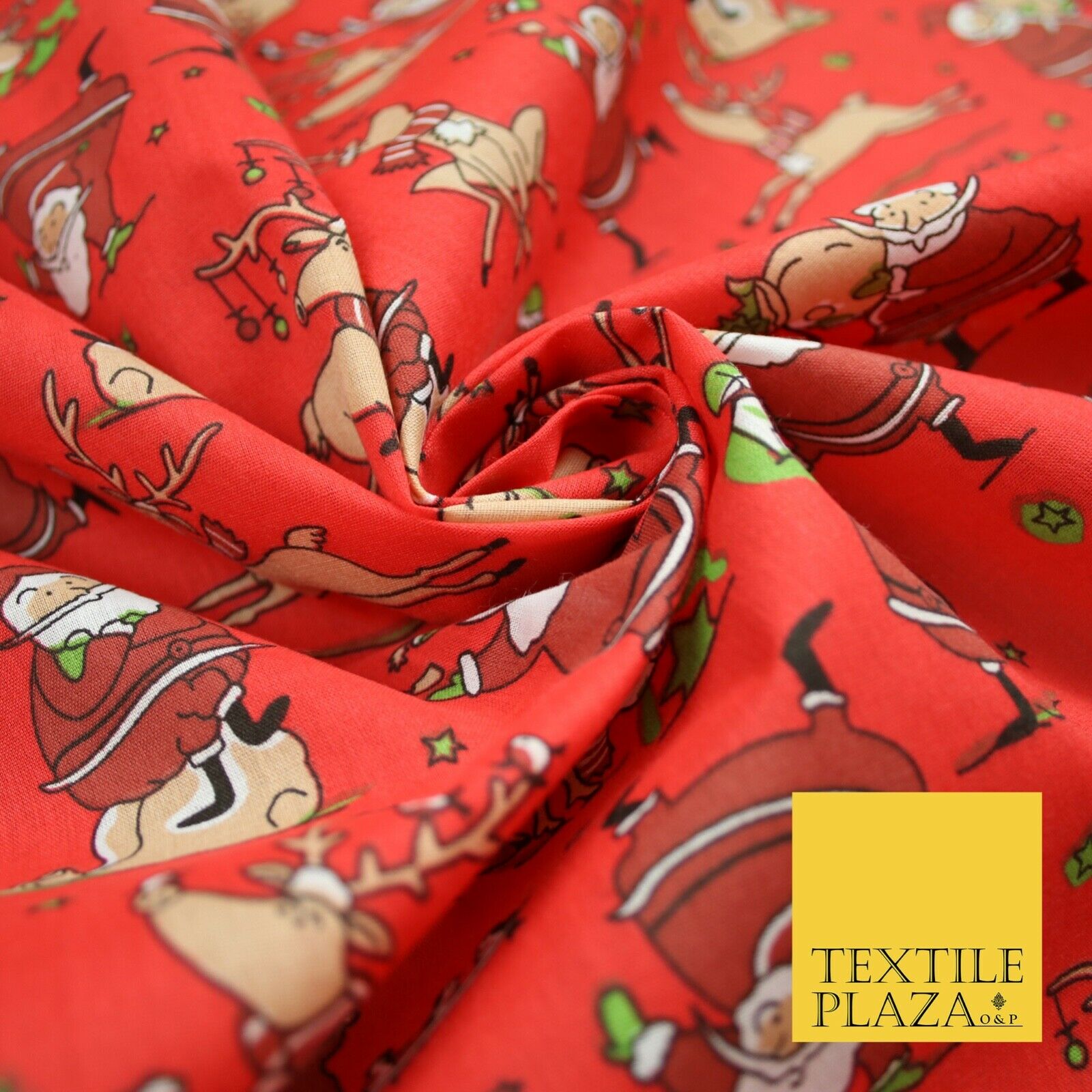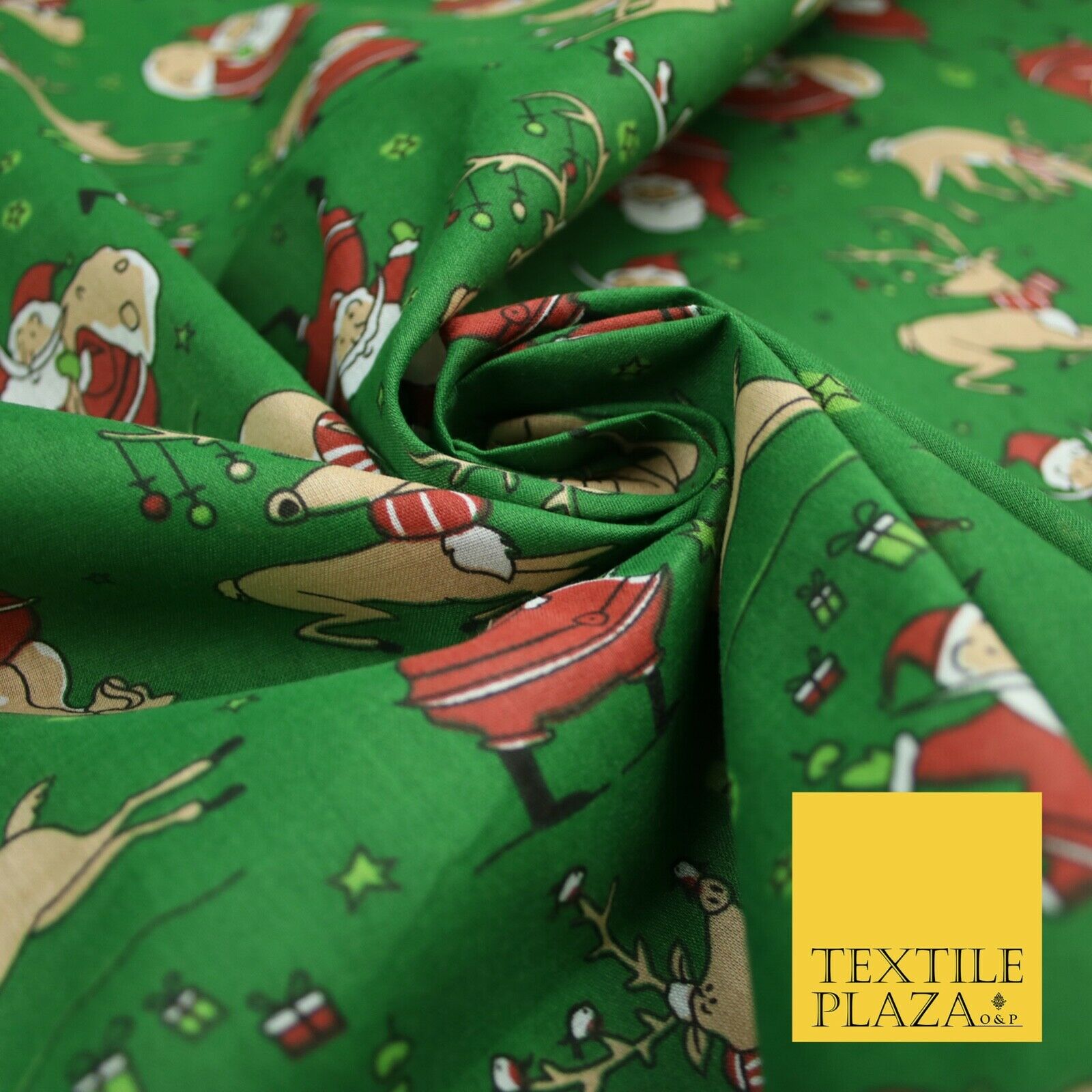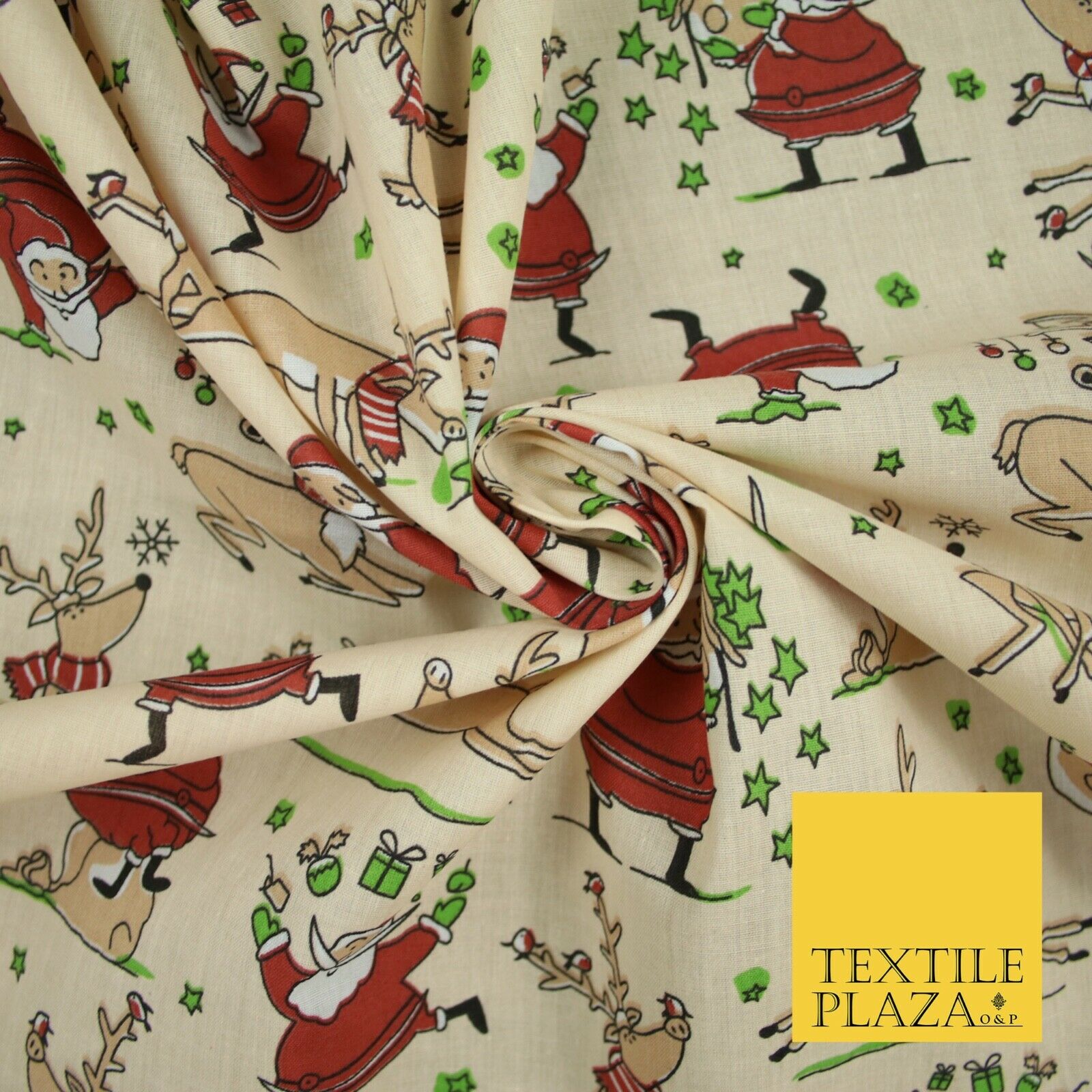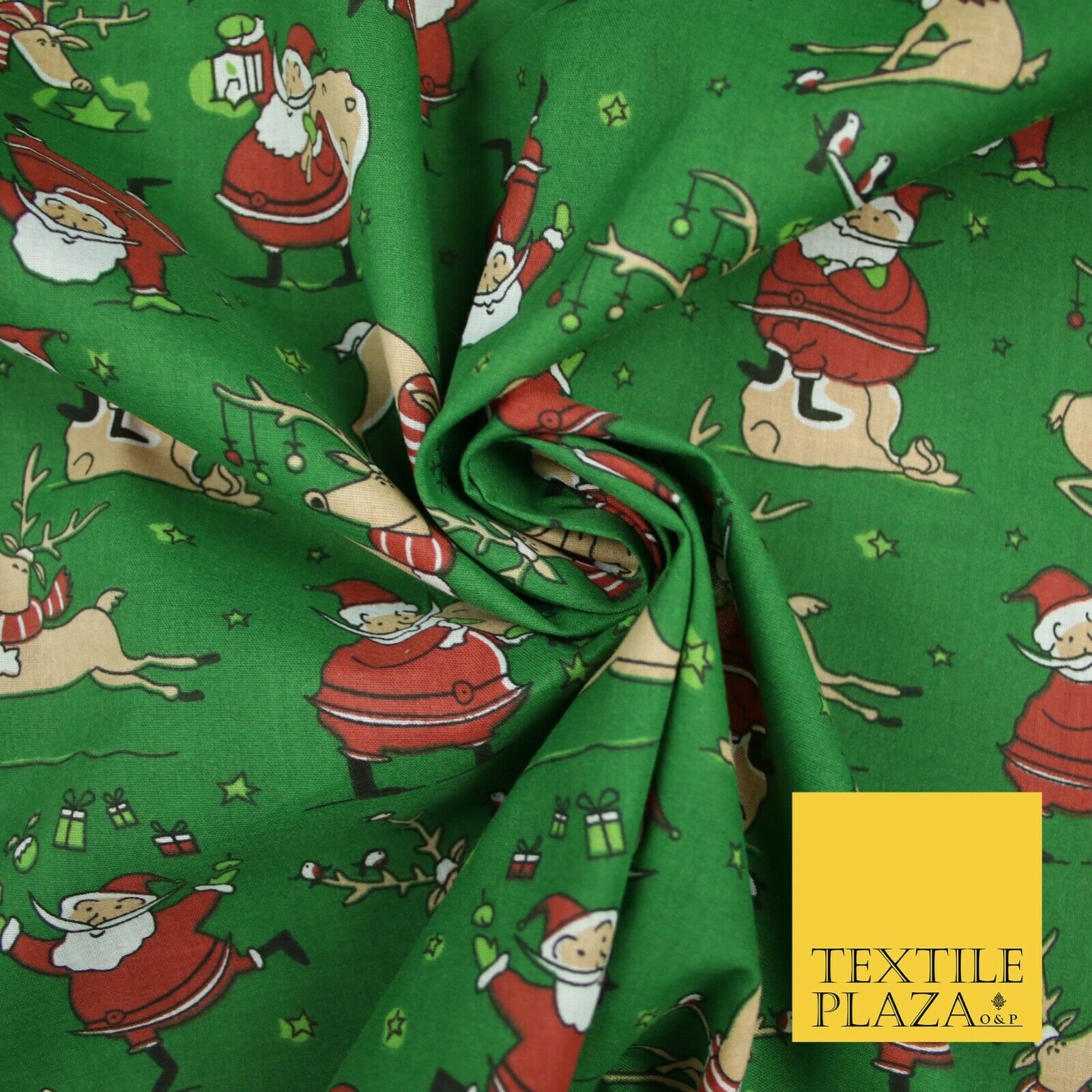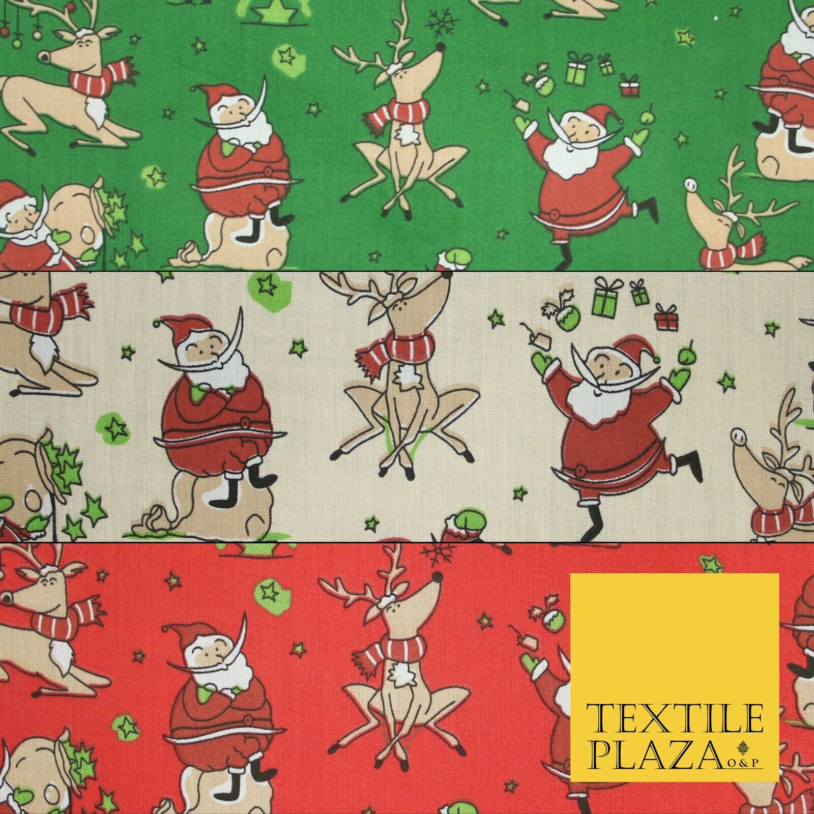 Christmas Tree Santa Gifts Reindeer Printed Poly Cotton Fabric Polycotton 45"