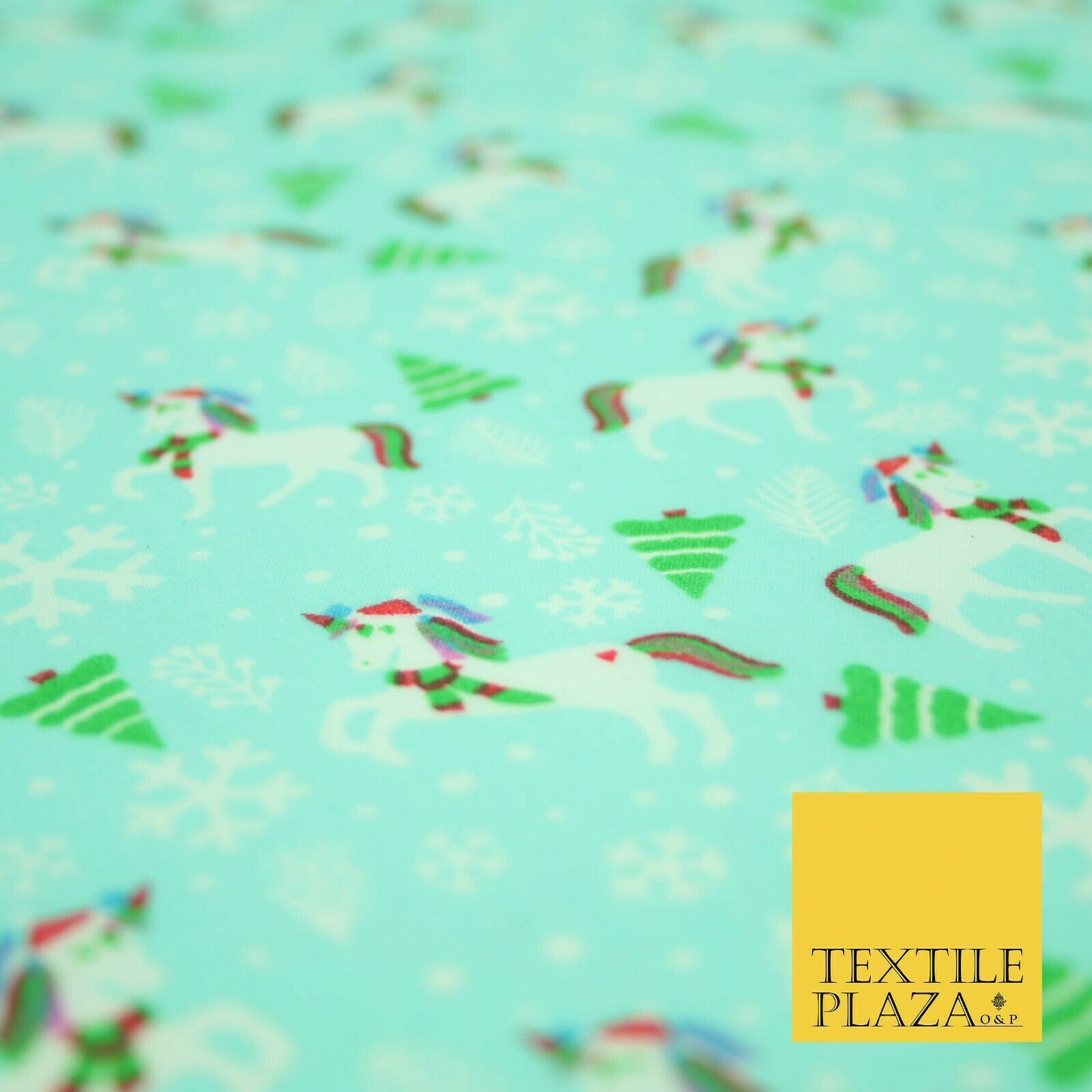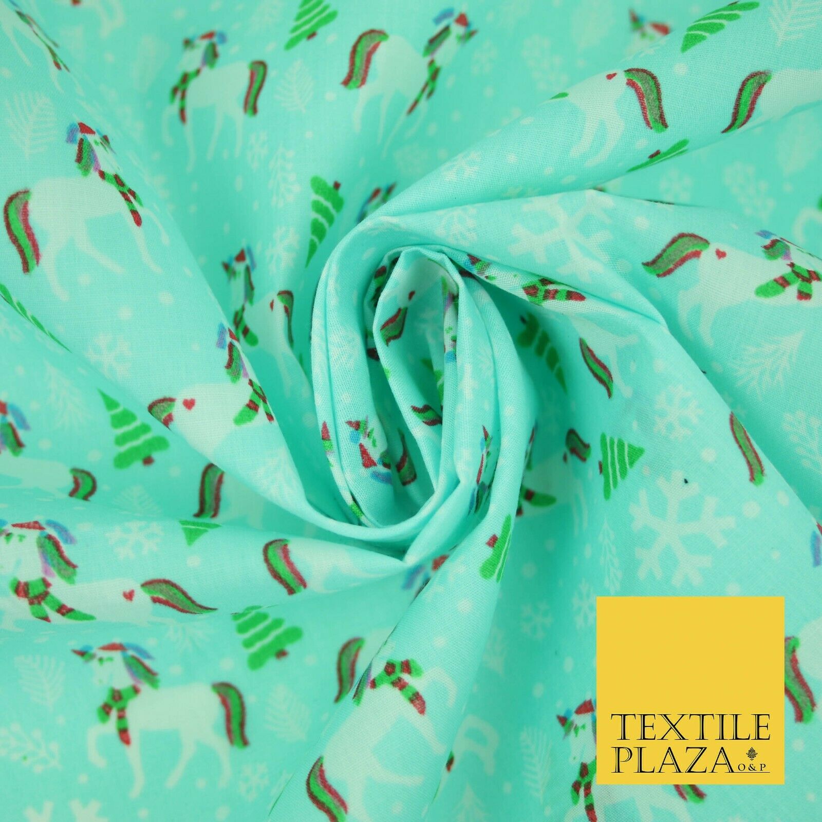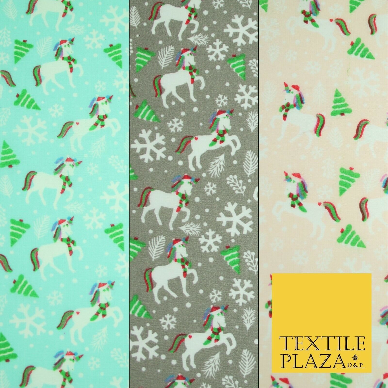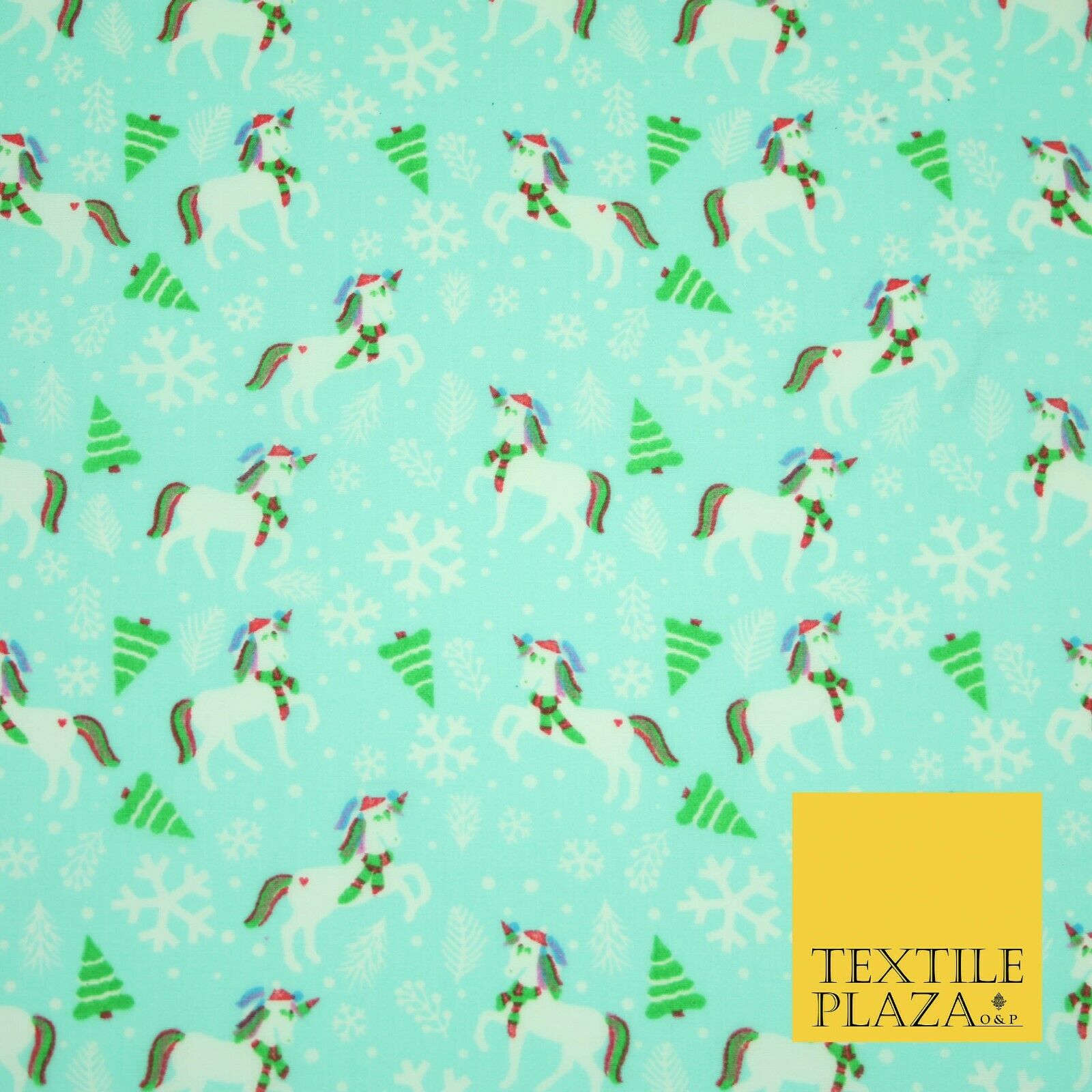 Premium Christmas Flying Unicorn Snowflake Trees Festive Poly Cotton Fabric