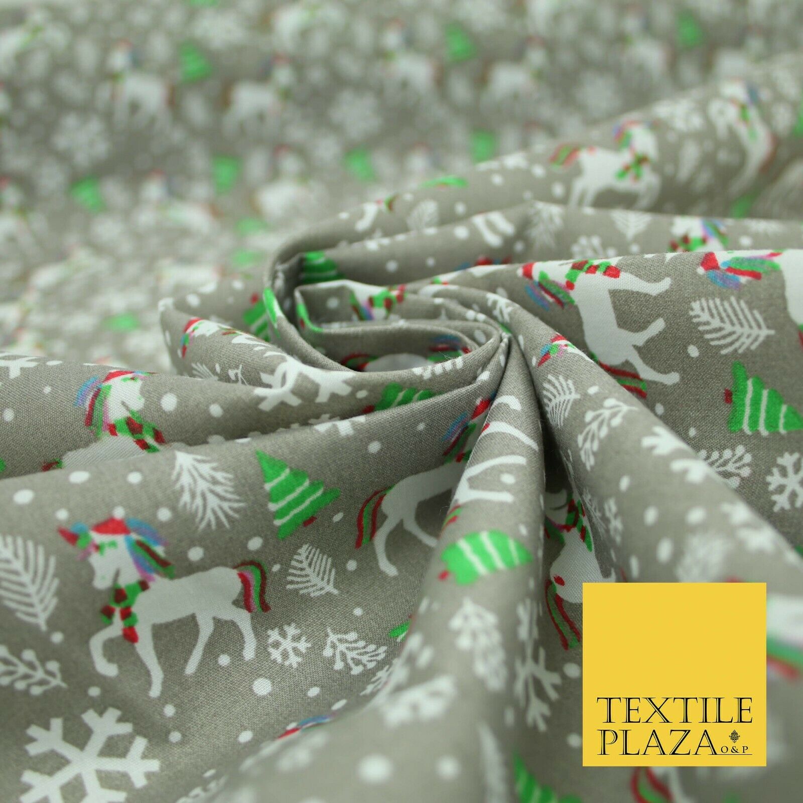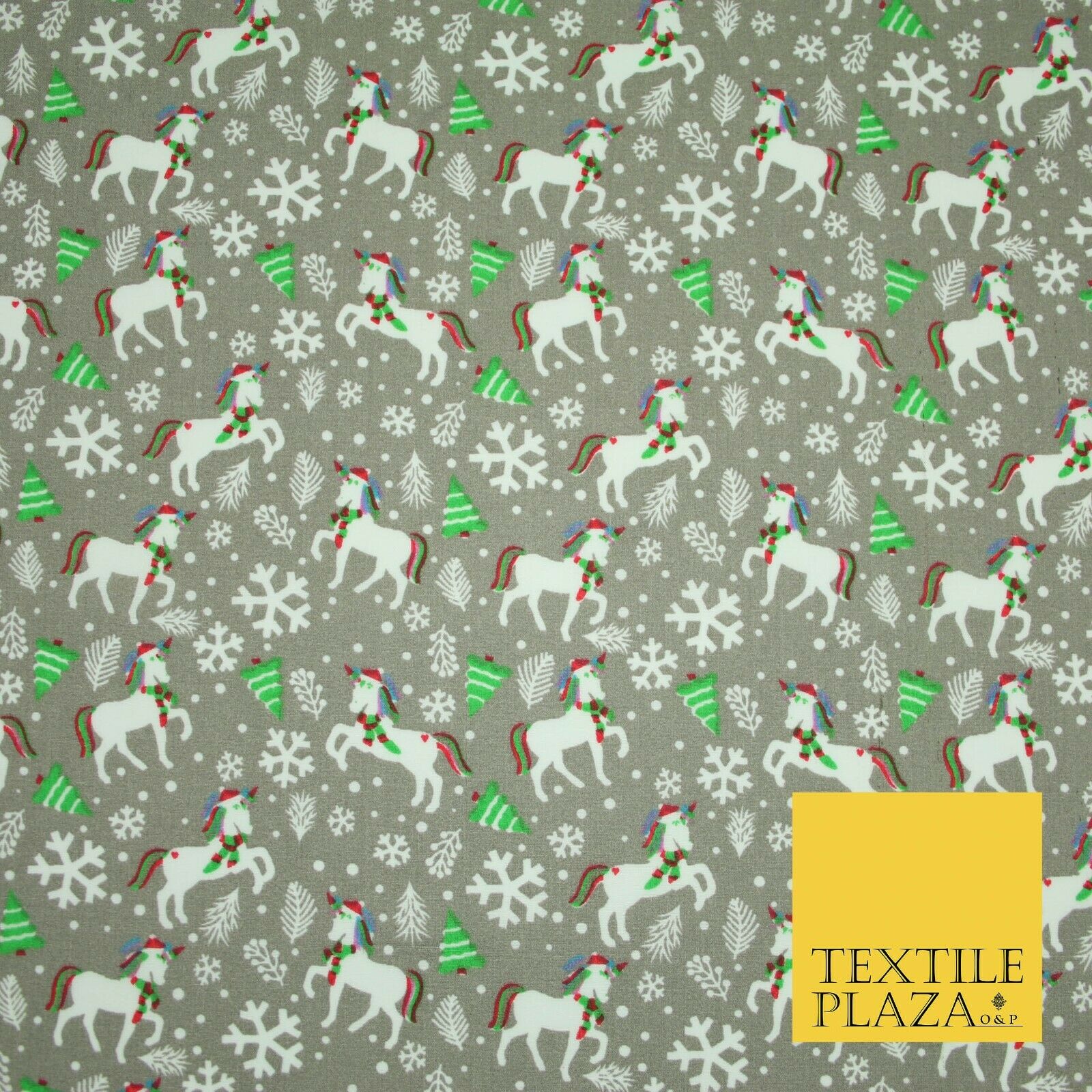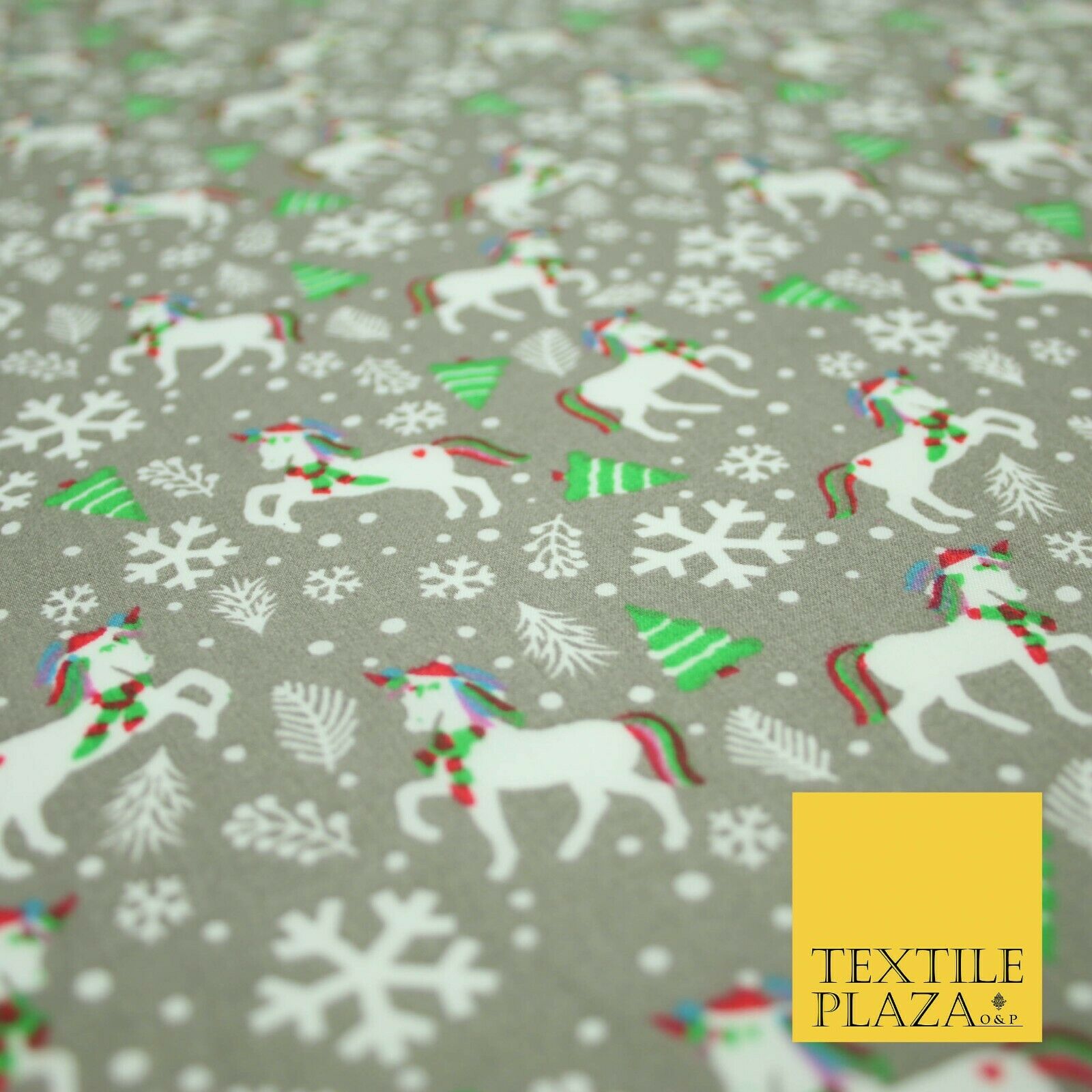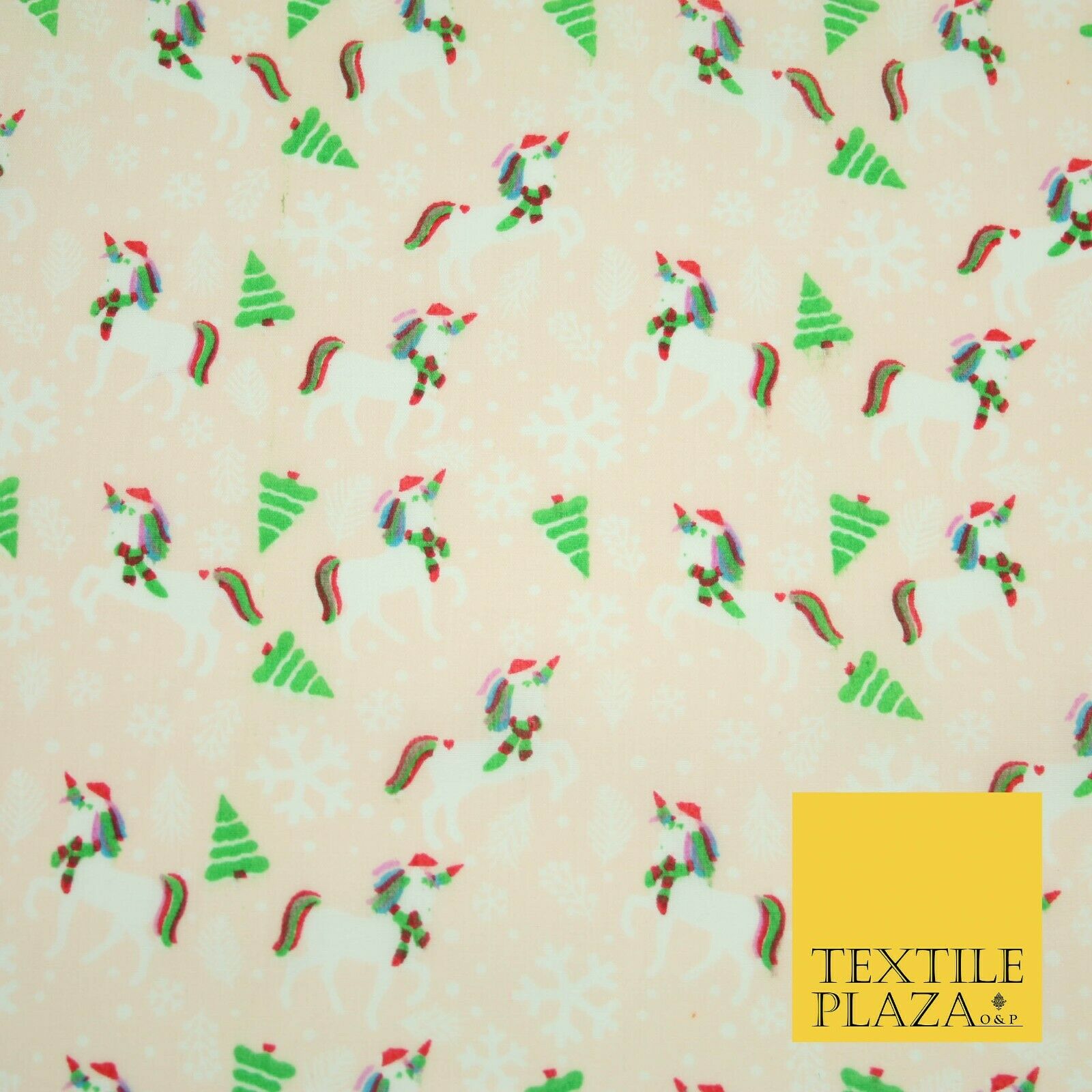 Premium Christmas Flying Unicorn Snowflake Trees Festive Poly Cotton Fabric