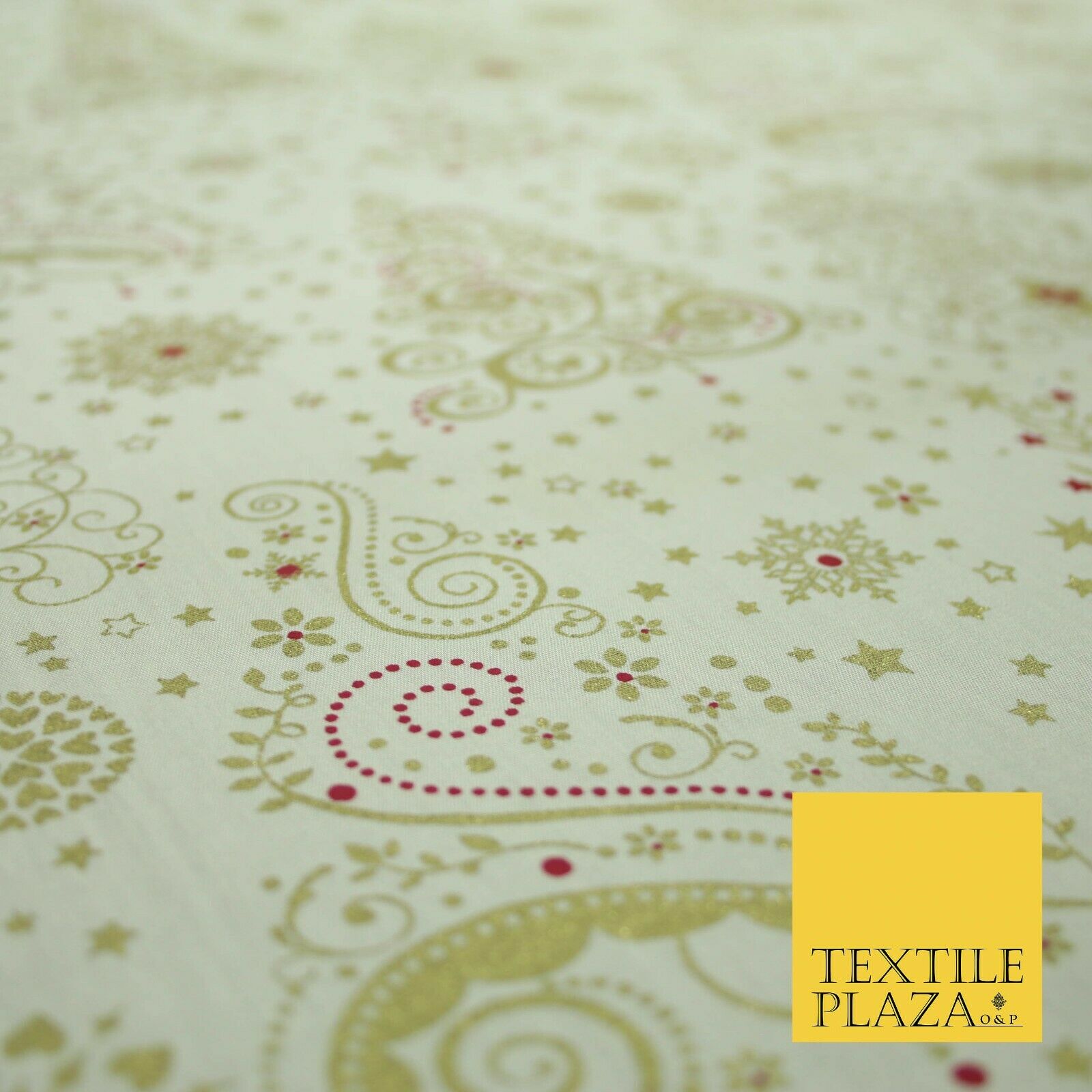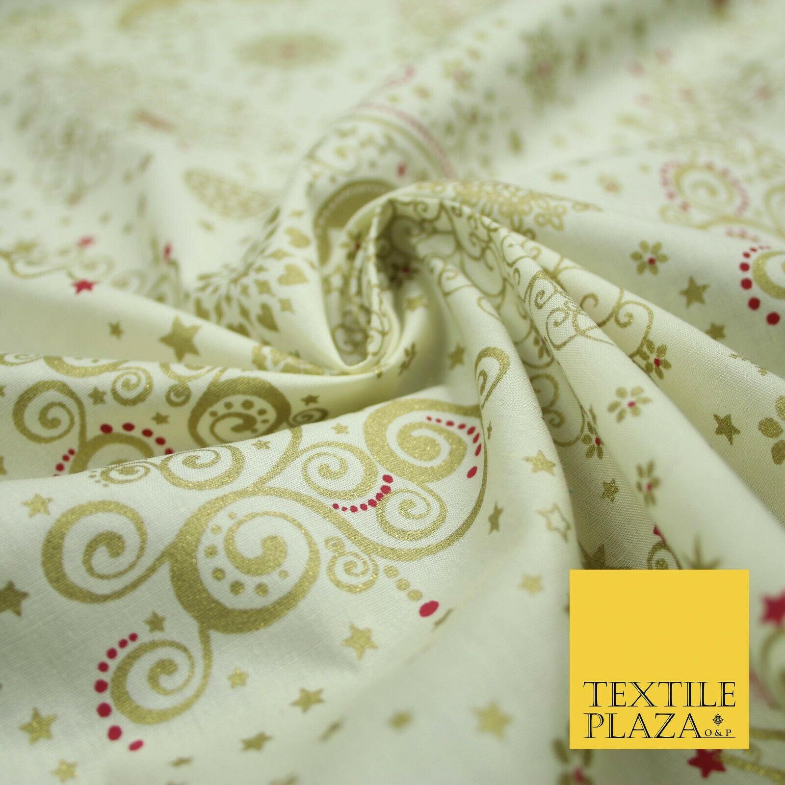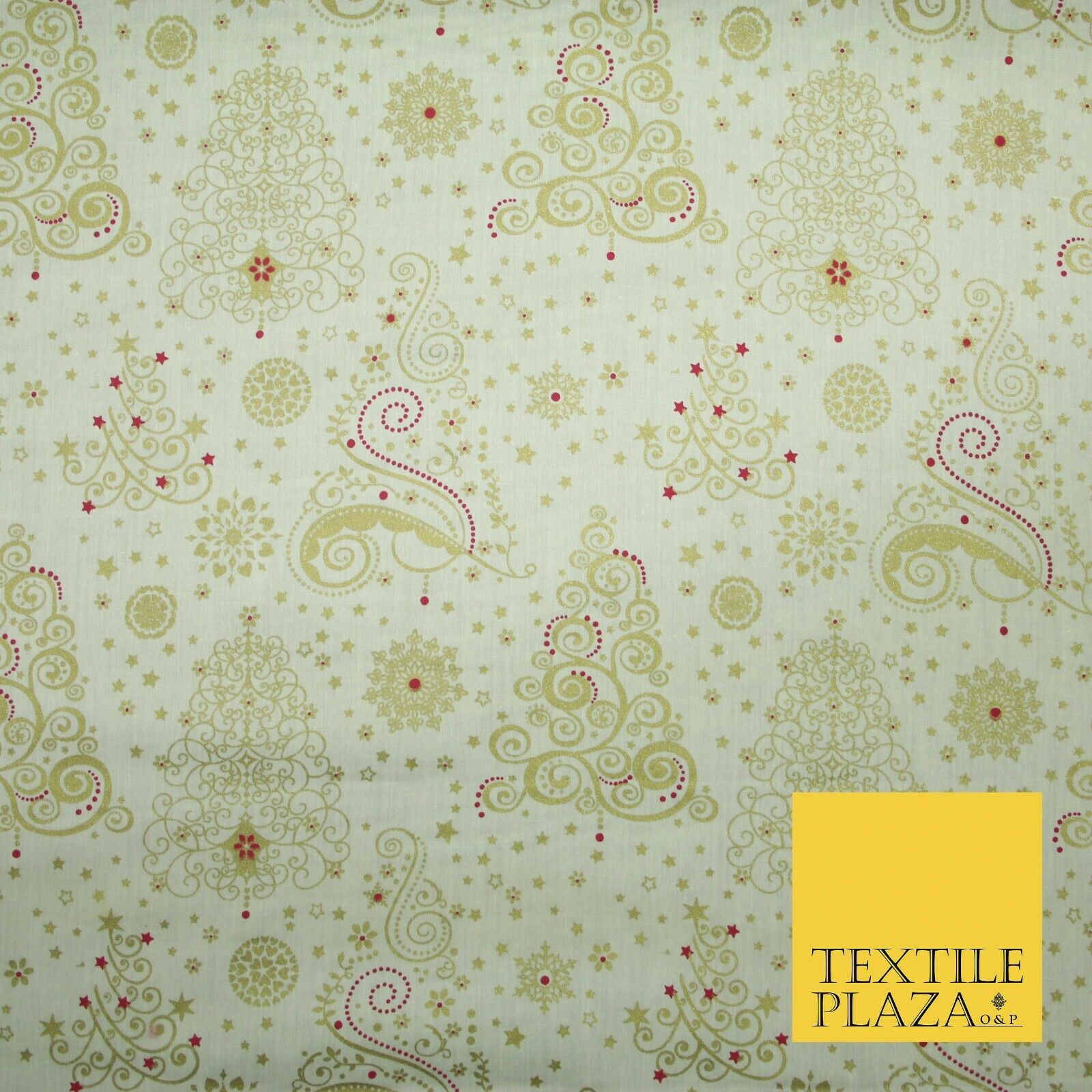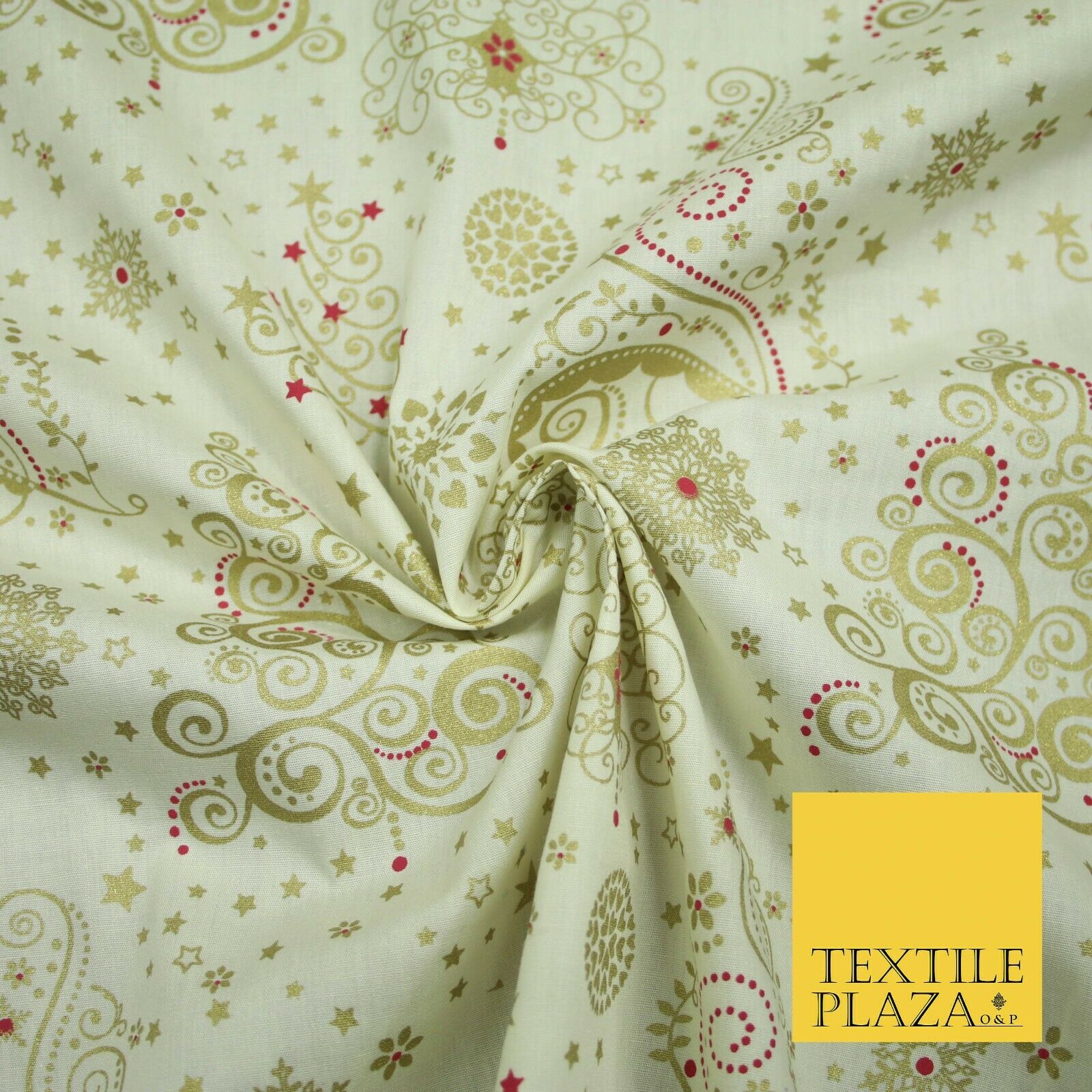 Cream Festive Metallic Gold Ornate Christmas Tree Stars 100% Cotton Fabric 5007