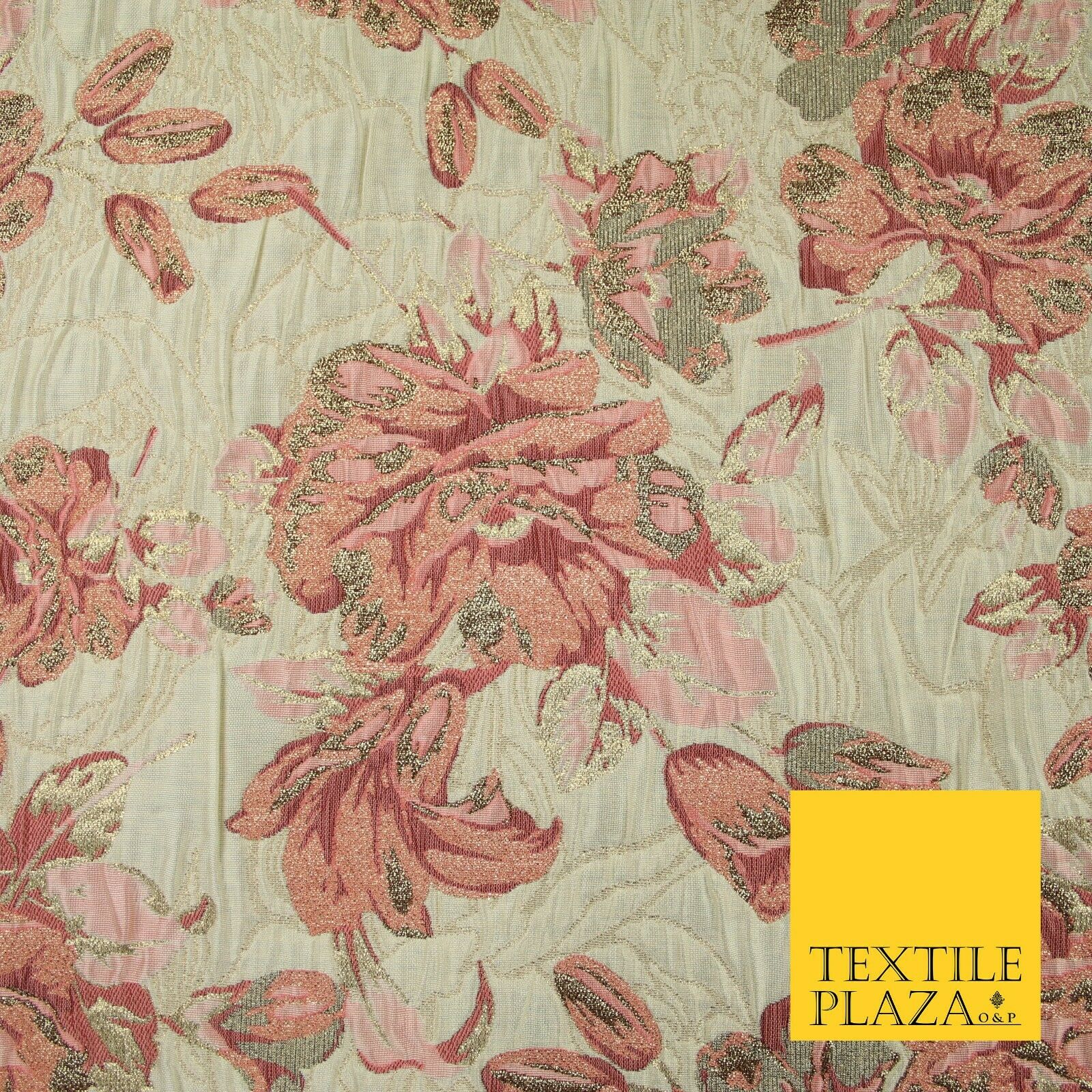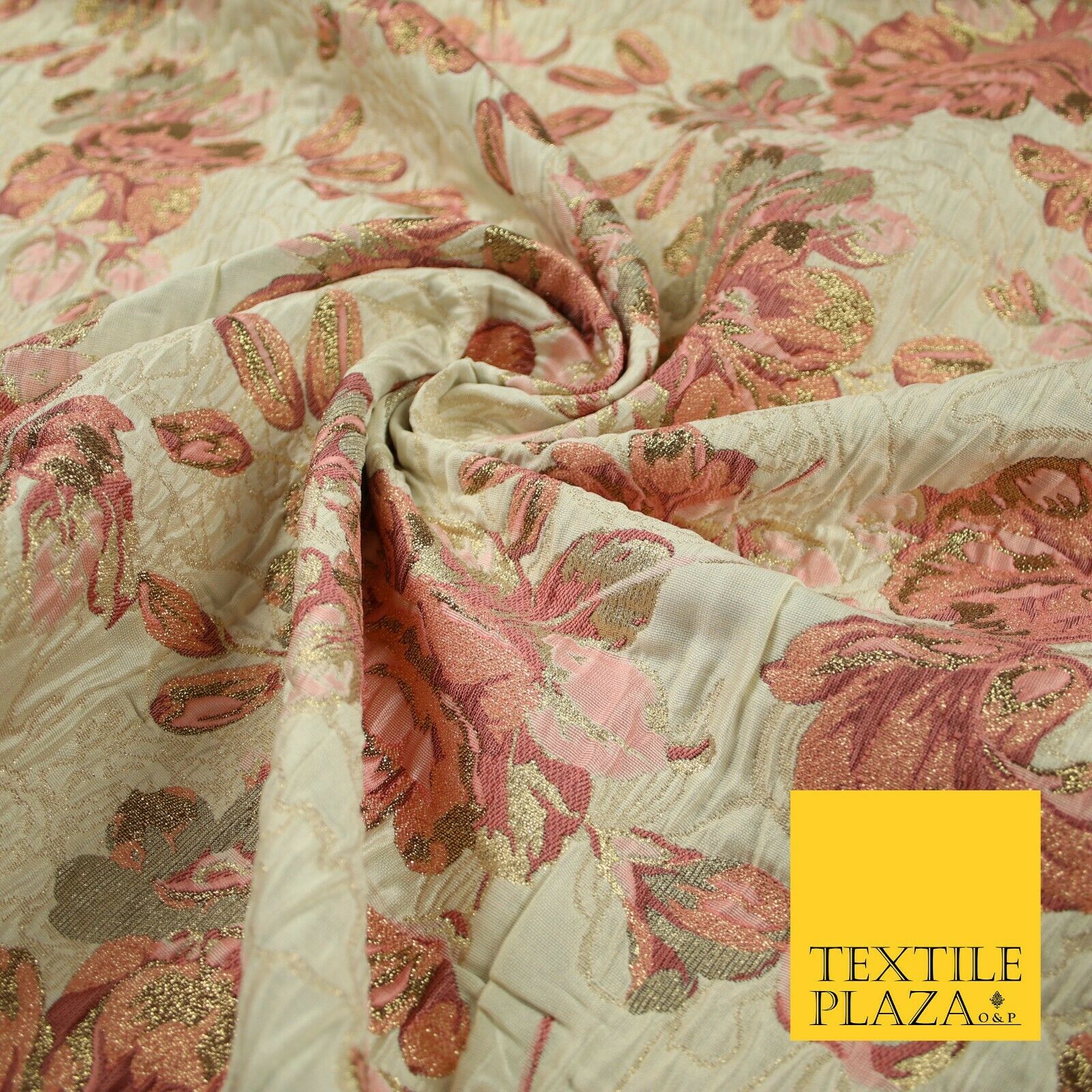 Cream Large Salmon Pink Flowers Creased Metallic Textured Brocade Fabric 7166