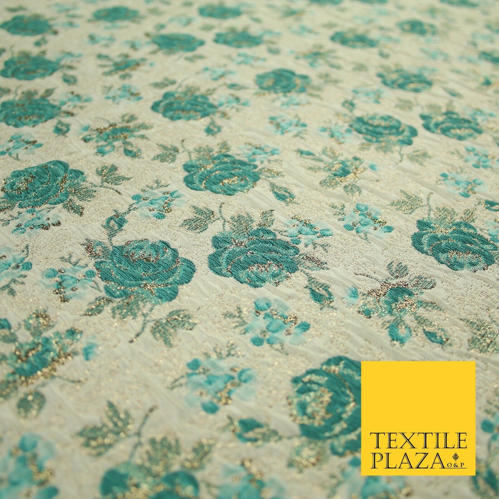 Cream Sea Green Rose Flowers Gold Metallic Speckle Textured Brocade Fabric 7163