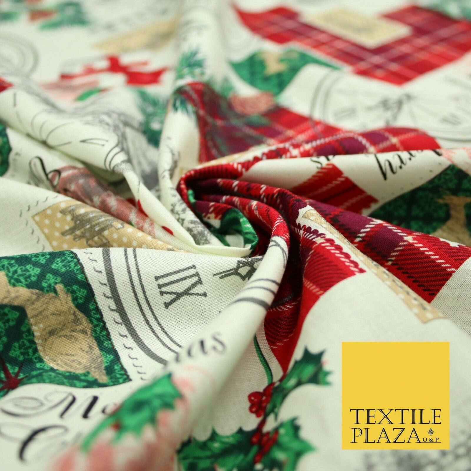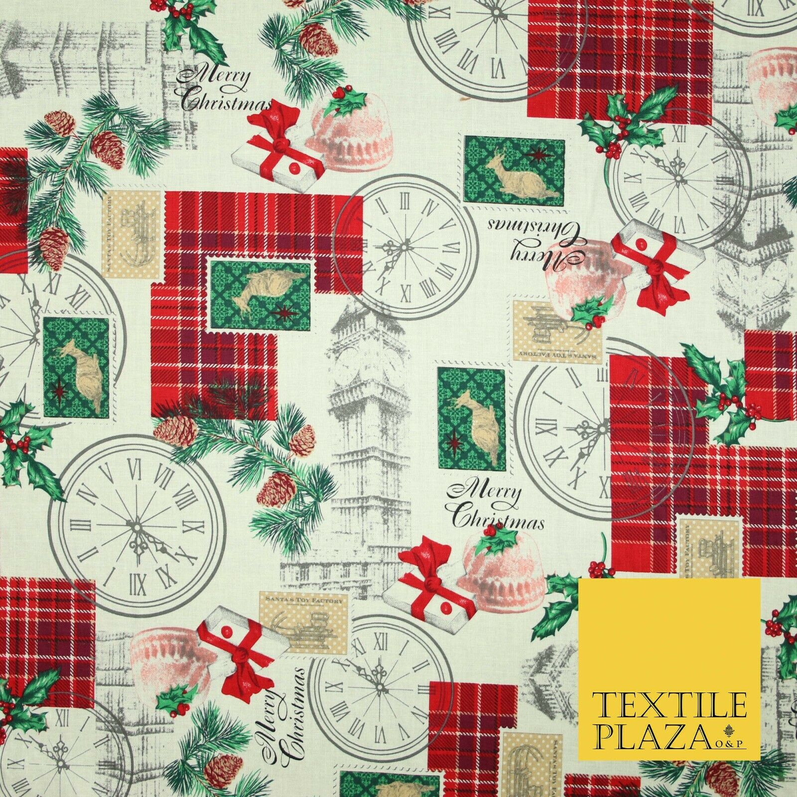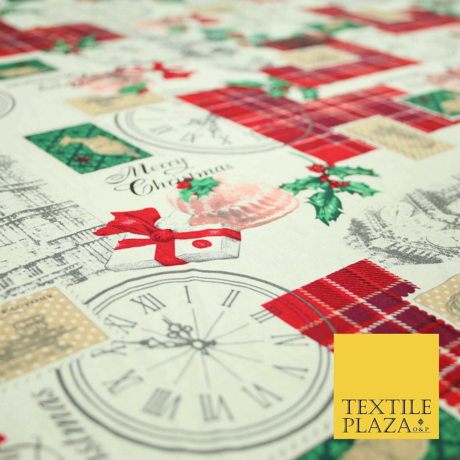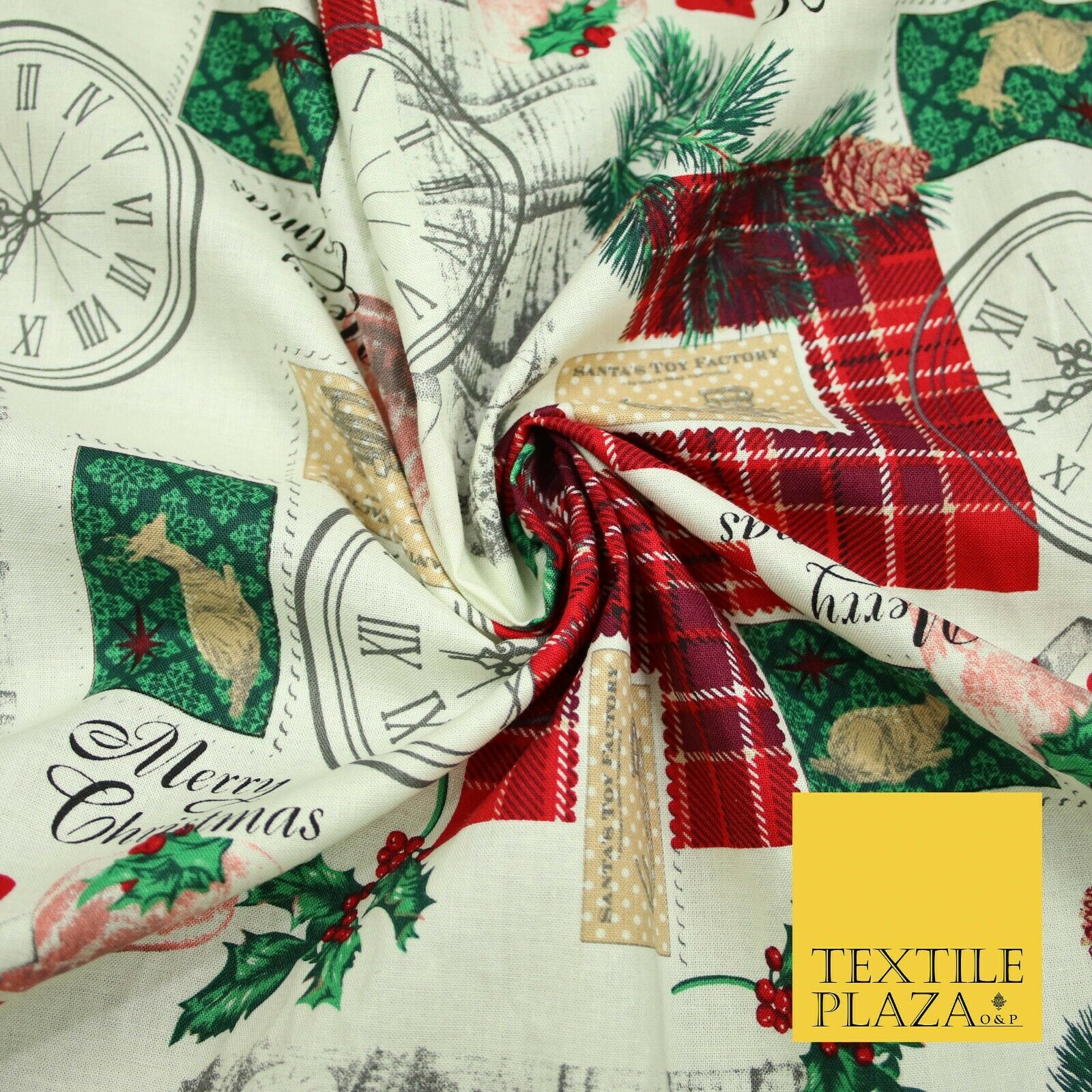 Cream Vintage Christmas Clock Conifer Tartan Check Patch 100% Cotton Fabric 5010