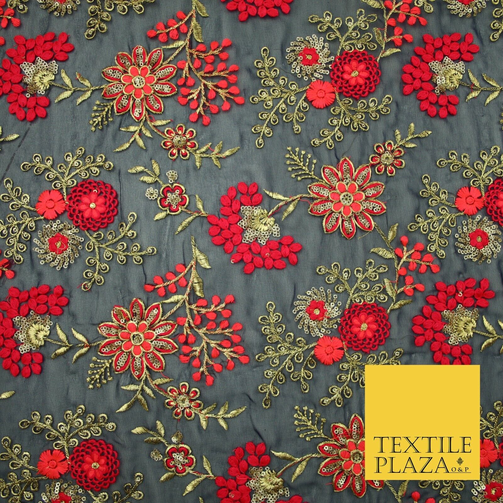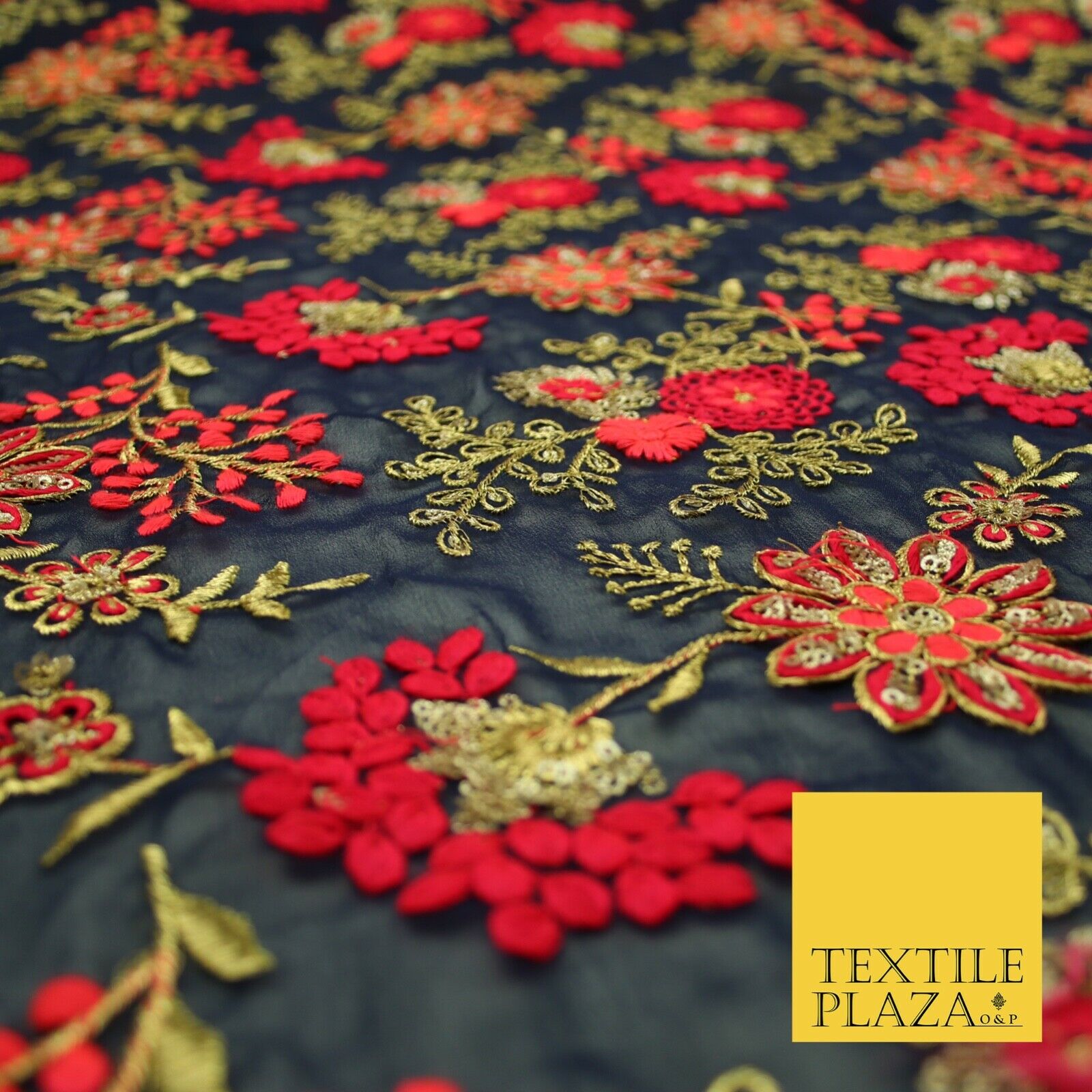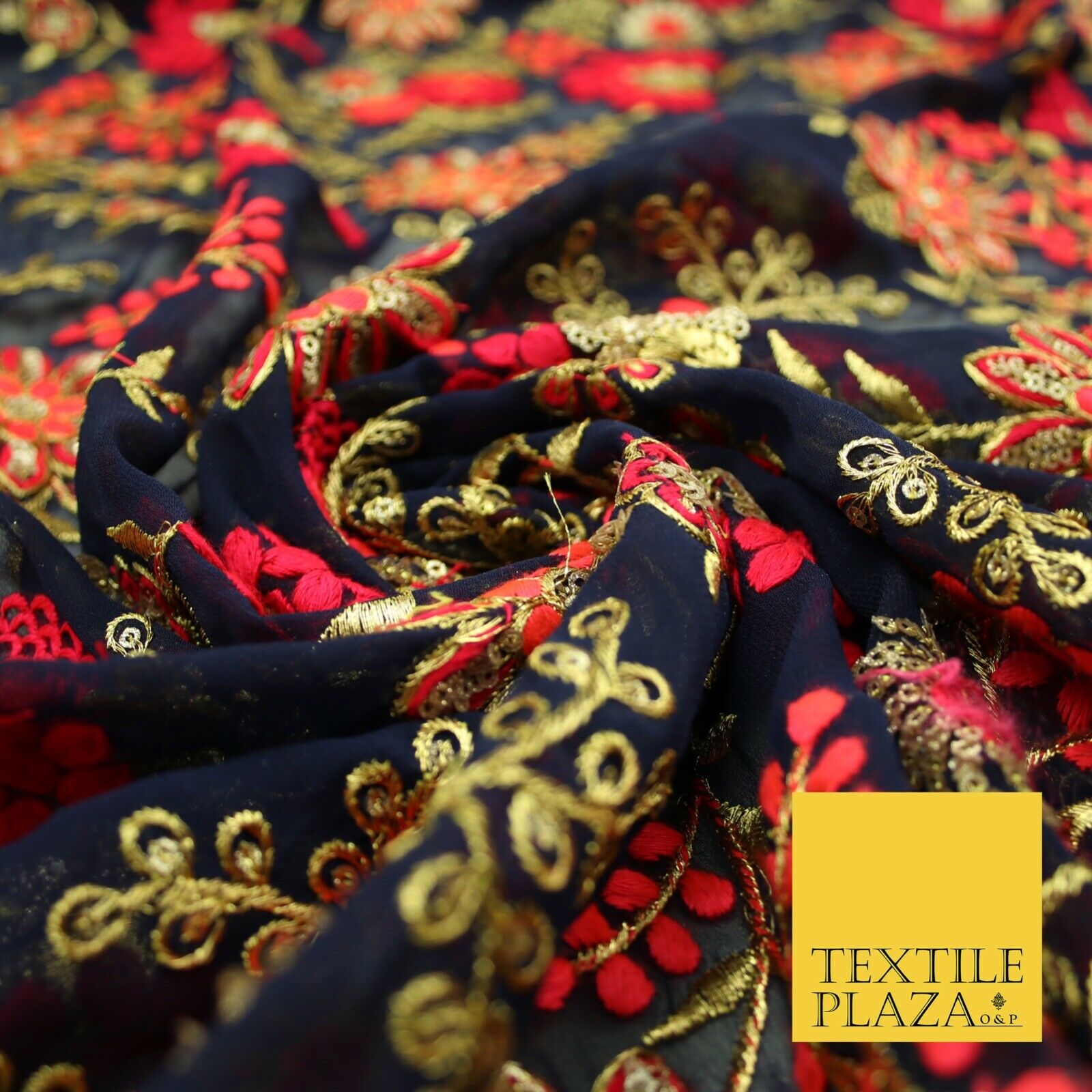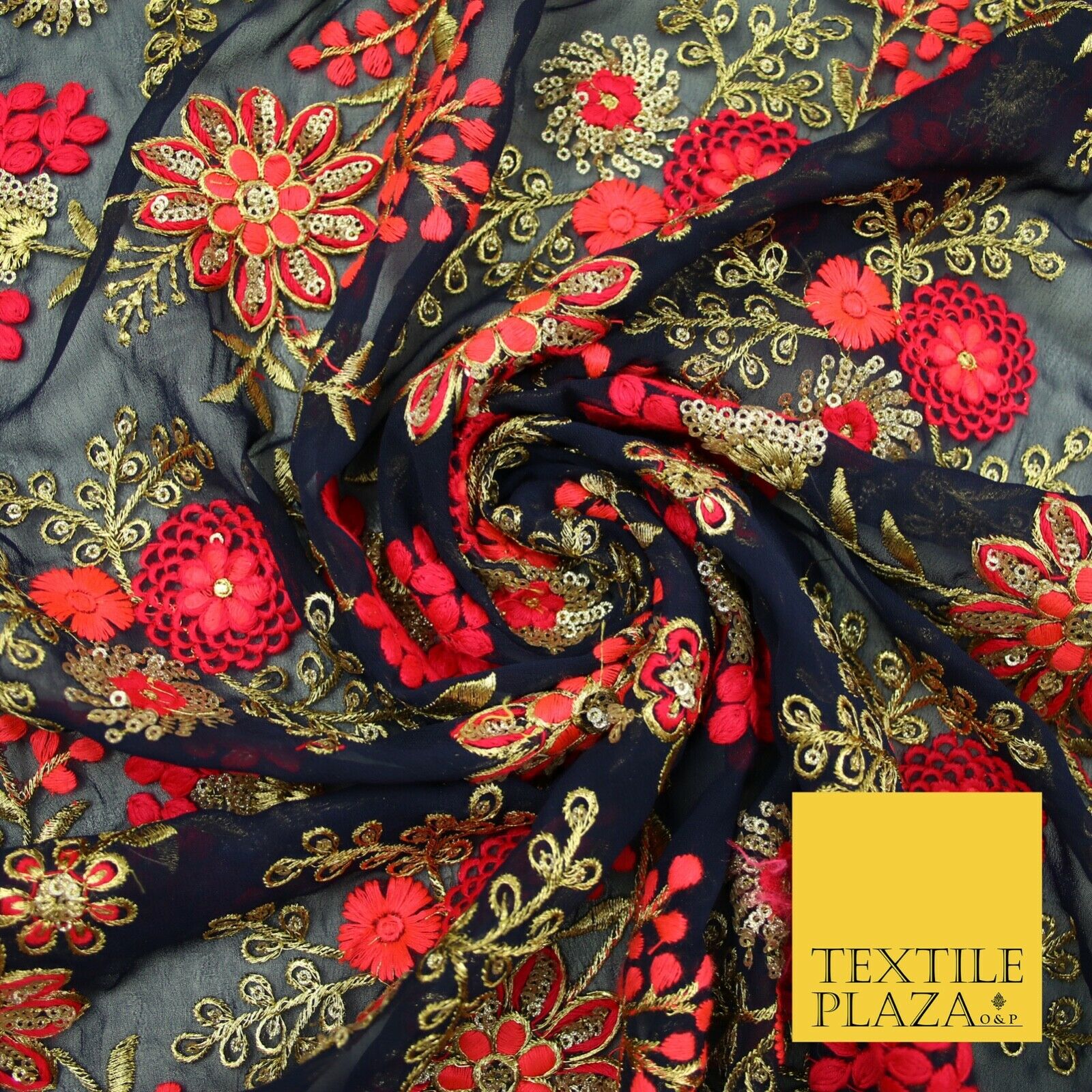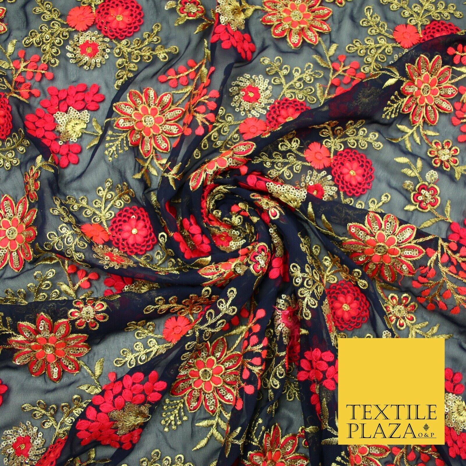 Dark Navy Blue Georgette with Cerise Pink Coral Floral Embroidery Fabric 2701
