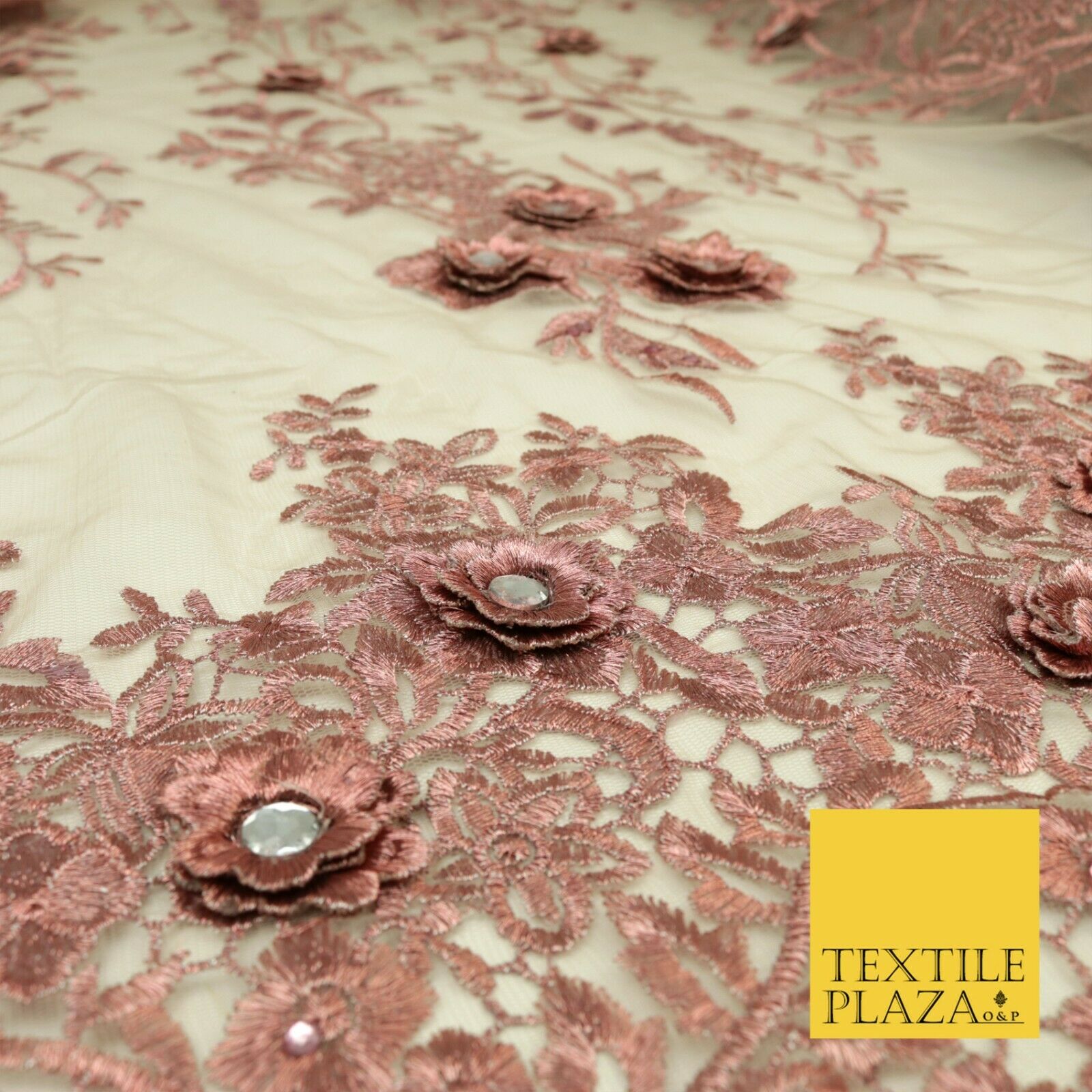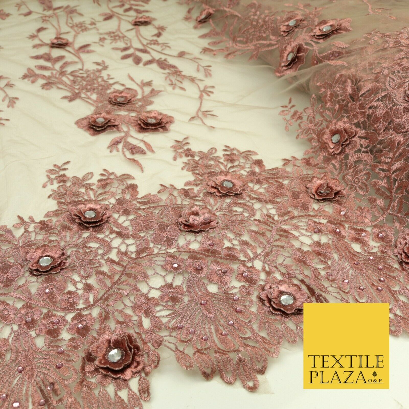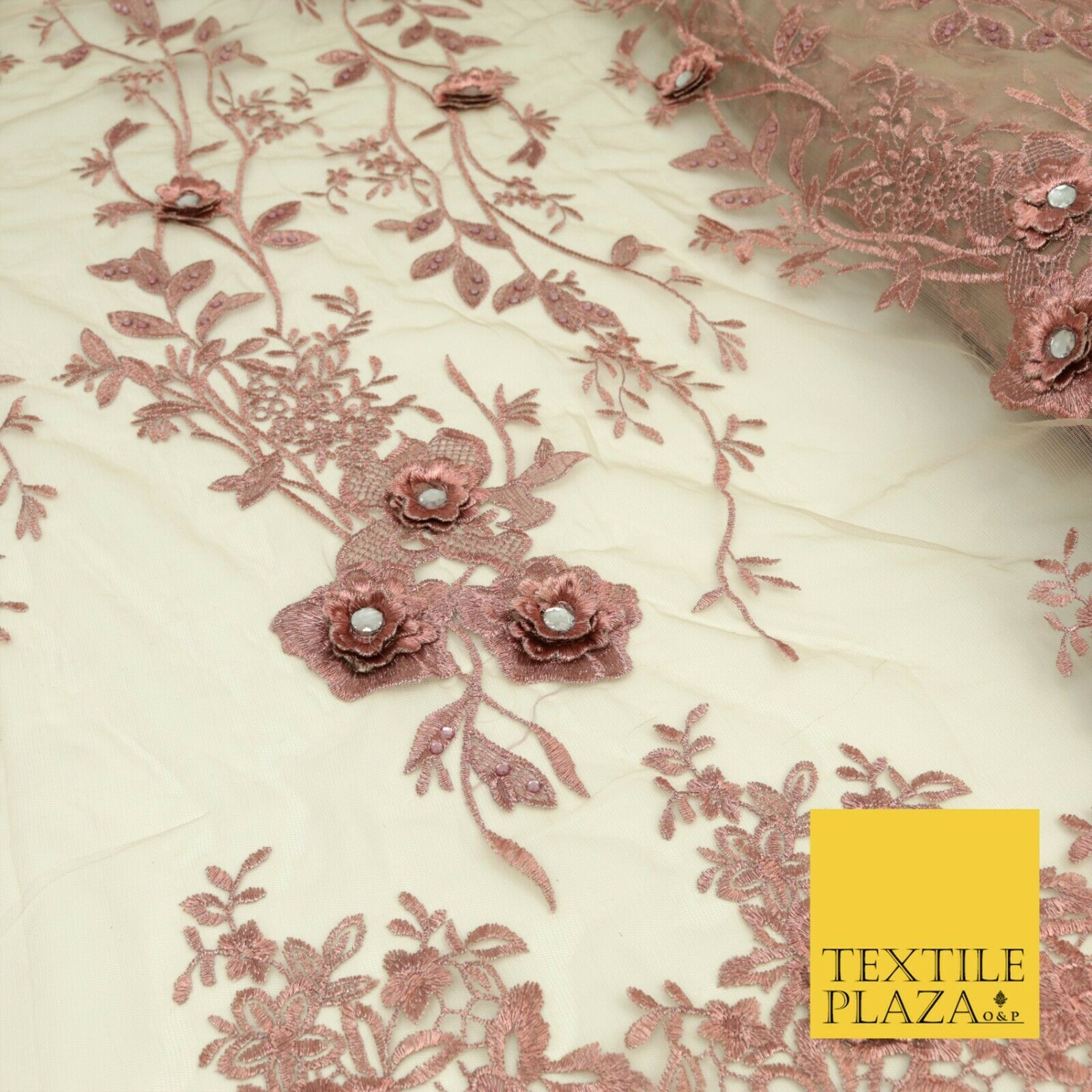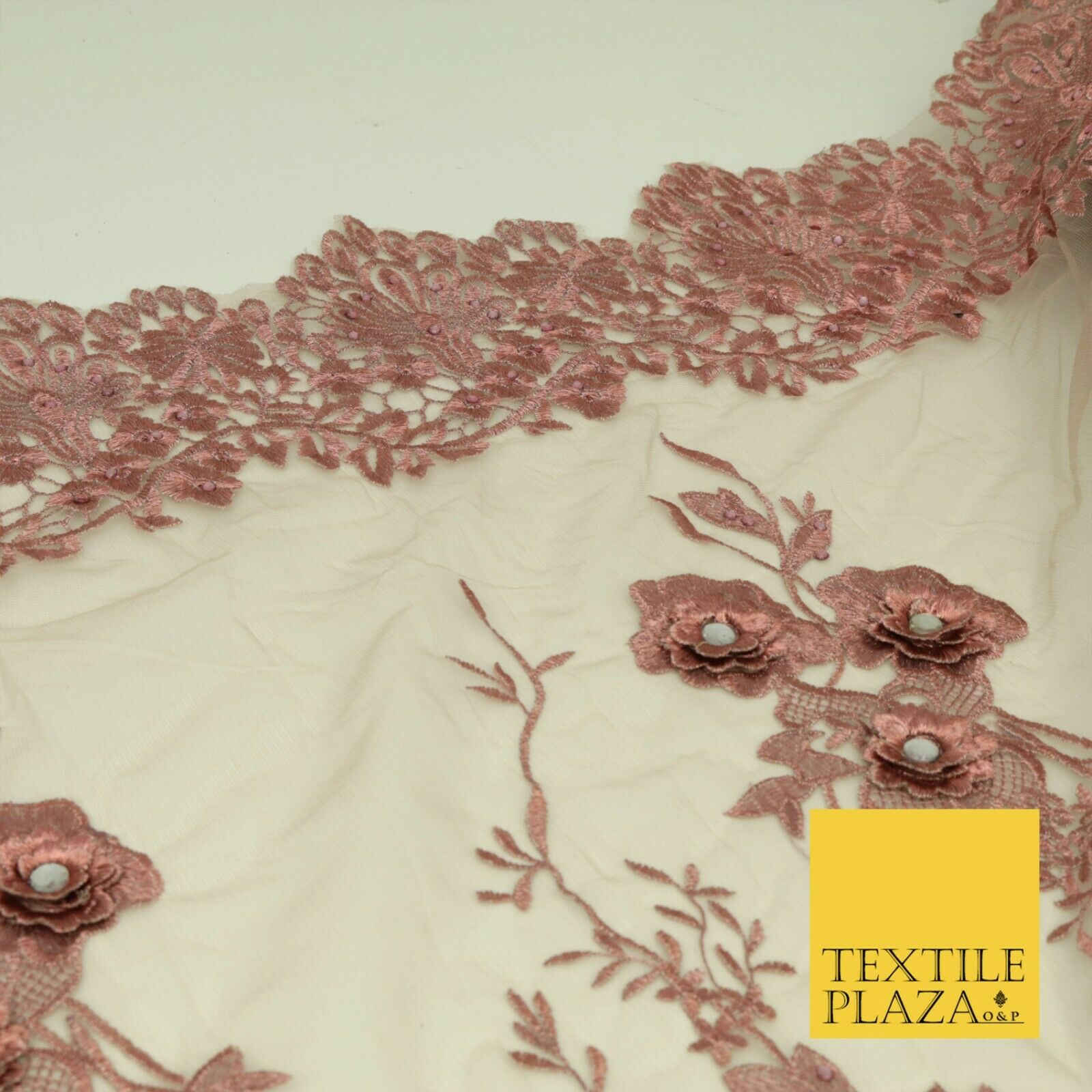 DUSTY PINK 3D Flower Trio Scalloped Embroidered Net Lace Dress Fancy Bridal 1582