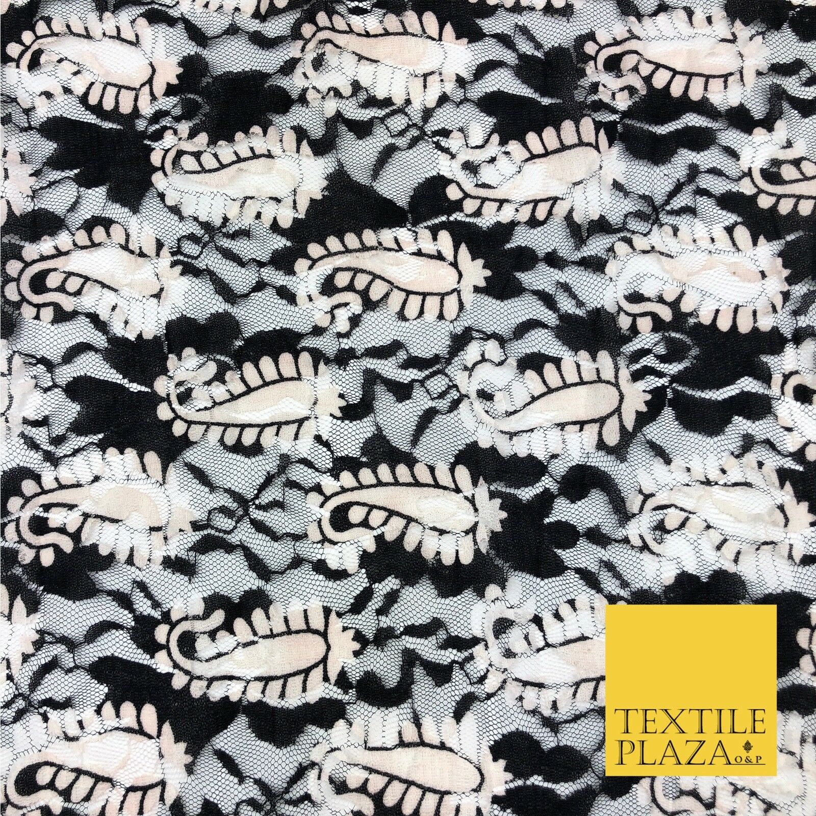 Fancy Paisley Webbed Black White Ivory Net Lace Fabric Trendy Dress 45" GE811