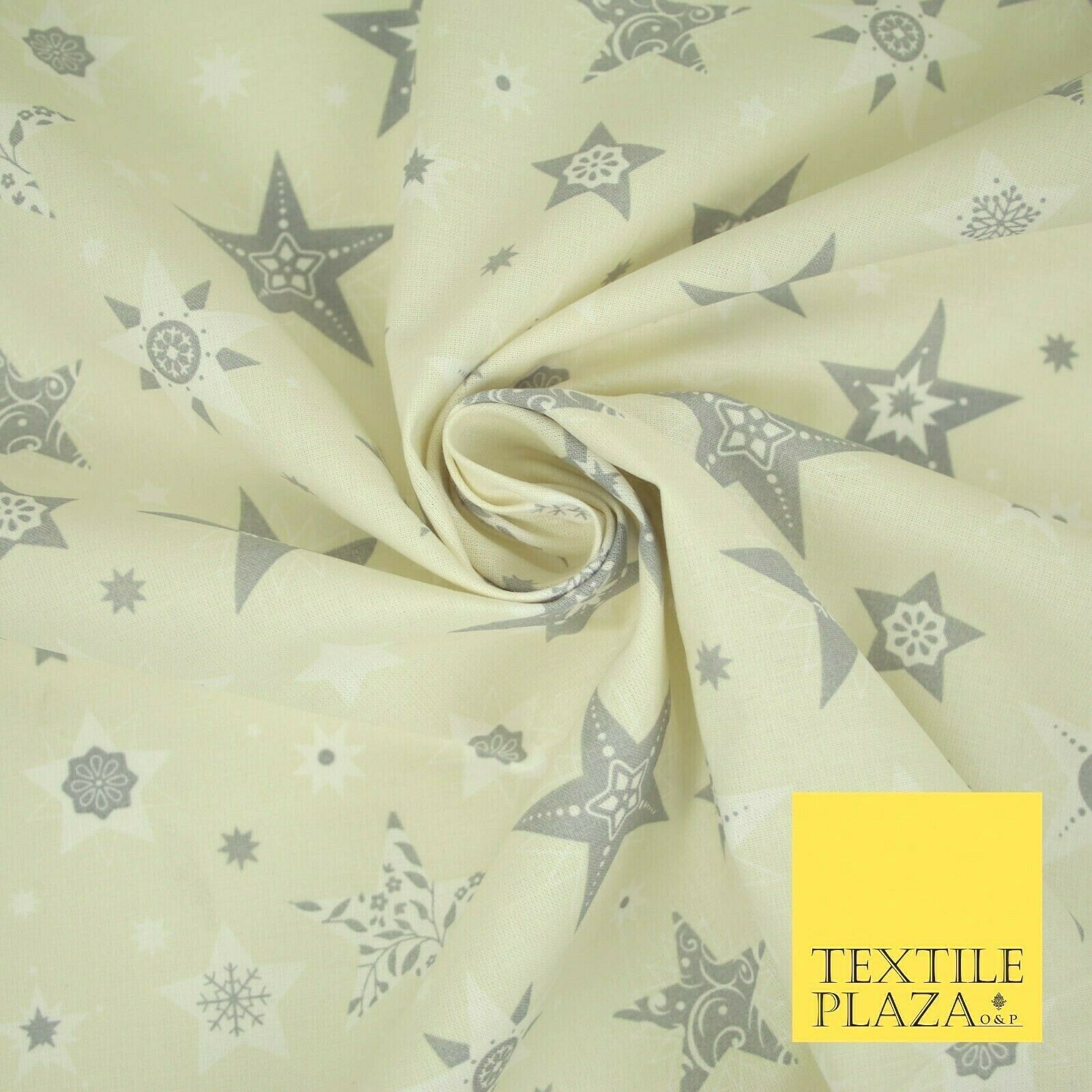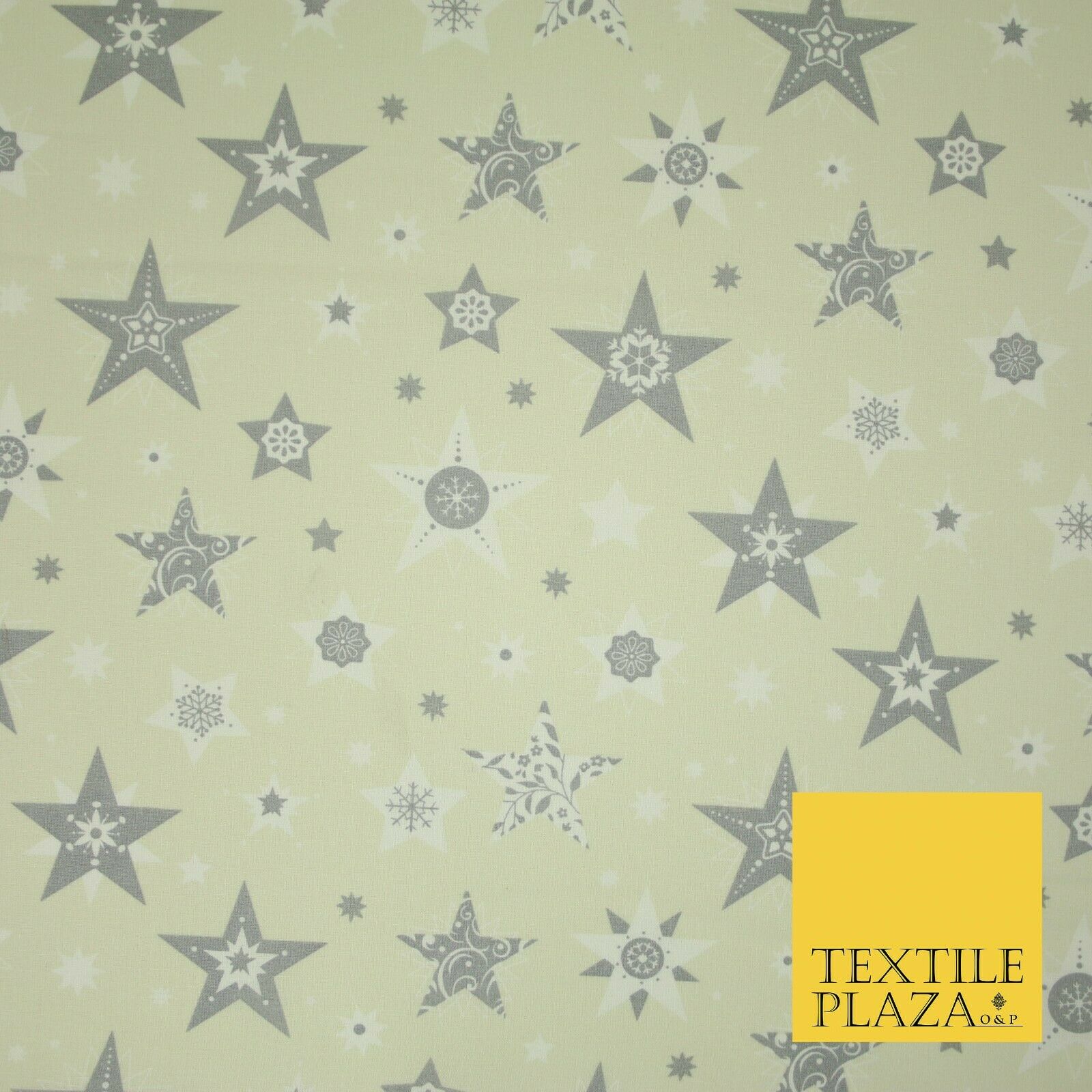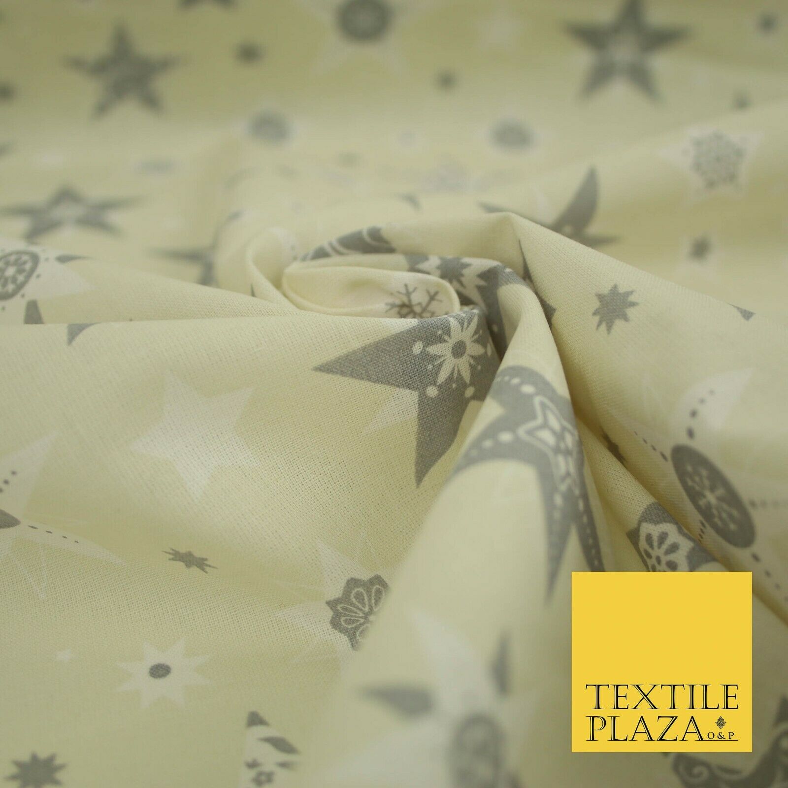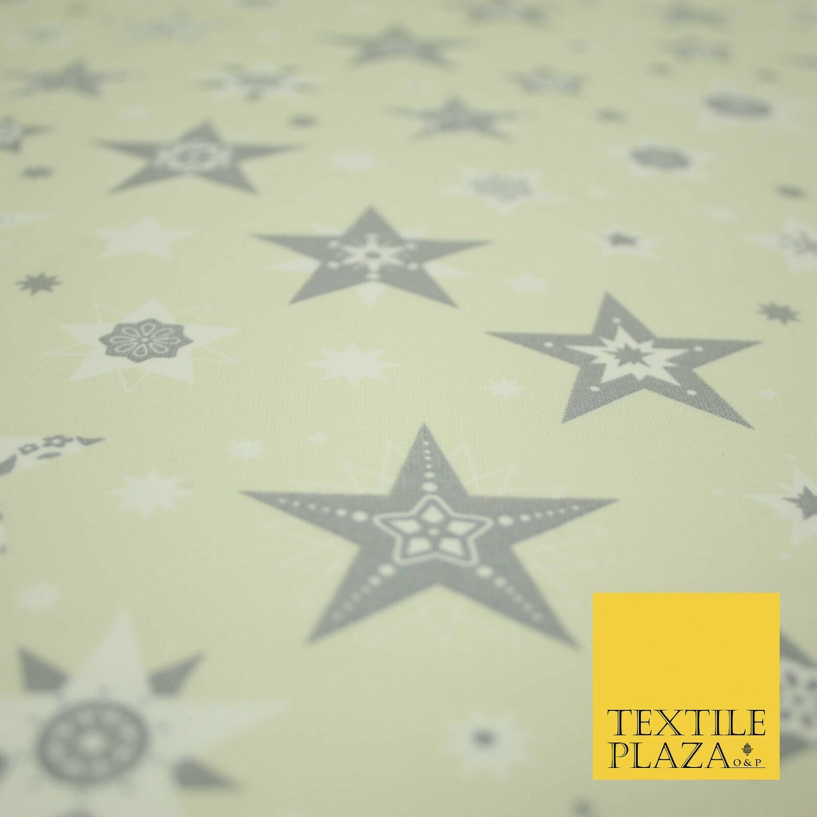 Festive Christmas Grey Multi Stars Snowflakes Printed 100% Cotton Fabric 56"
