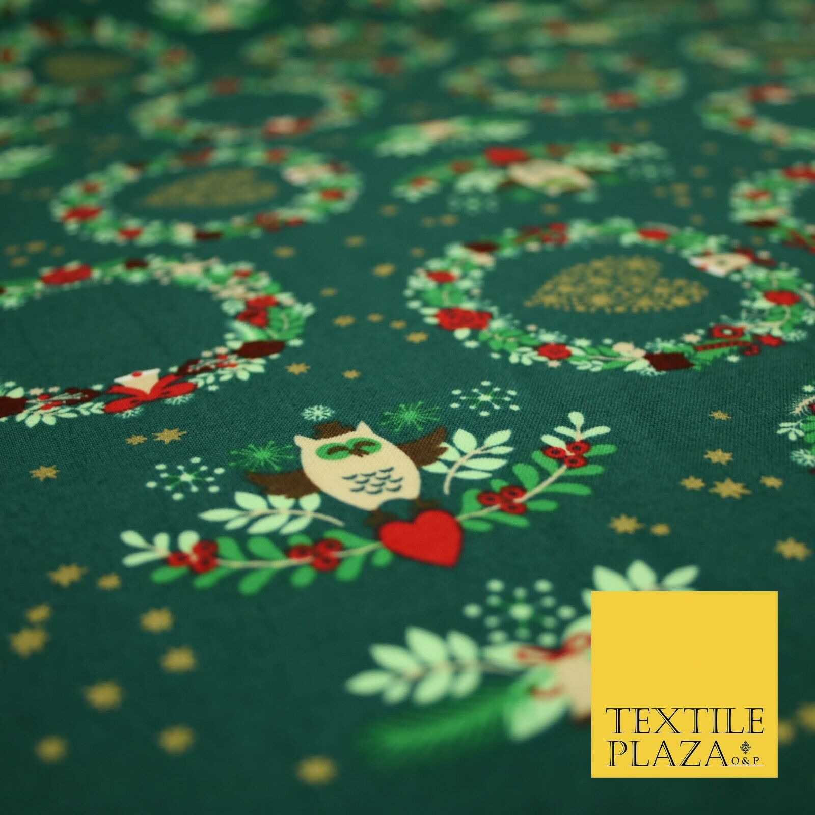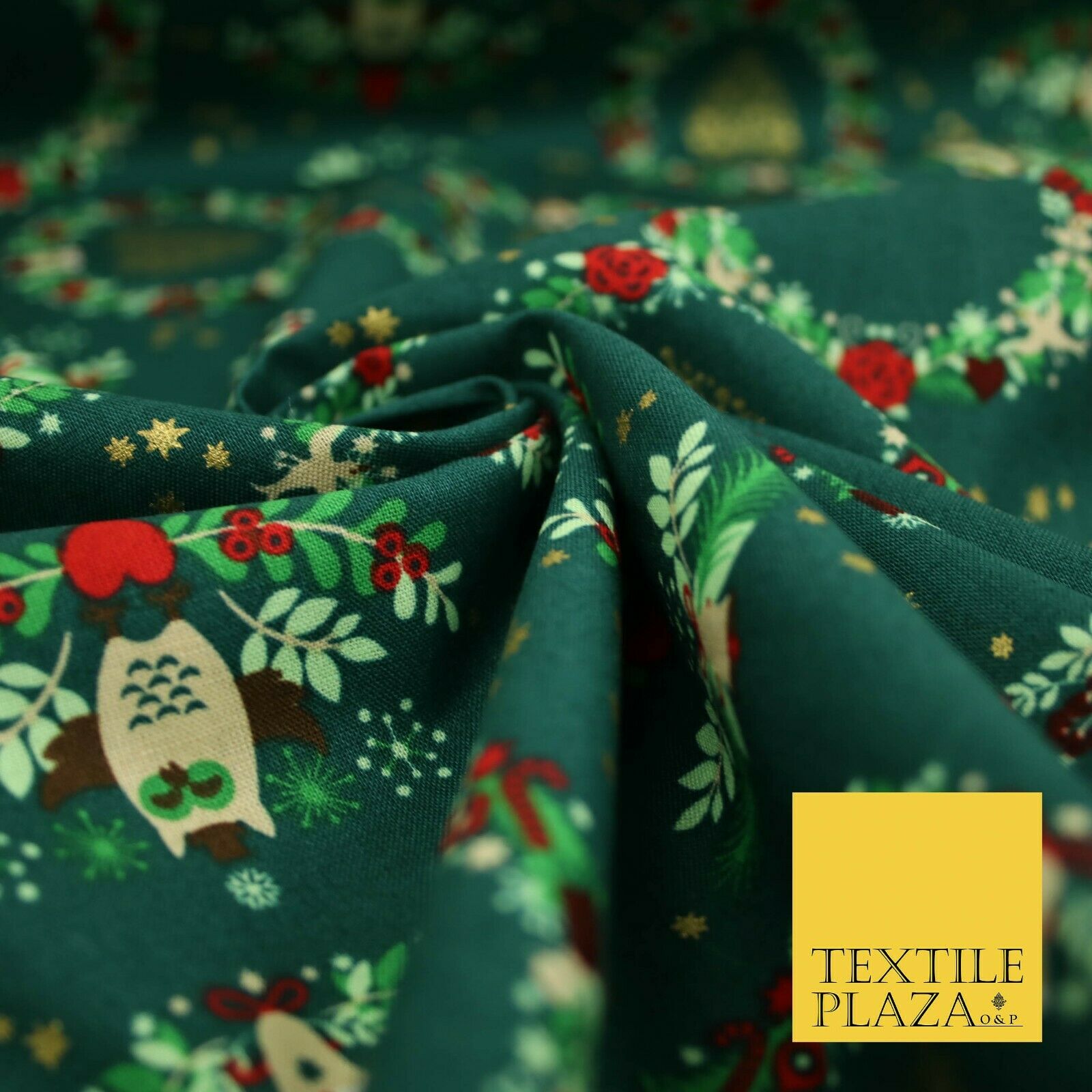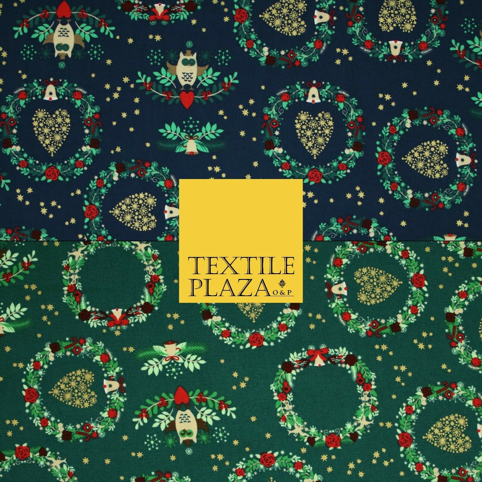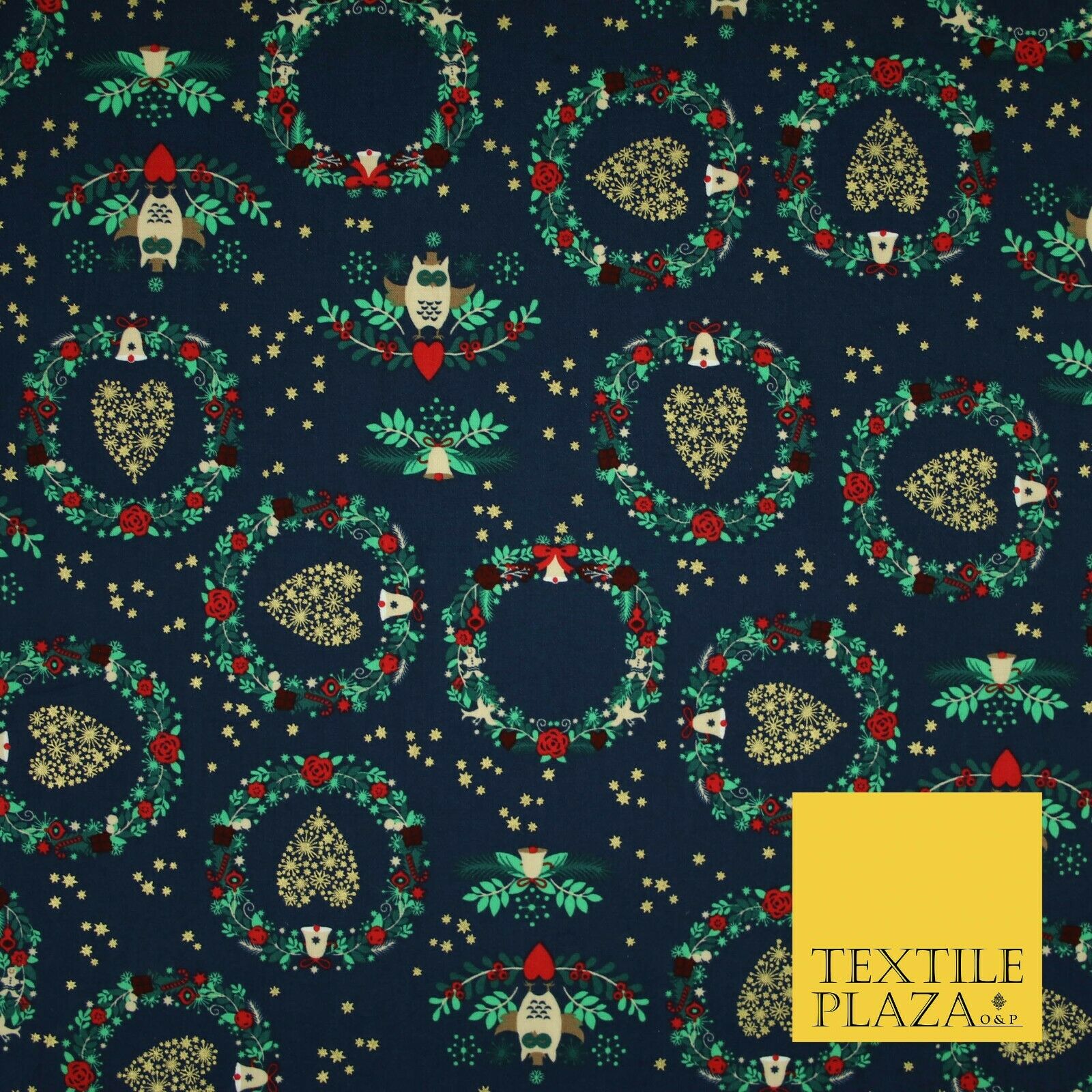 Festive Christmas Love Heart Wreath Owls Stars Printed 100% Cotton Fabric 54"