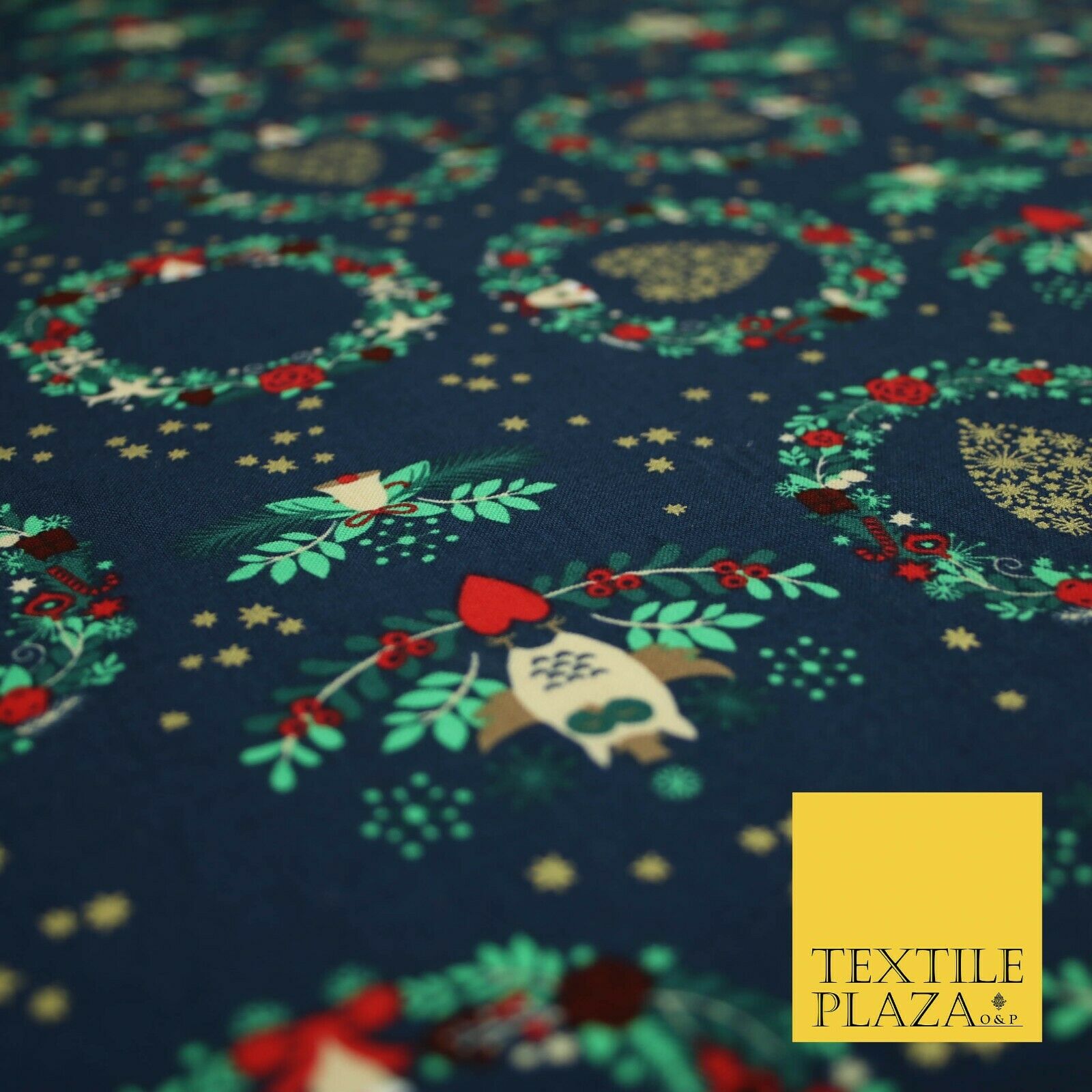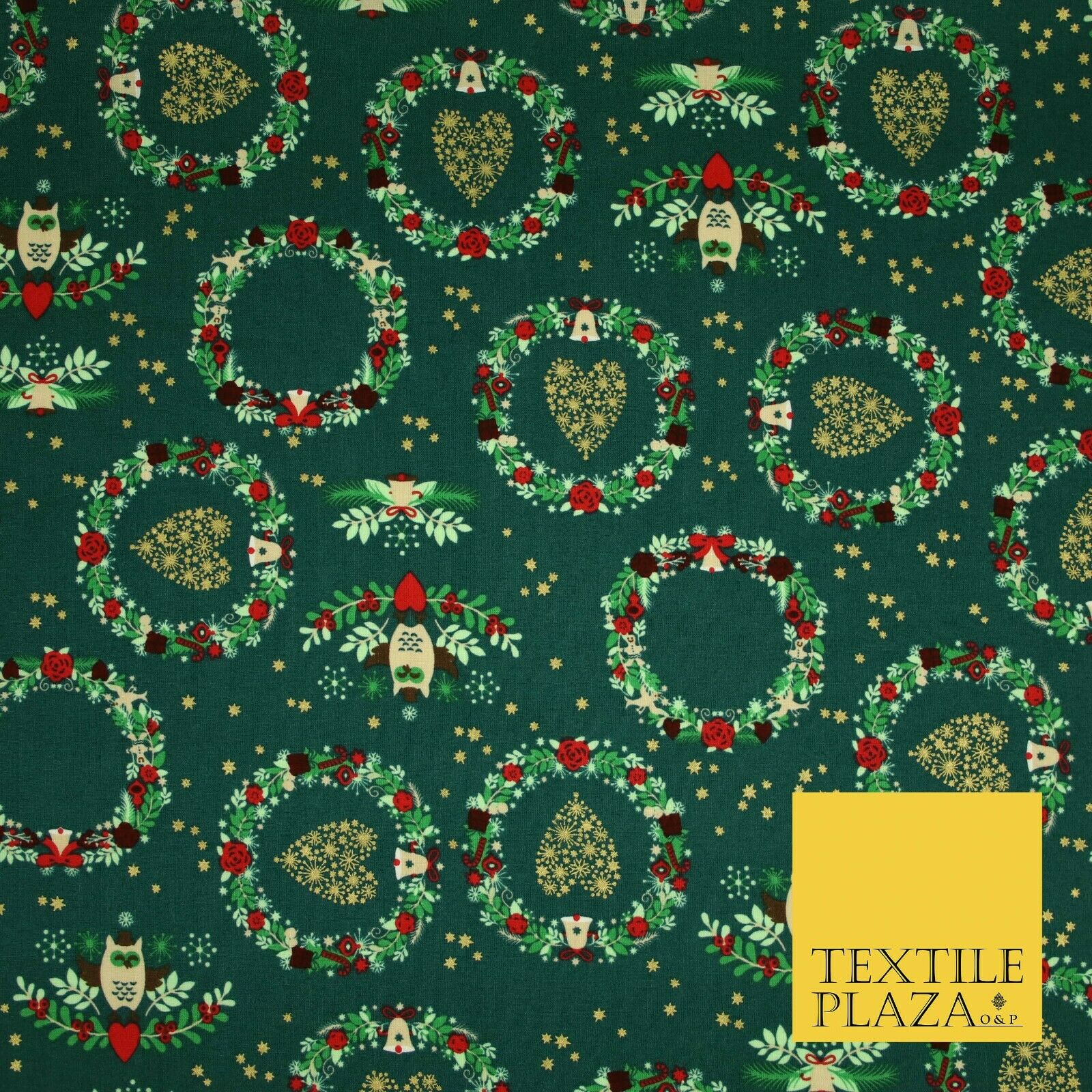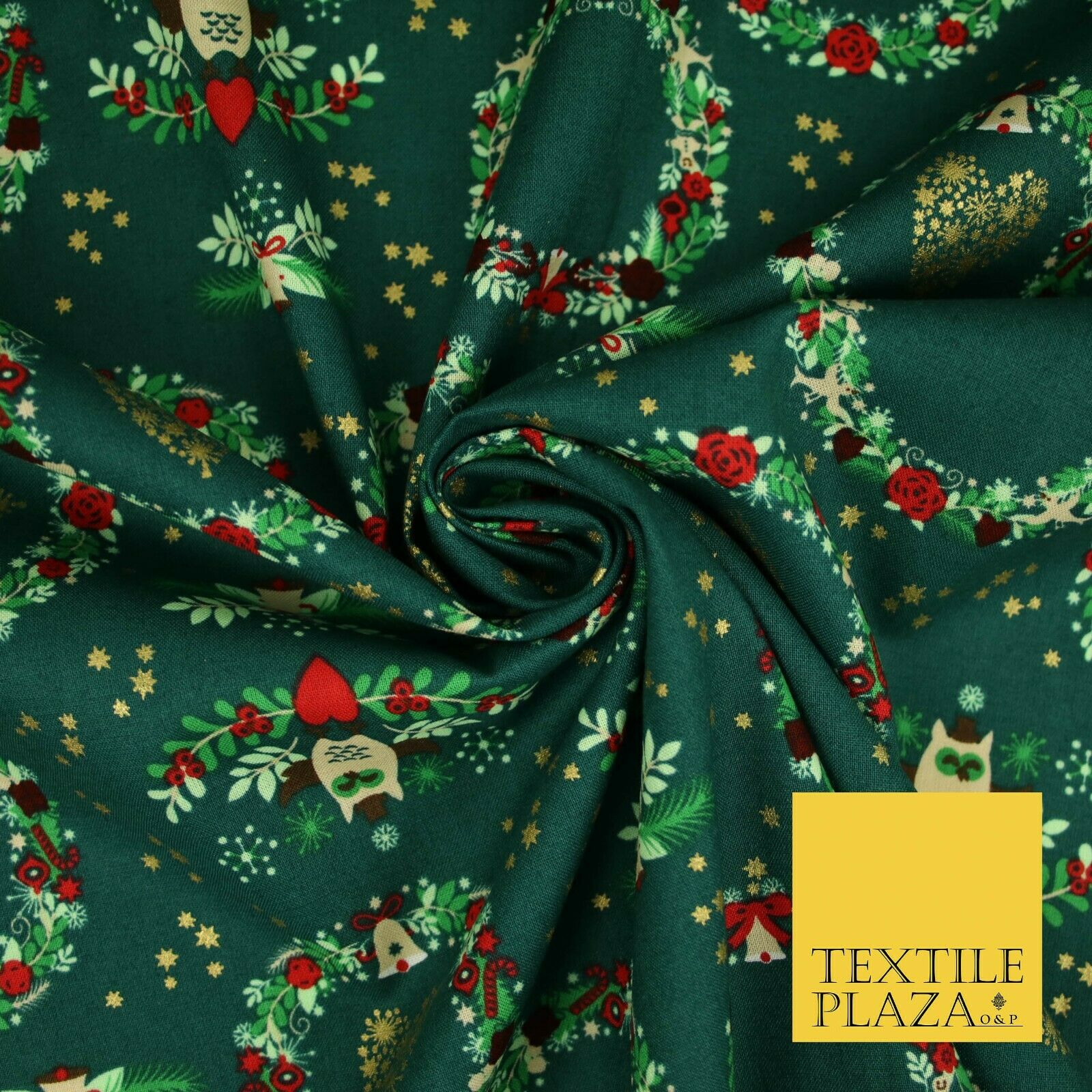 Festive Christmas Love Heart Wreath Owls Stars Printed 100% Cotton Fabric 54"