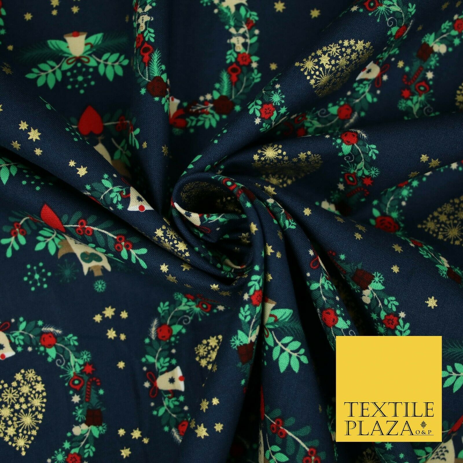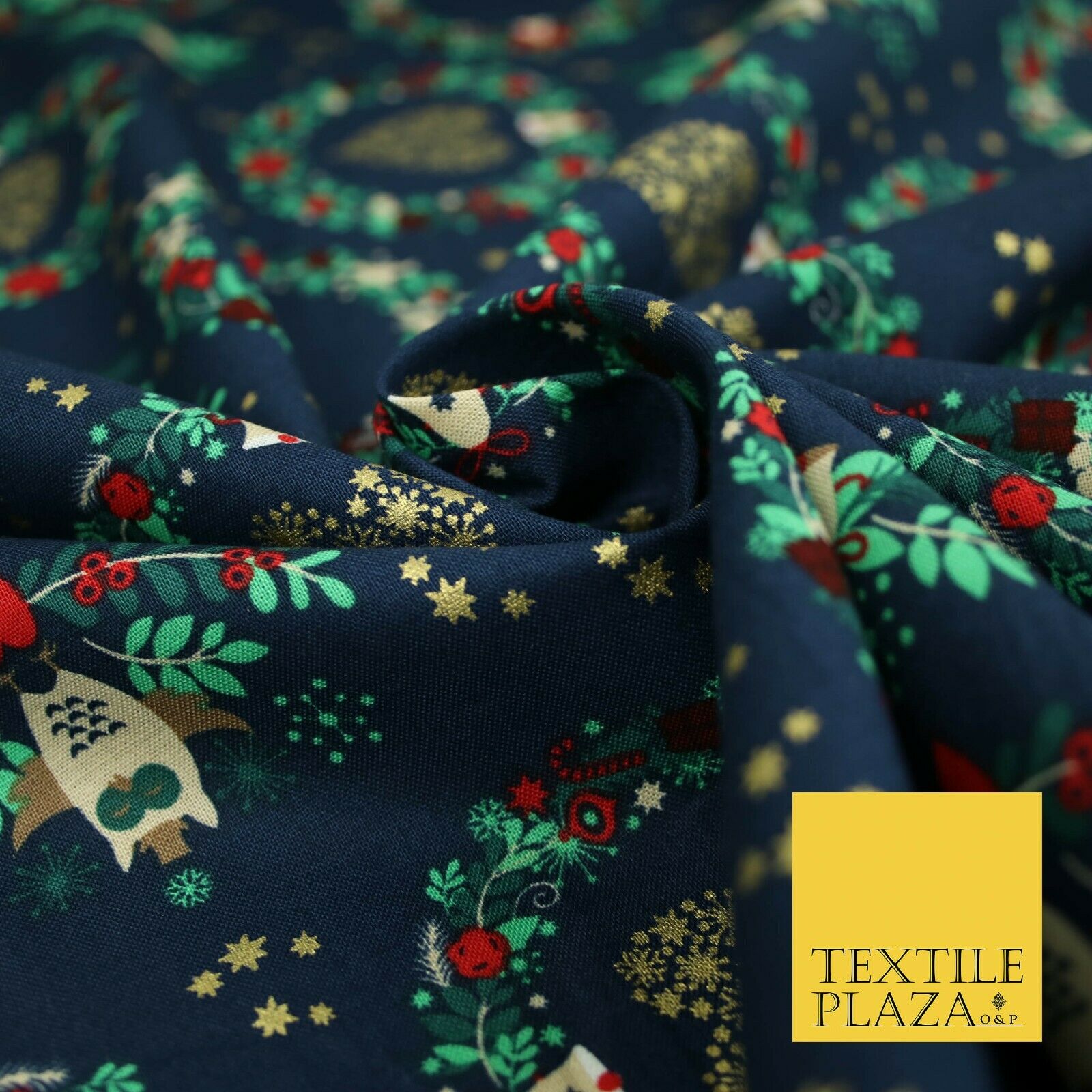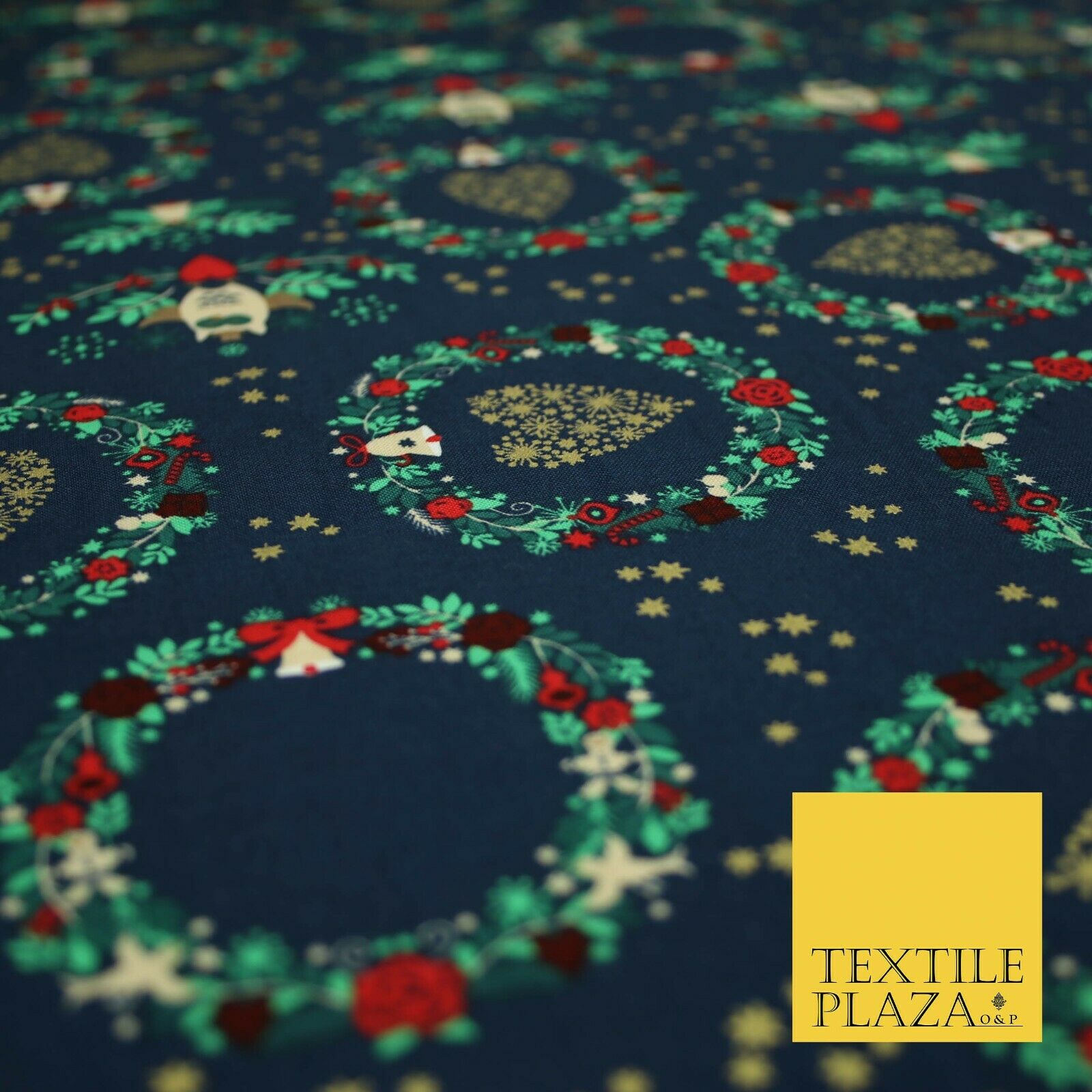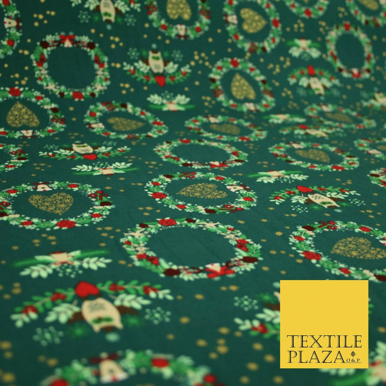 Festive Christmas Love Heart Wreath Owls Stars Printed 100% Cotton Fabric 54"