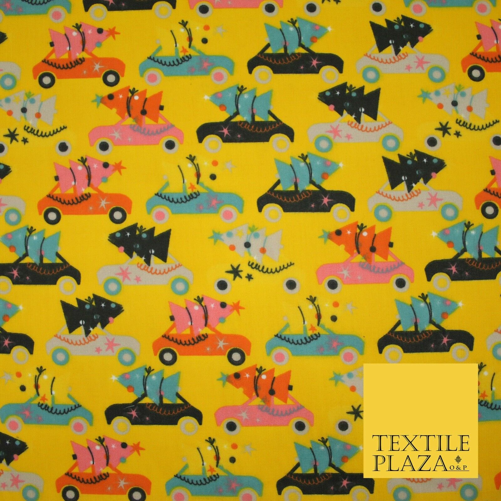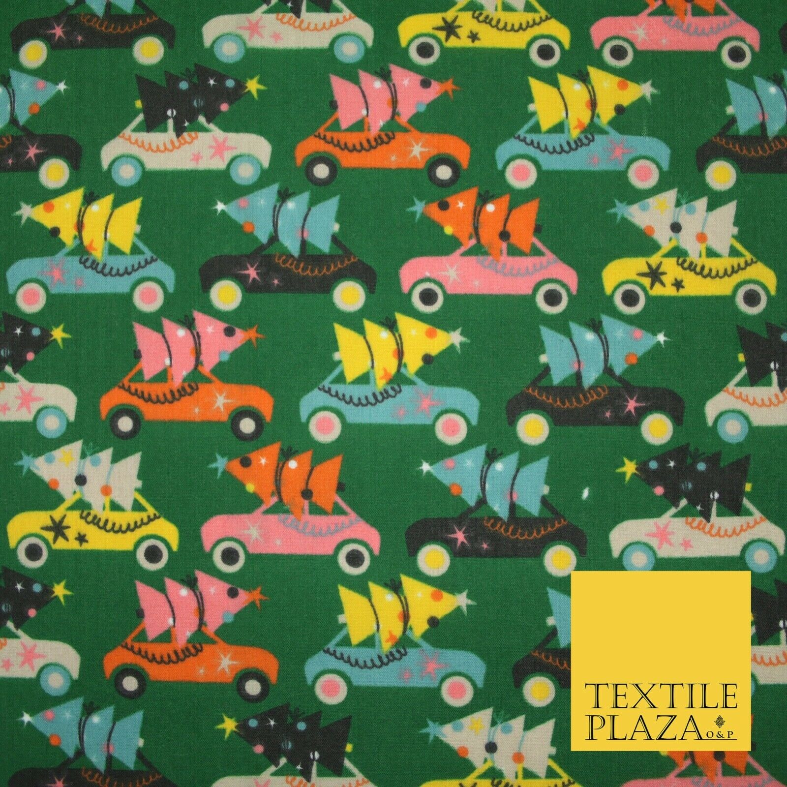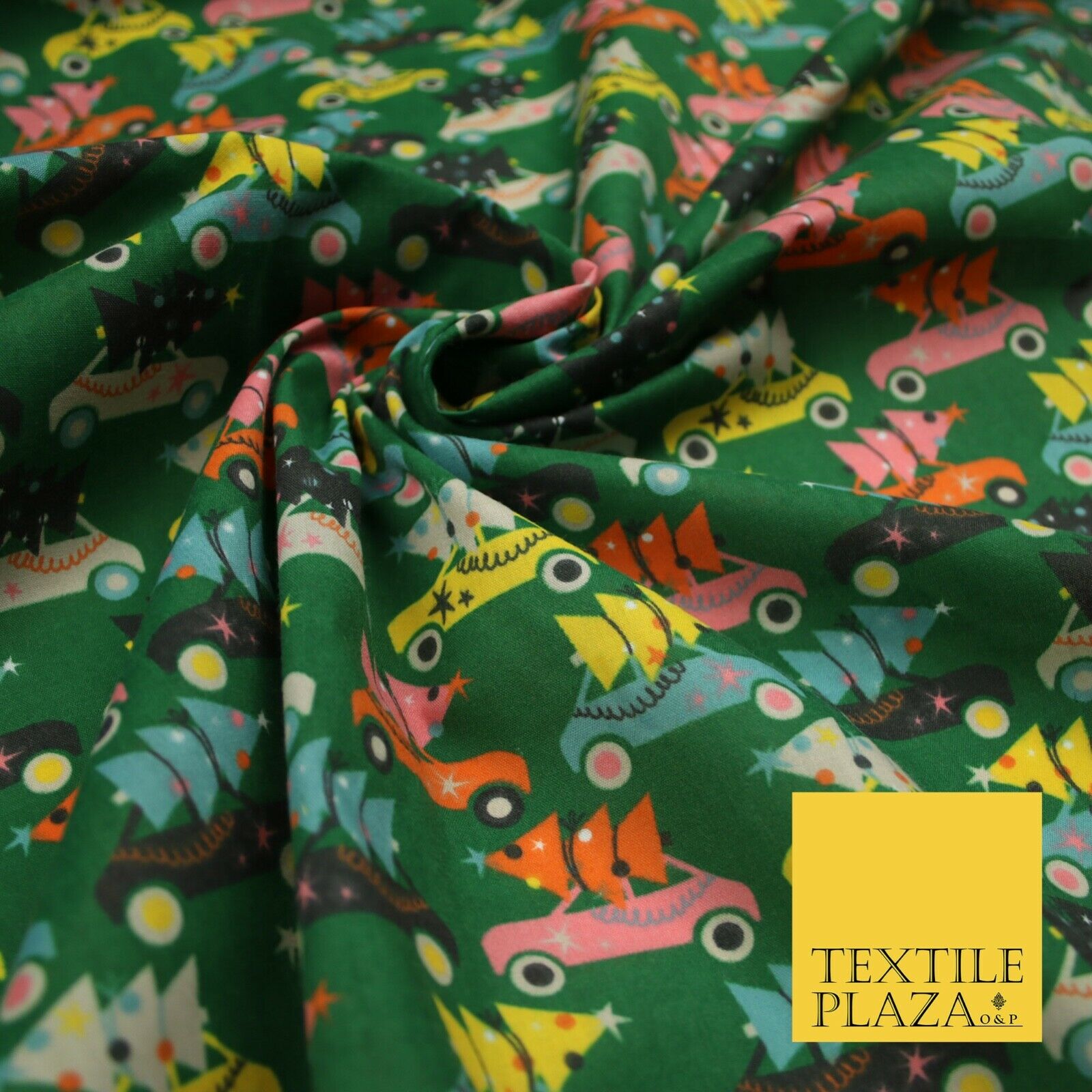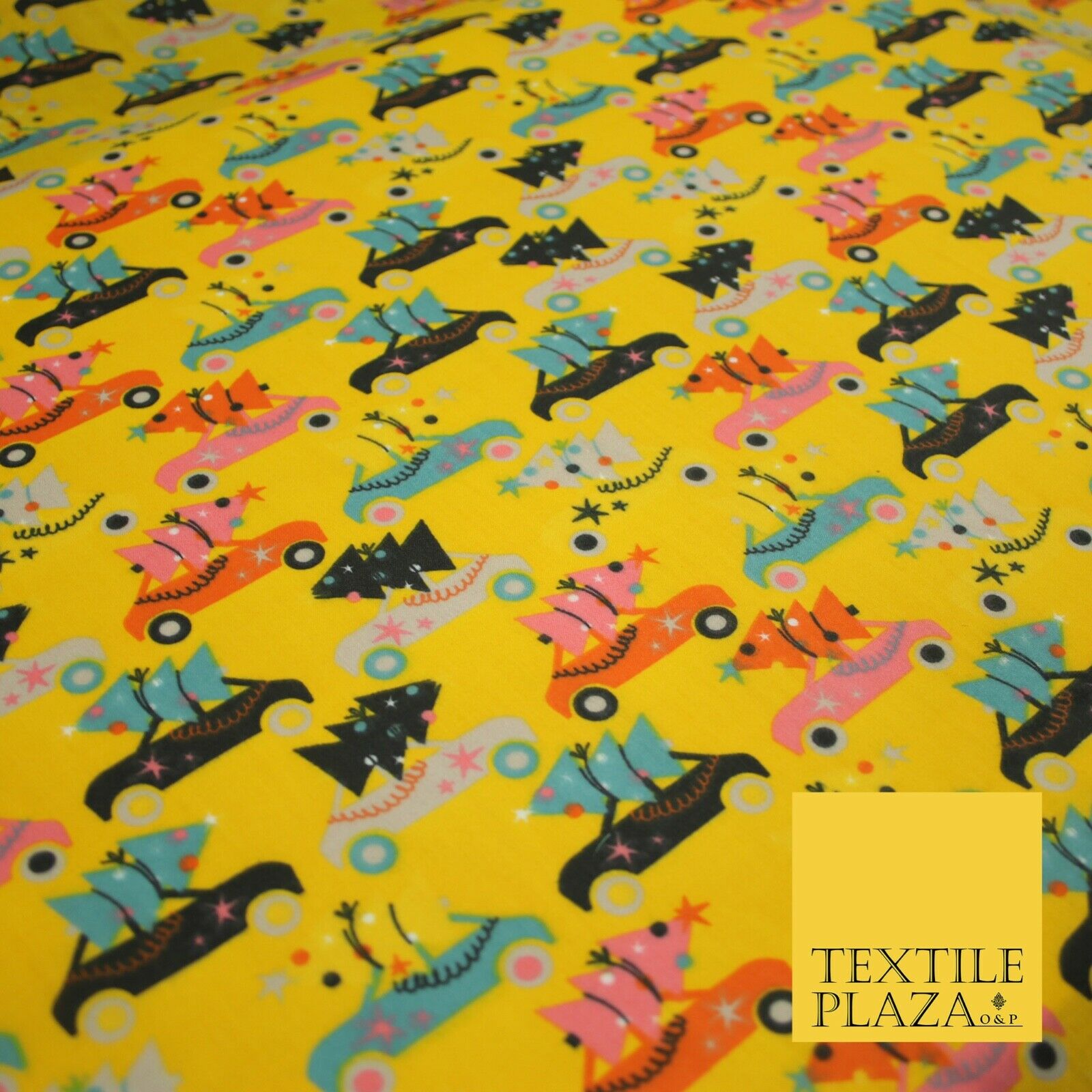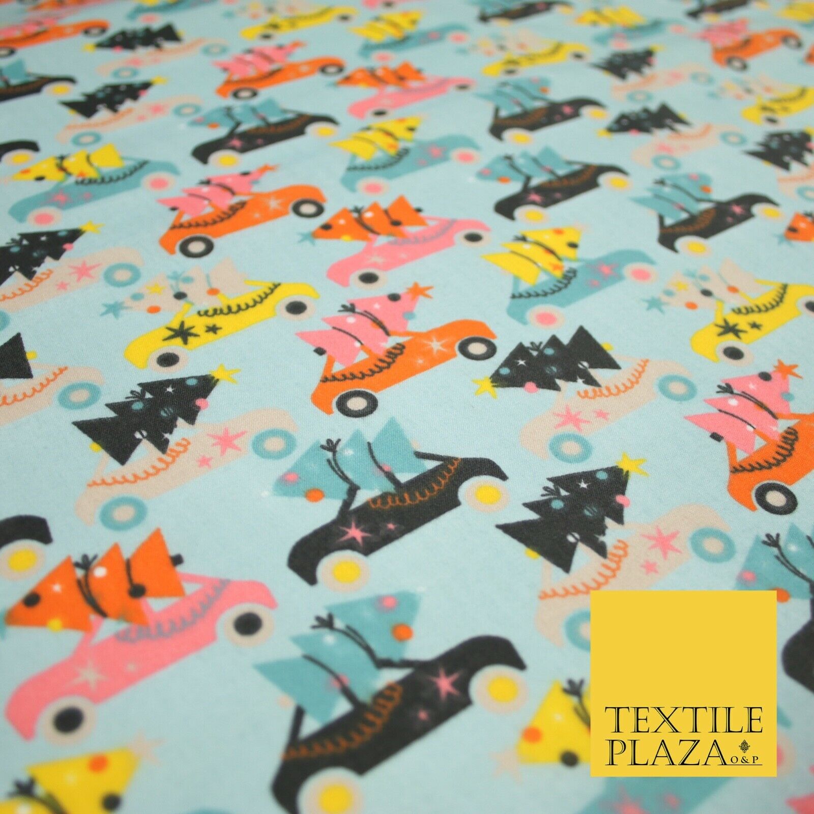 Festive Driving Car Christmas Trees Printed Poly Cotton Fabric Polycotton 45"