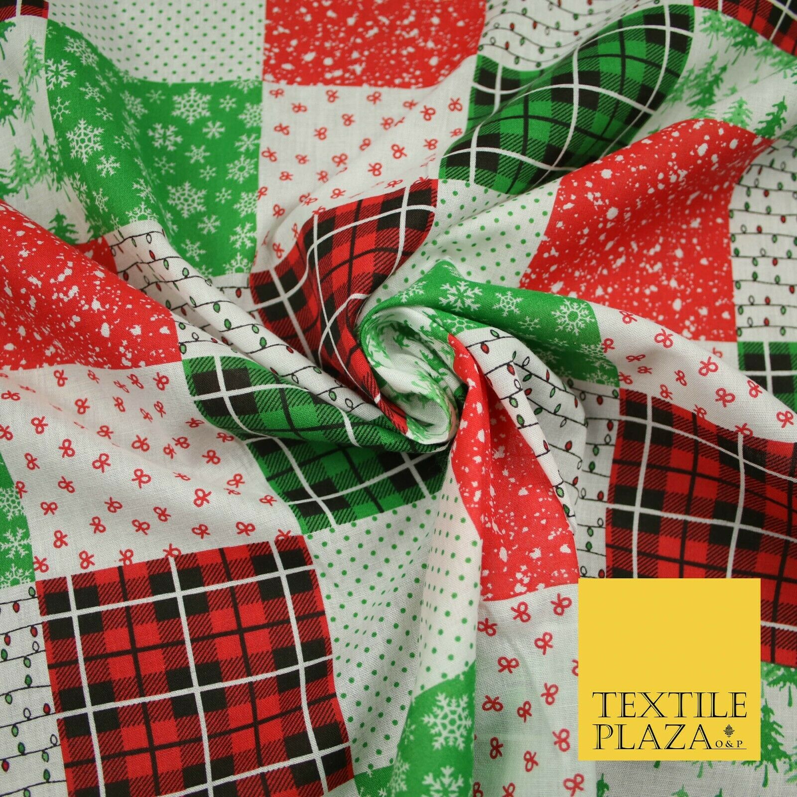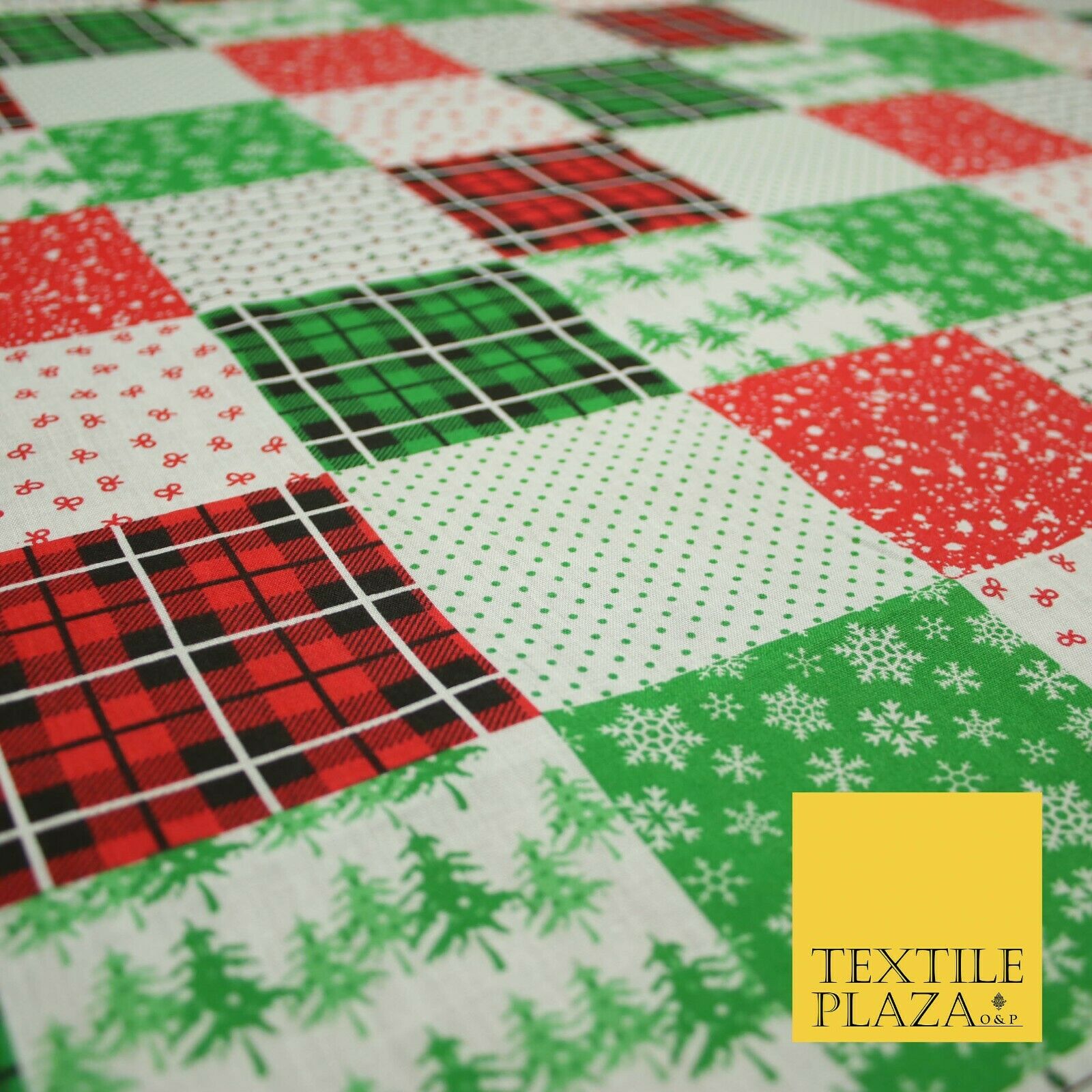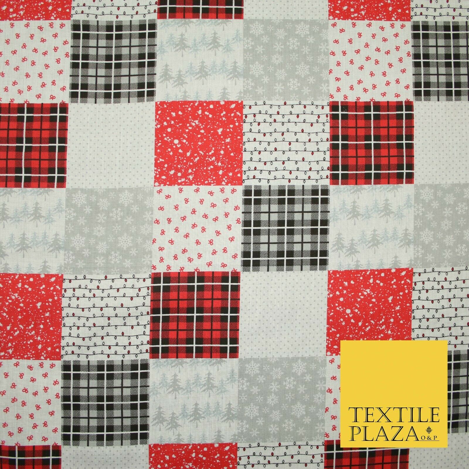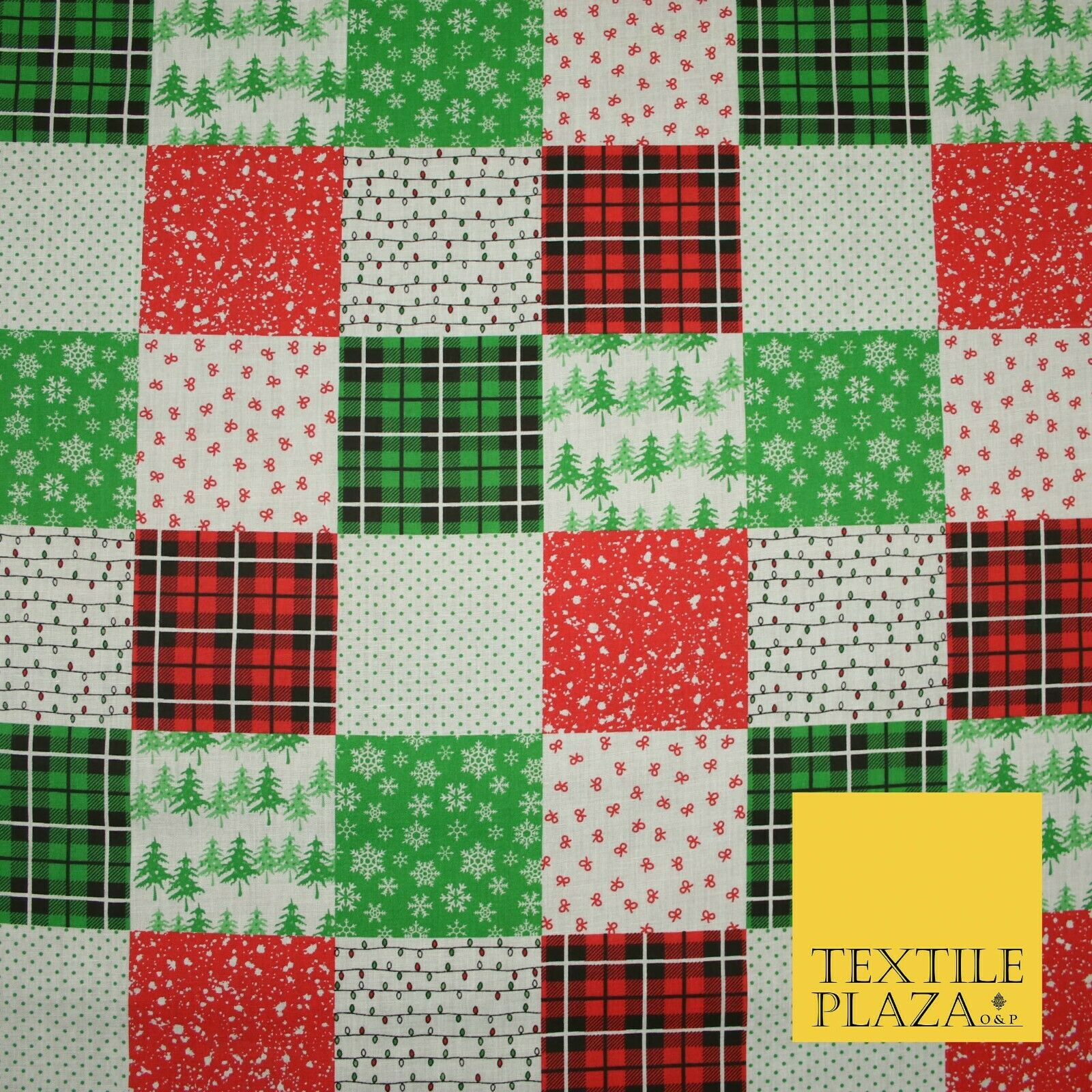 Festive Patchwork Christmas Trees Bows Snowflake Tartan Polycotton Fabric 44"